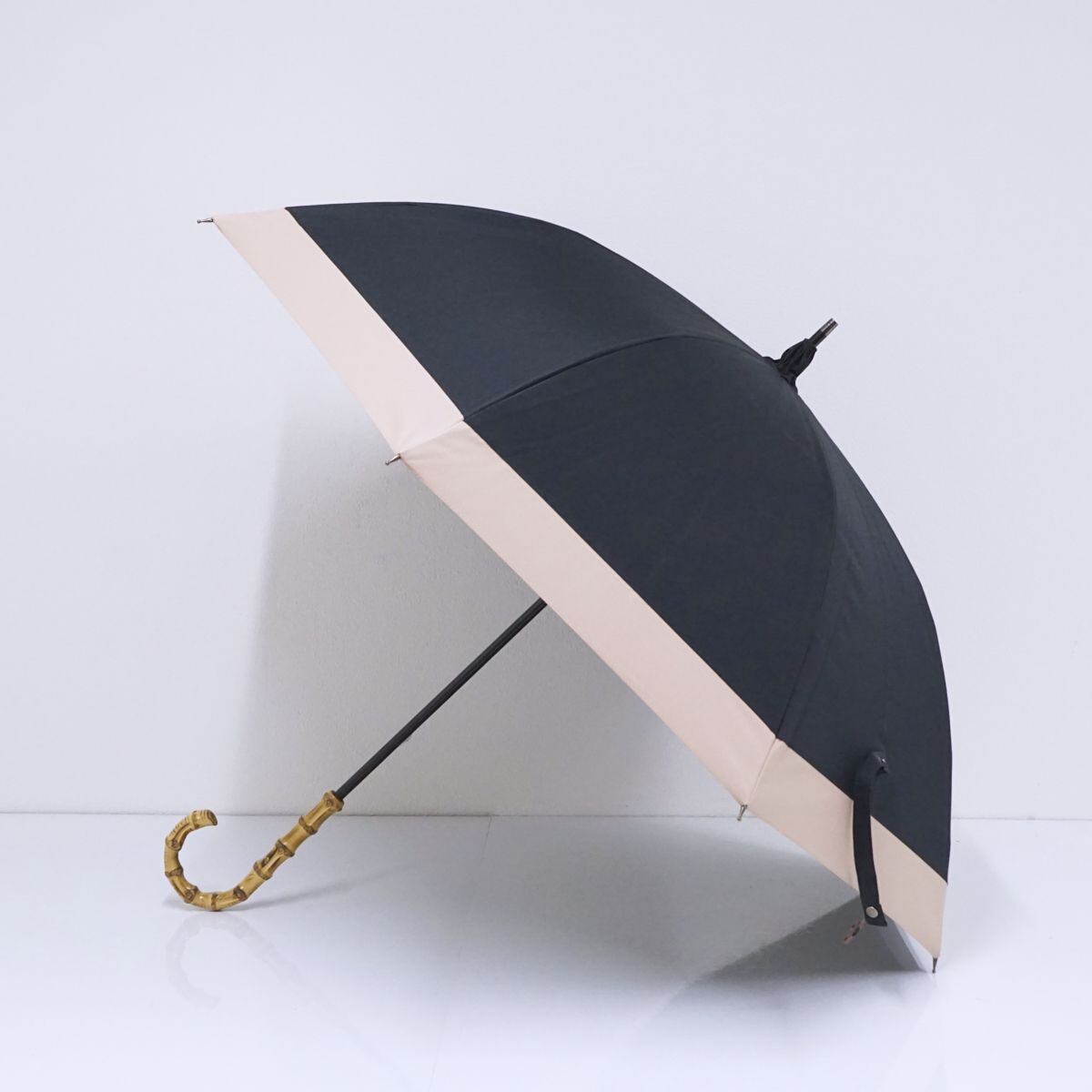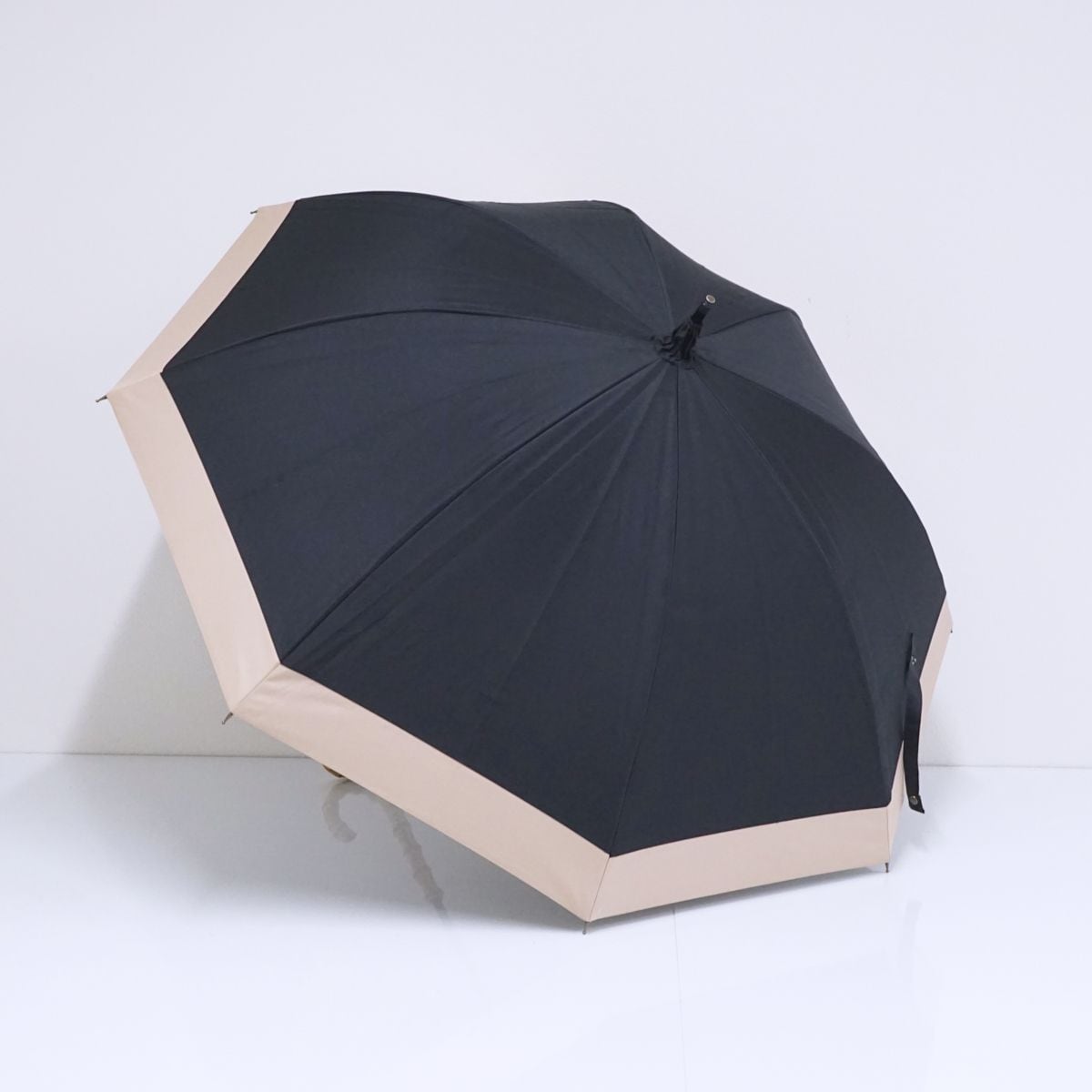 ブラック✕ピンクのコンビパターンで、日傘の中では大き目のサイズ設計と上品なカラーが特徴です。