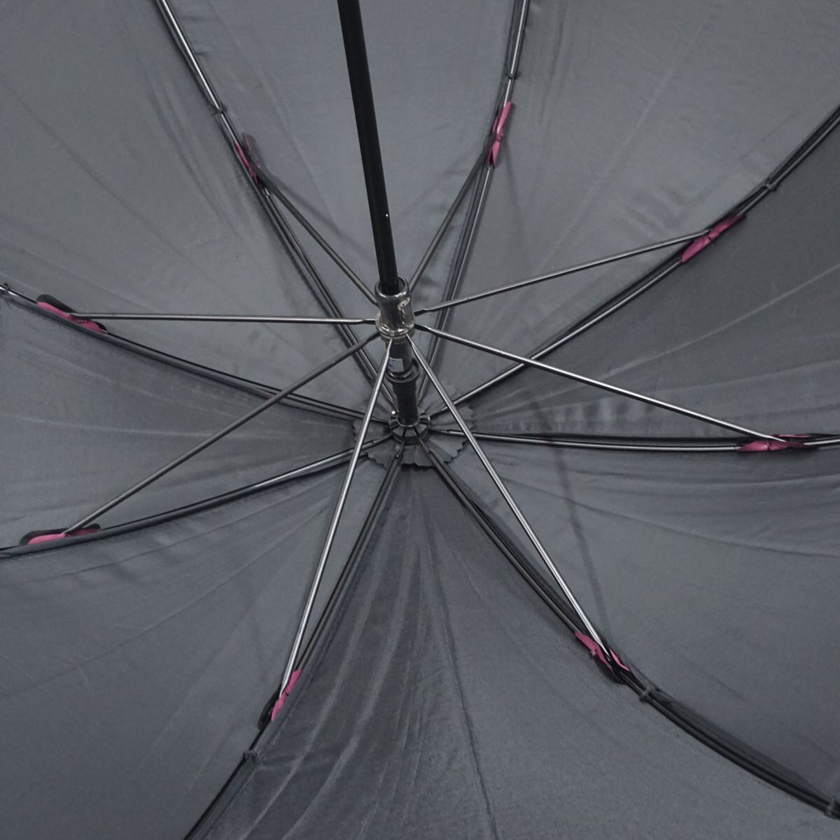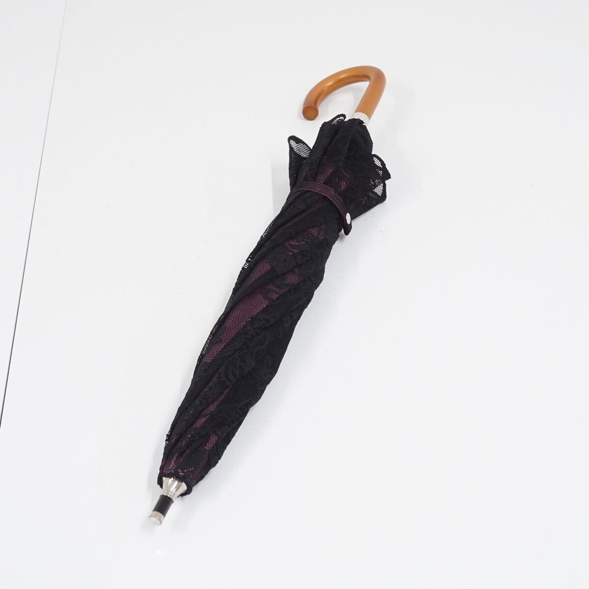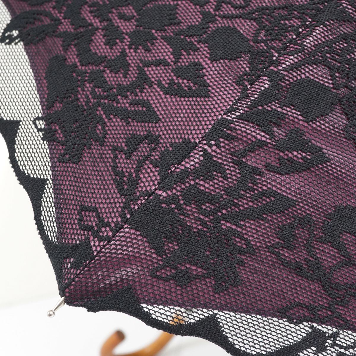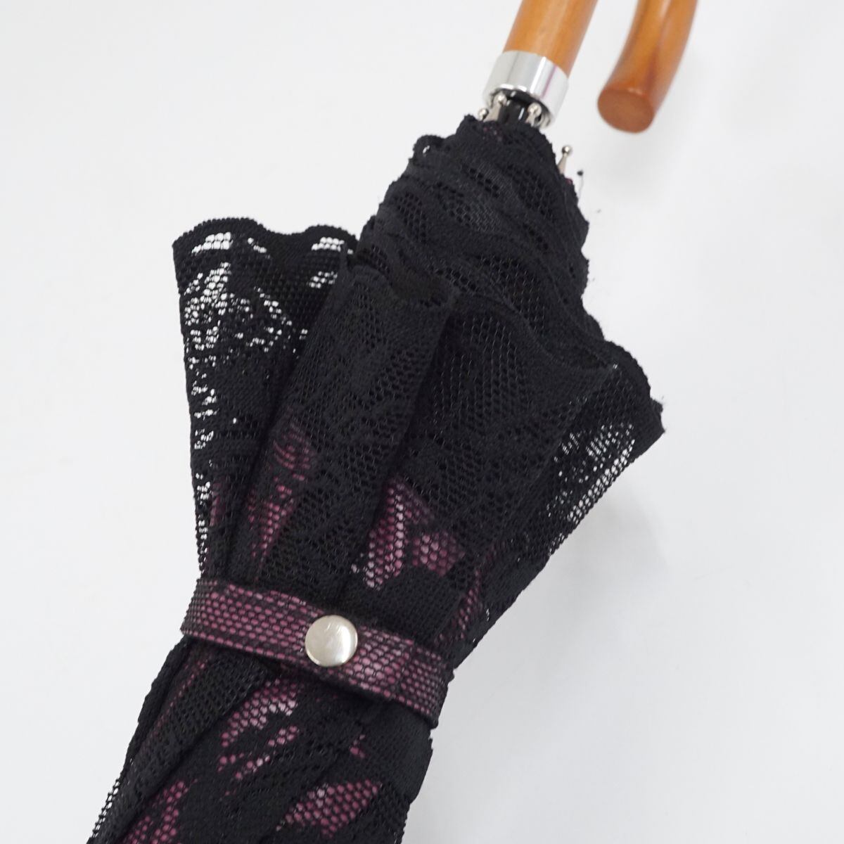 ラズベリーパープルの遮光生地に、フラワーをデザインしたブラックのレースヴェールを重ねたエレガントなデザインの日傘です。