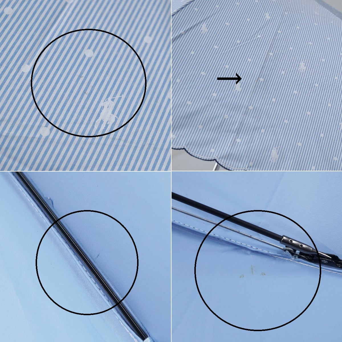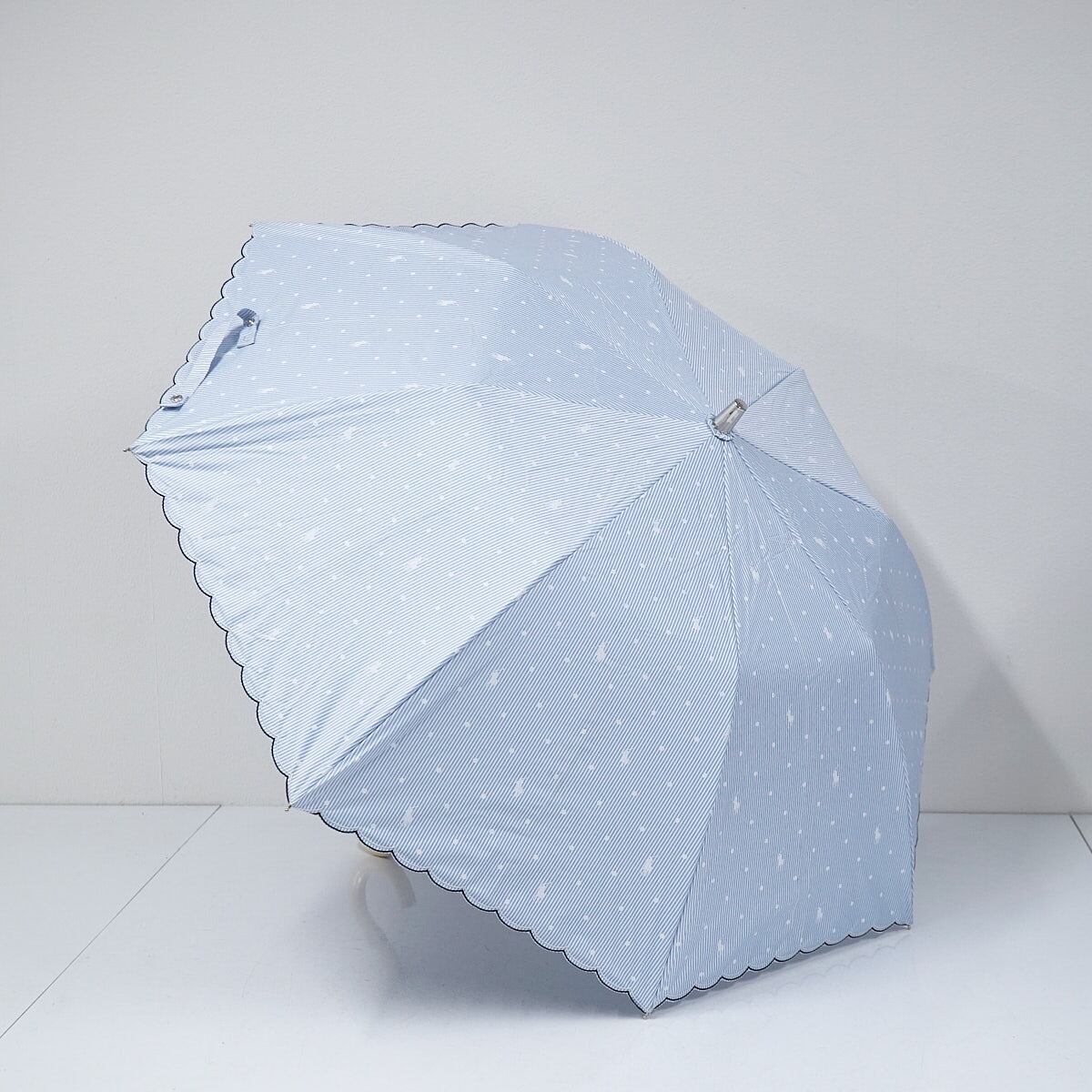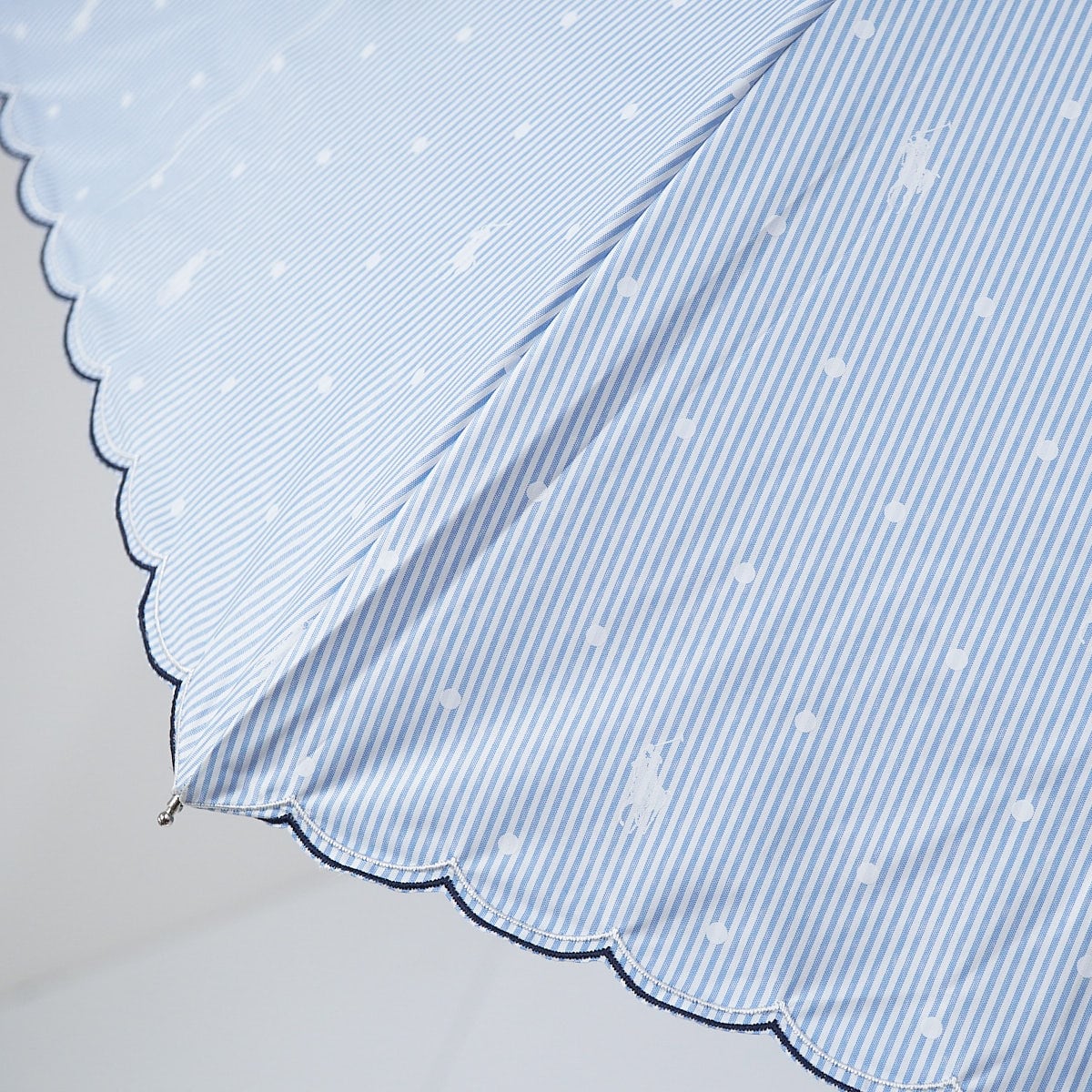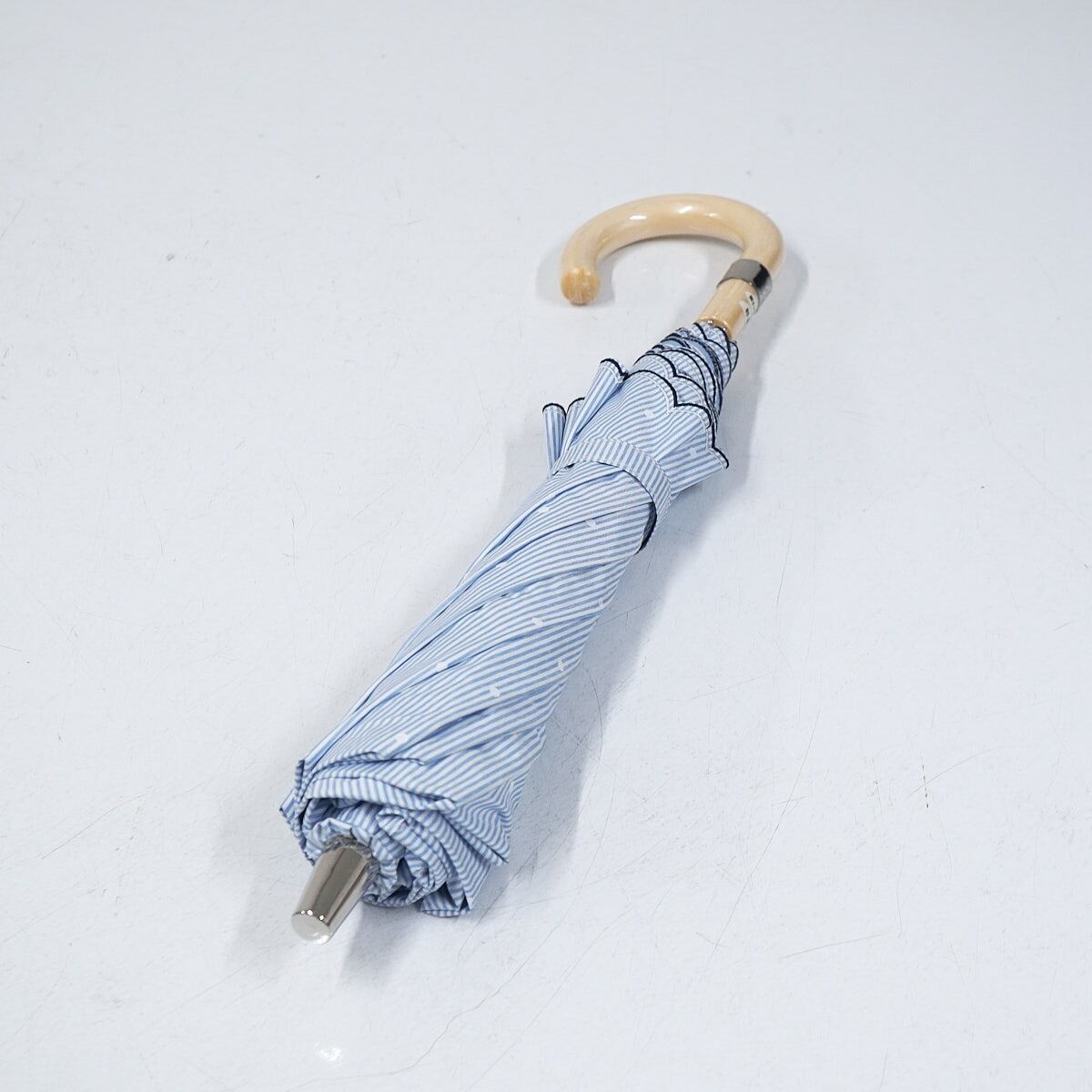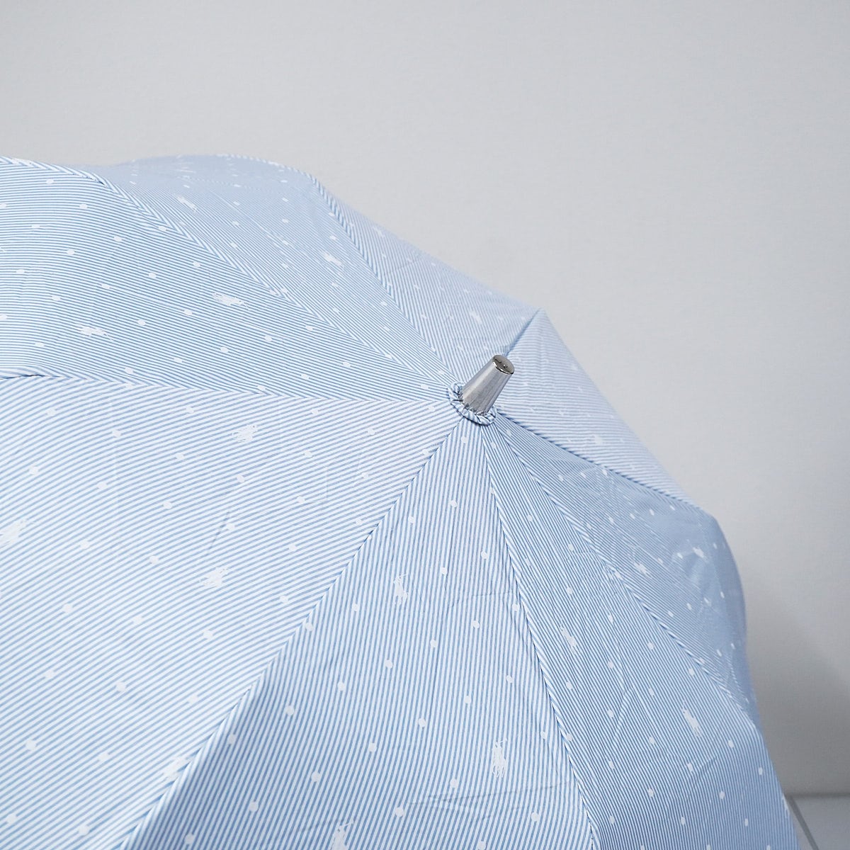 ピンストライプ柄に、ドットとポロポニーを散りばめた爽やかなデザインの折りたたみパラソルです。