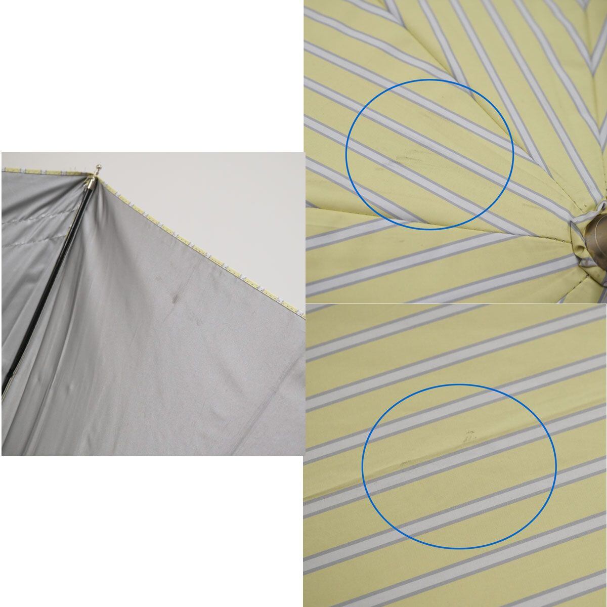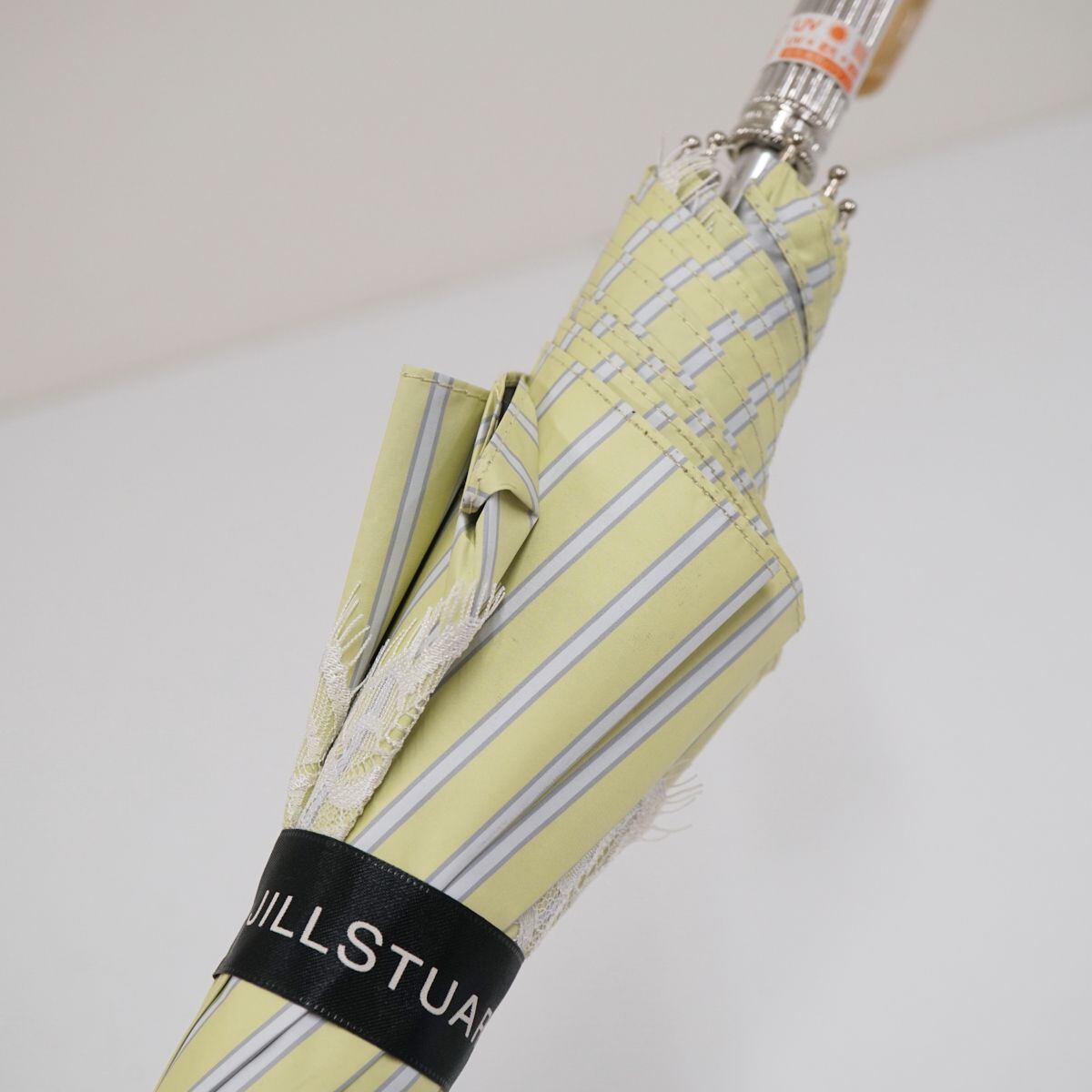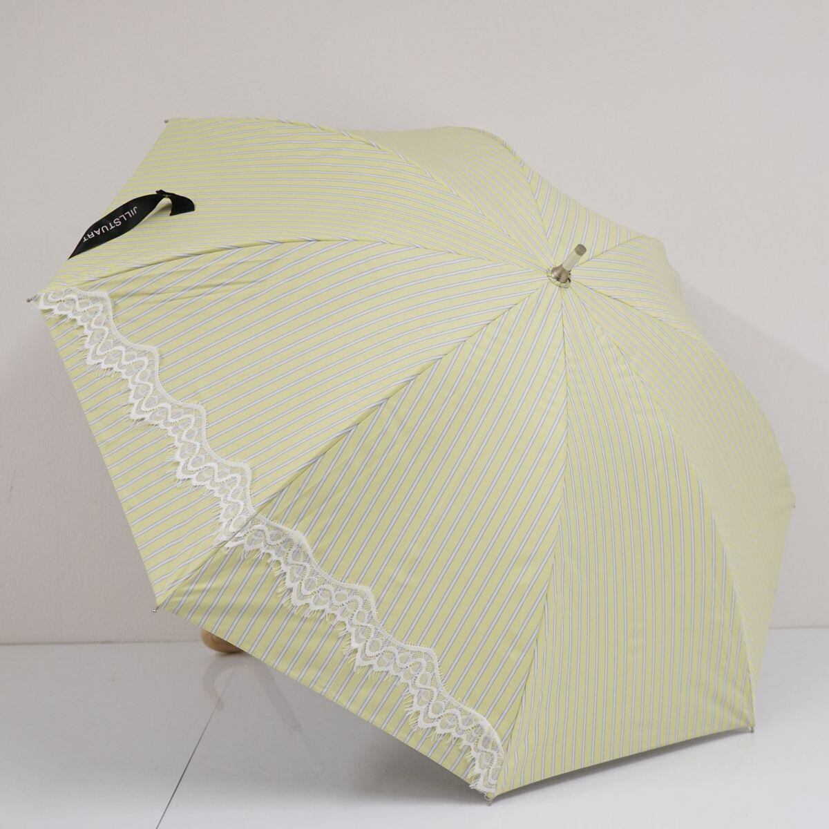 晴雨兼用日傘 JILL STUART ジルスチュアート USED美品 ストライプ レース レモングリーン ロゴ 遮光 遮熱 UV グラス骨 50cm T A0597