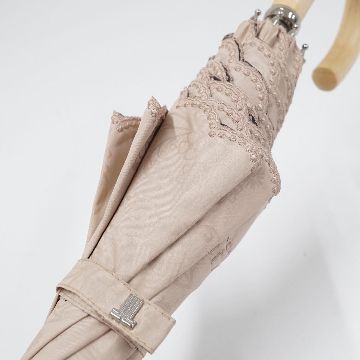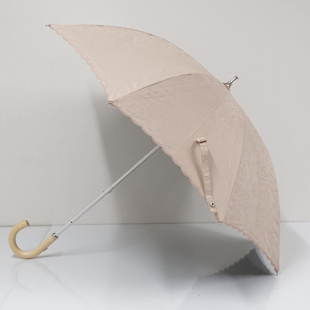 ベージュの生地の縁に施されたスカラップ刺繍が、繊細で可憐な華やぎを醸し出すデザインです。