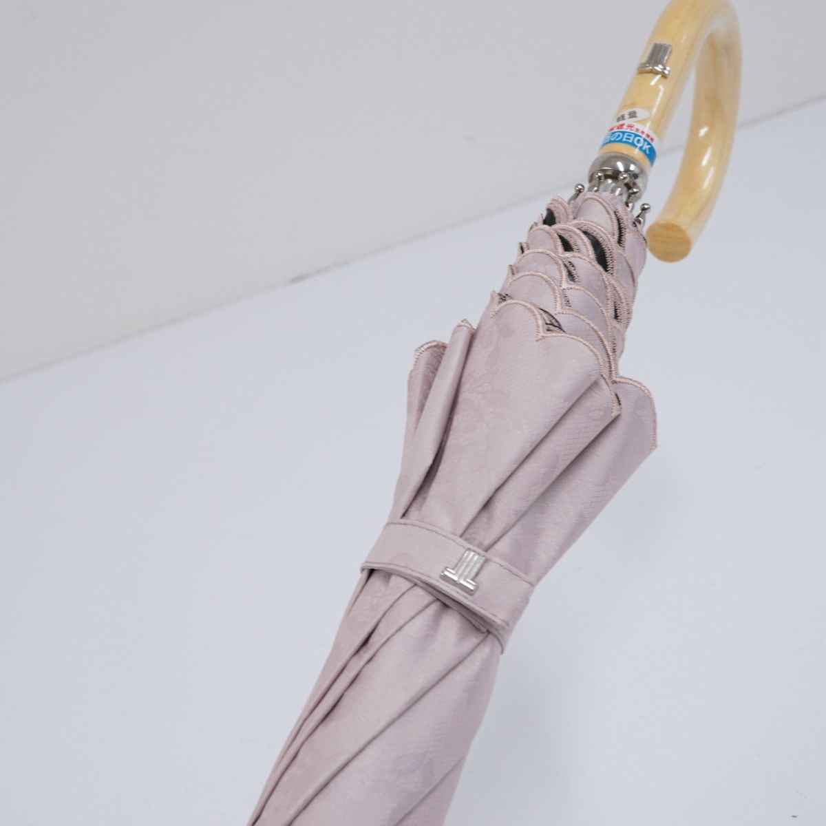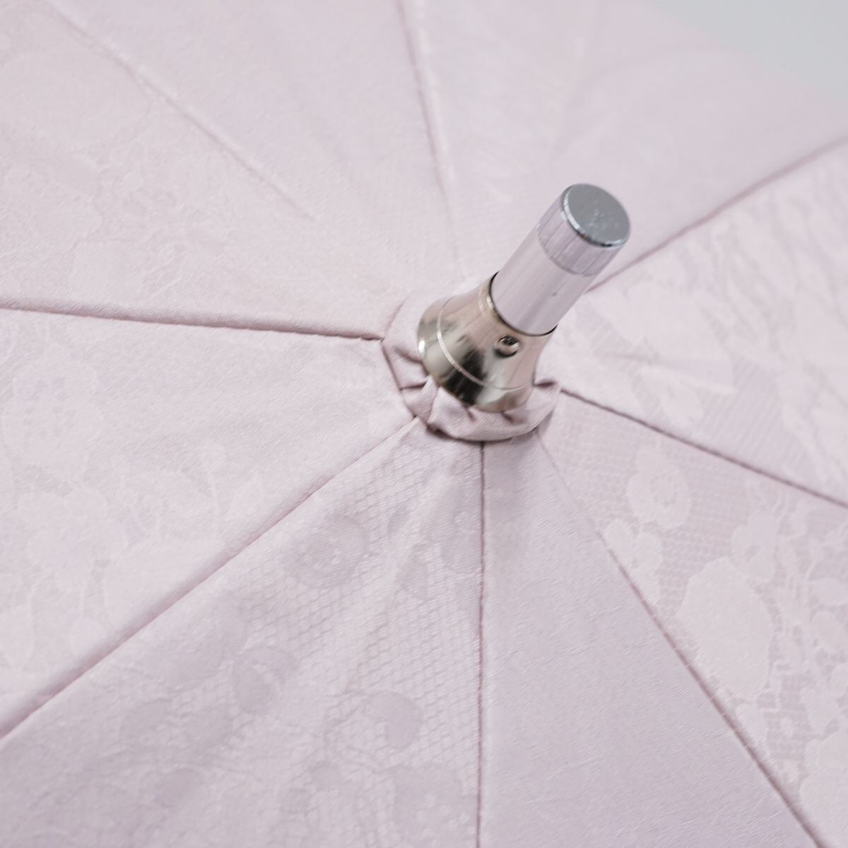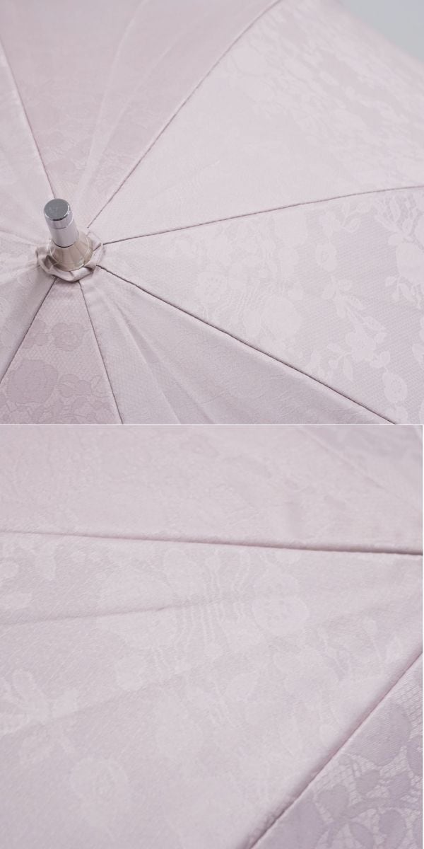 レーシーな模様がふんわりと浮かび上がるエレガントなデザインの折りたたみパラソルです。