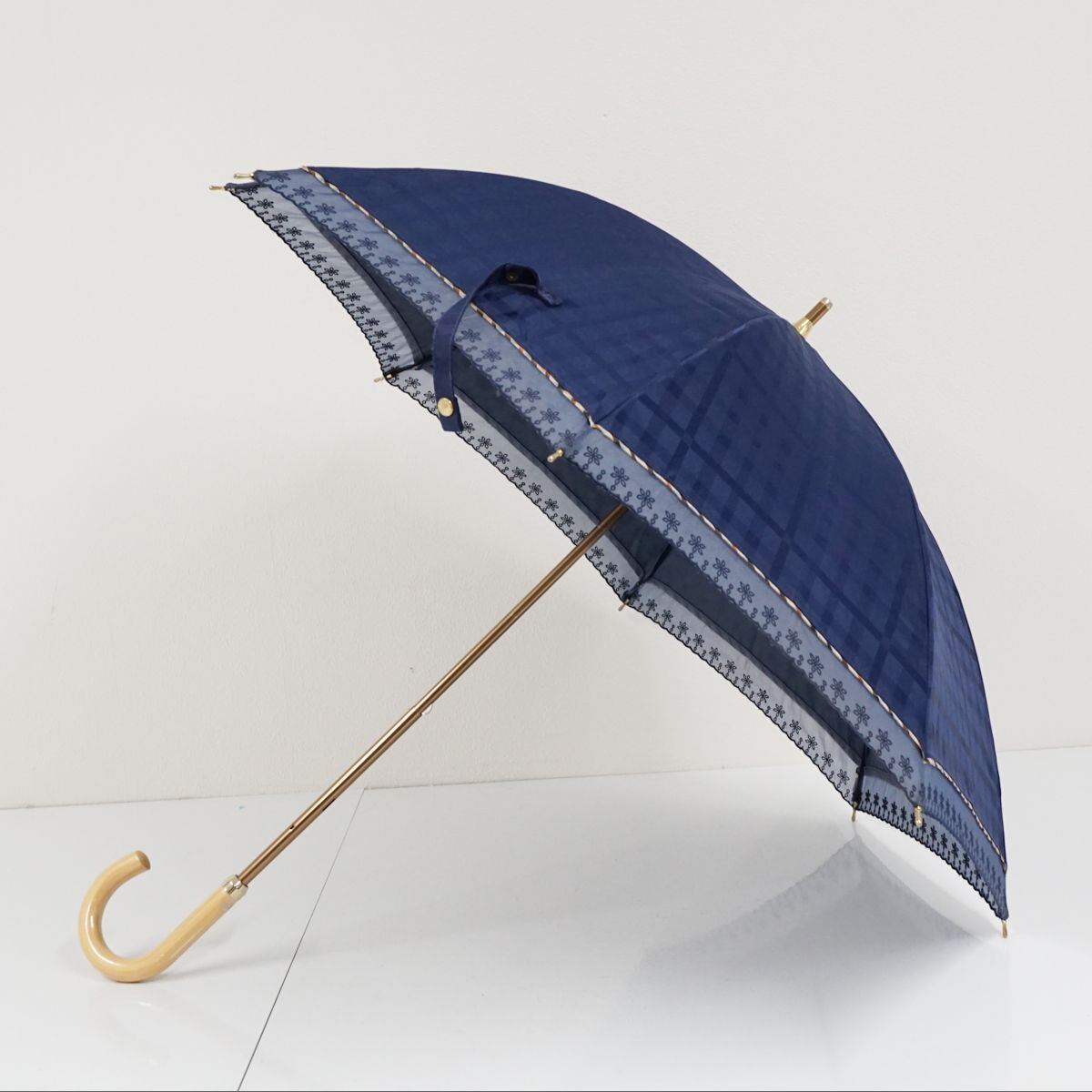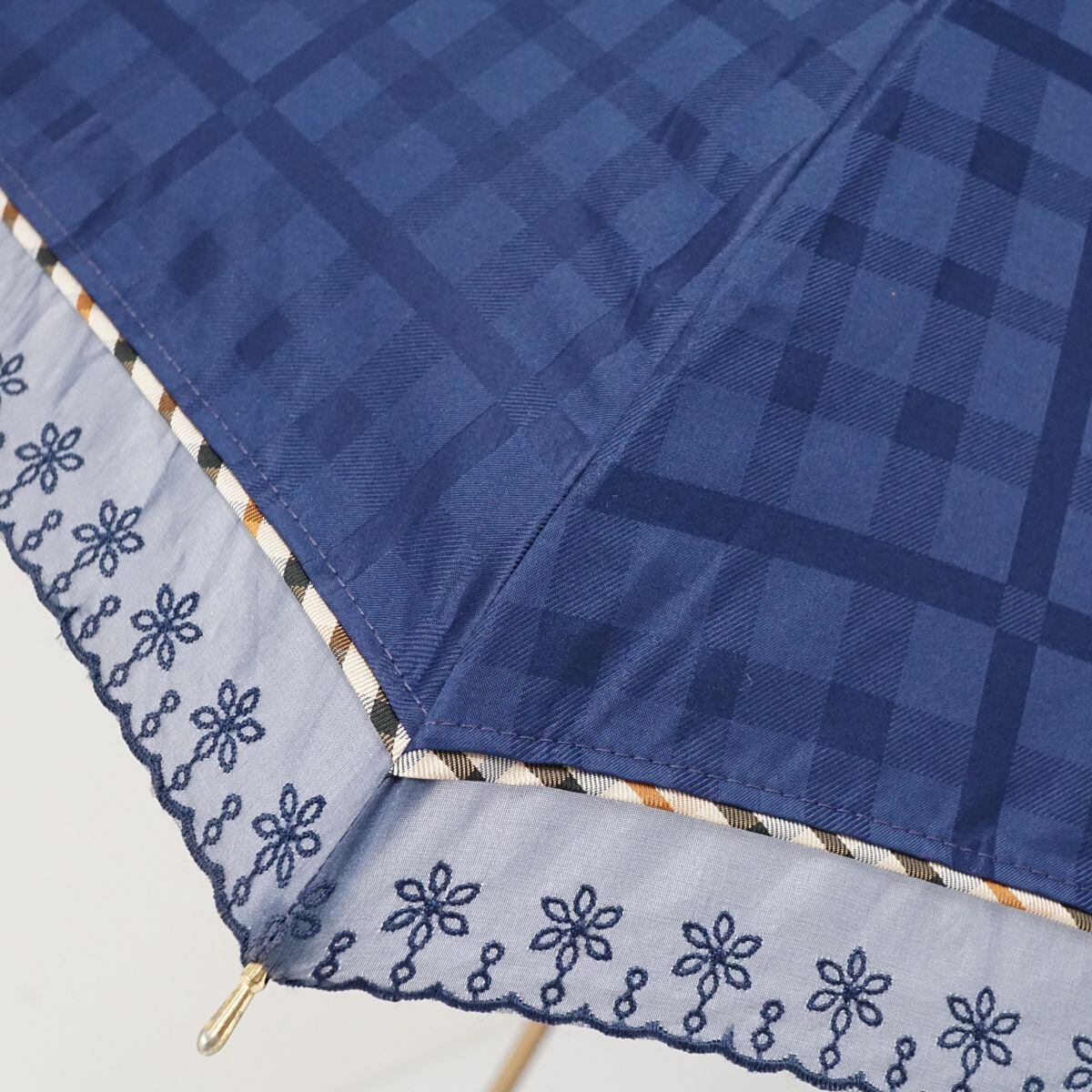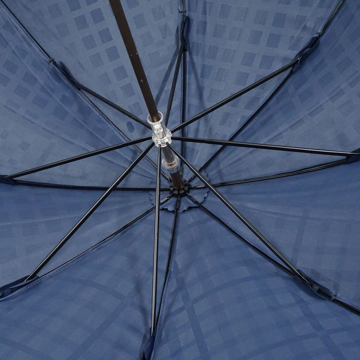 ネイビーの生地に織り込んだチェックパターンが淡い光沢を放つ晴雨兼用日傘です。