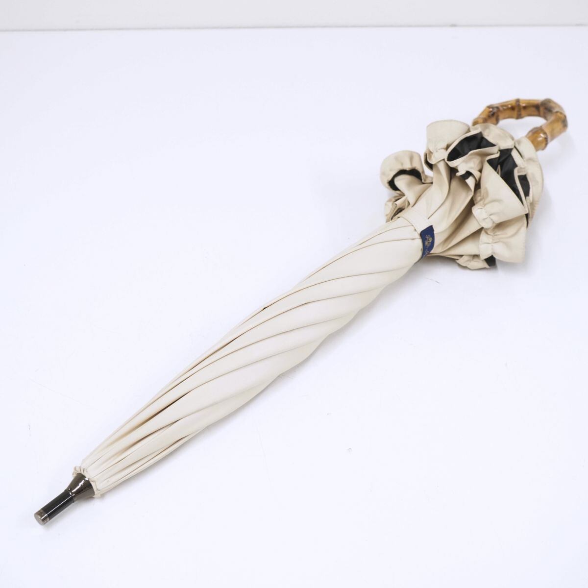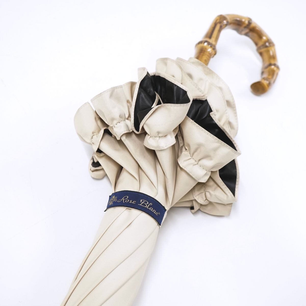 シンプルなカラーと、上品なフリル、最高級の竹を使用した手元が高級感あるデサインです。