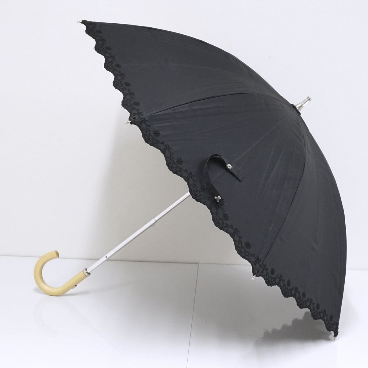 ブラックの生地にフラワーのスカラップ刺繍がエレガントなデザインのパラソルです。