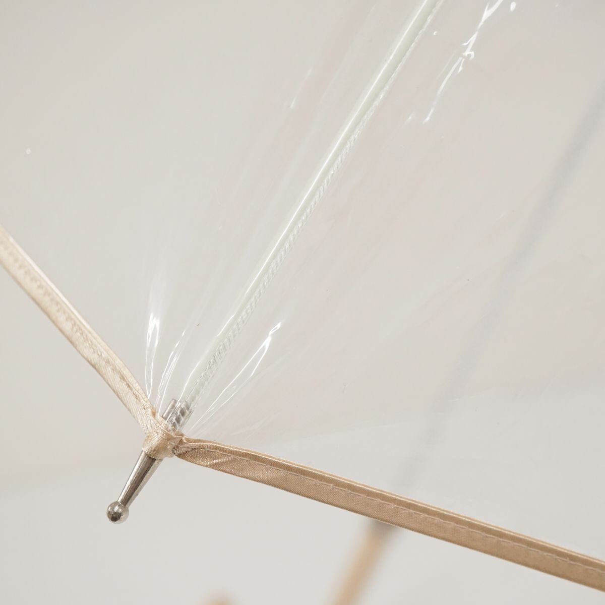 気品溢れるビニール傘 「縁結(えんゆう)」は、ハンドルに防水サテン生地をあしらい、外周の縁取りも同じ生地で統一し、高級感があります。
