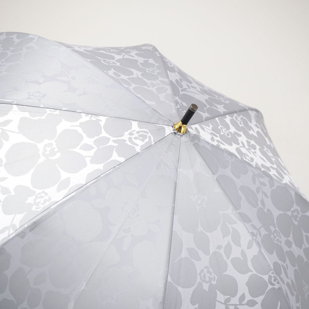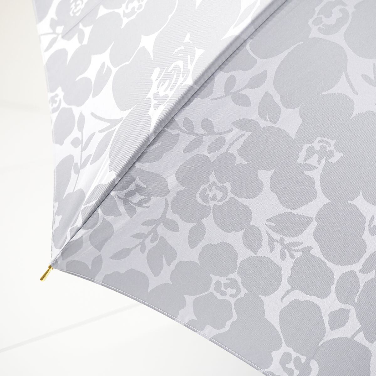 光沢のあるライトグレーの生地全体に、フラワーシルエットが織り込まれたエレガントなデザインです。
