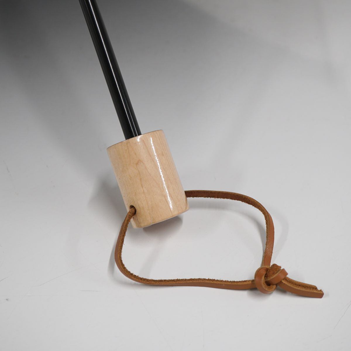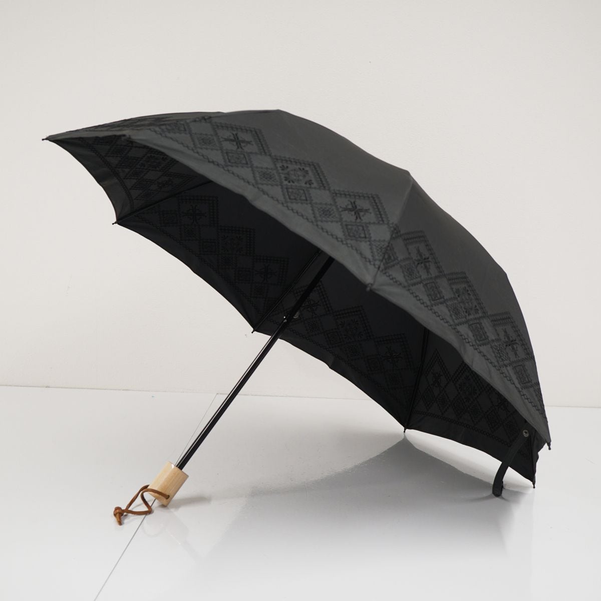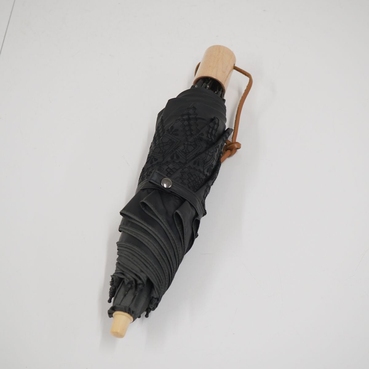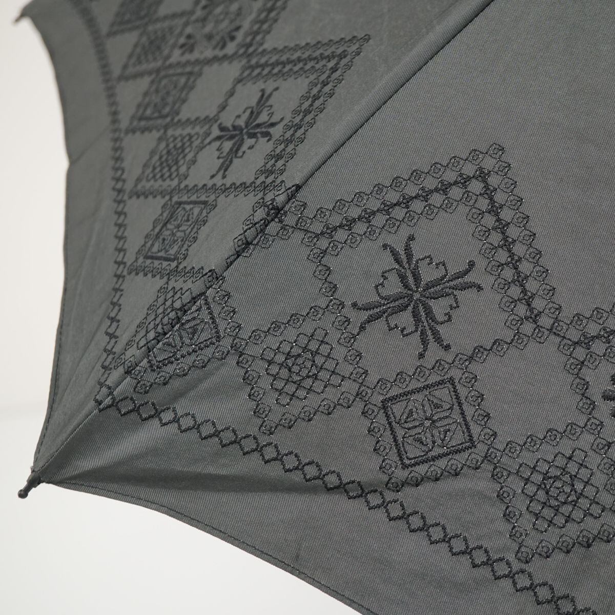 外周にたっぷりと施された刺繍がエレガントな印象で、天然木のハンドルにはレザーのストラップが付いています。
