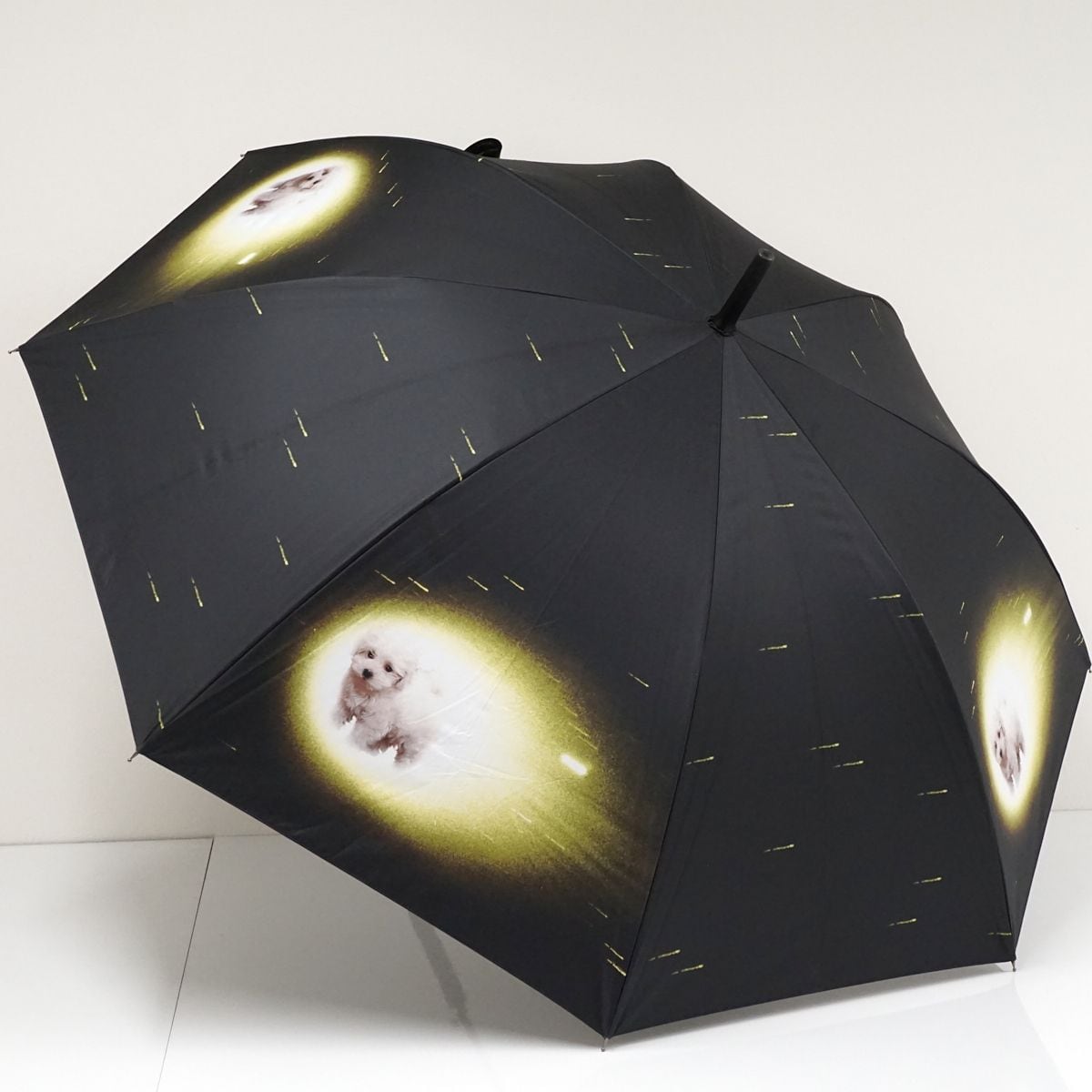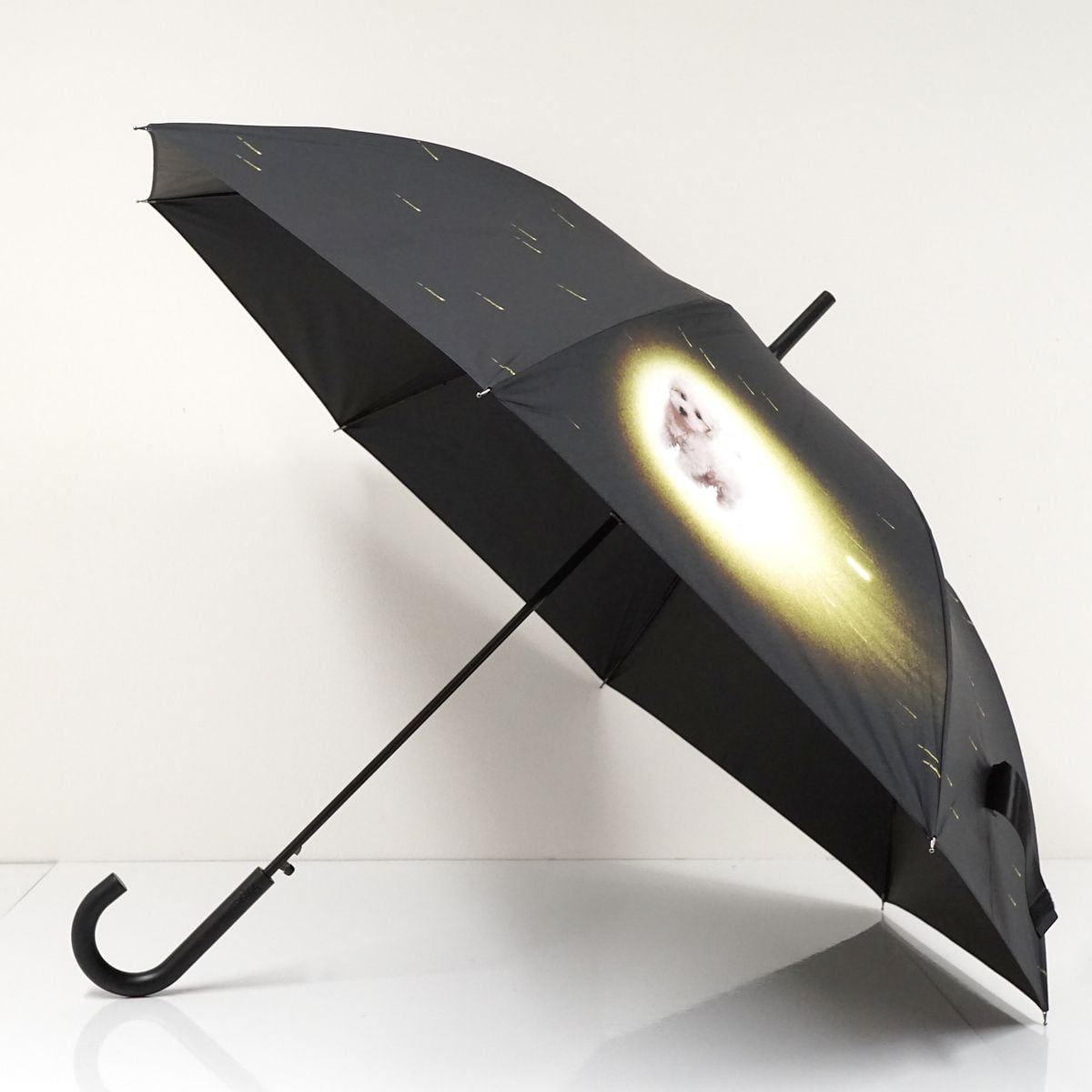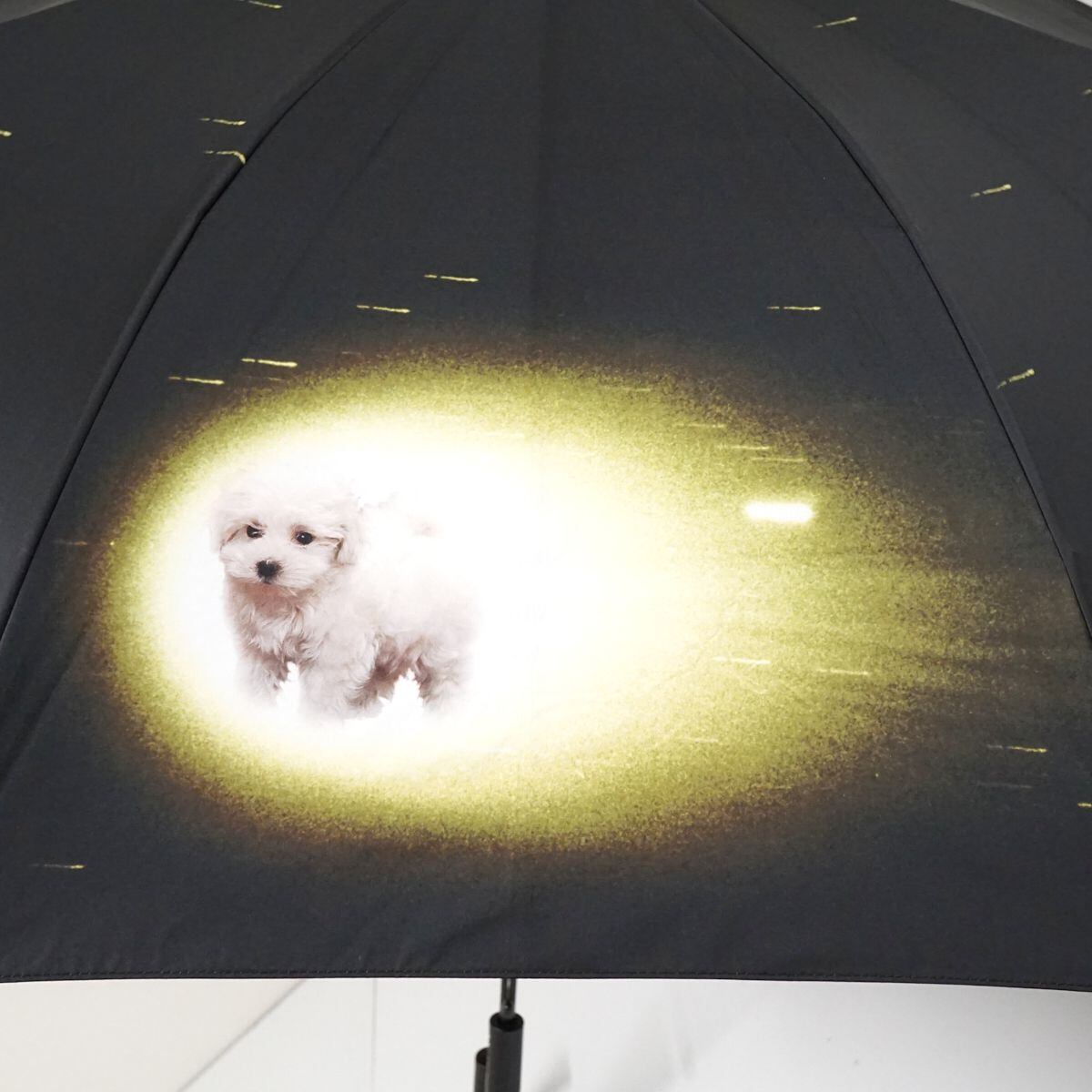 むっくむくの可愛らしいワンちゃんが光速で宇宙空間を移動する、シュールで個性的なグラフィックデザインの雨傘です。