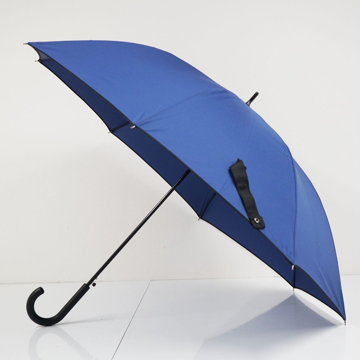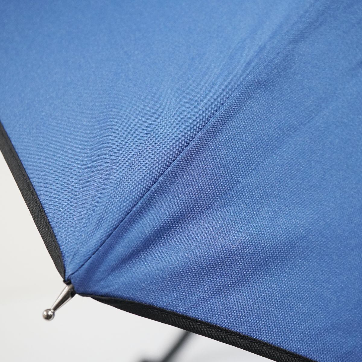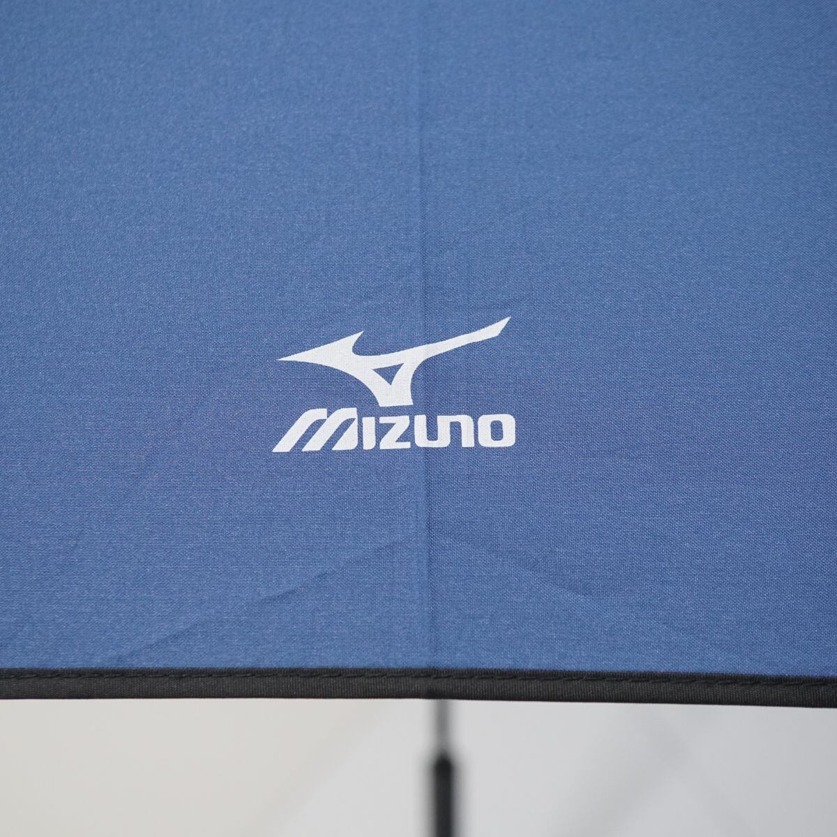 ダークブルー生地の1コマにロゴを配し、外周にブラックのパイピングを施した「ミズノ」の紳士傘です。
