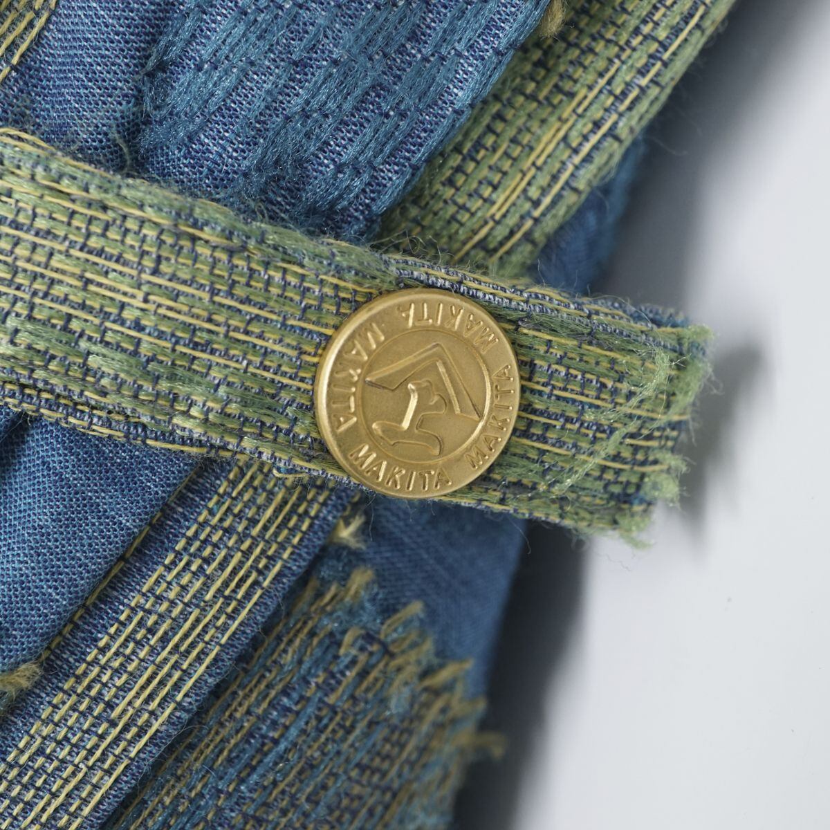 深みのあるブルーの生地にグリーンの糸で織りのデザインが施されており、高い品質とデザイン性を感じられる逸品です。