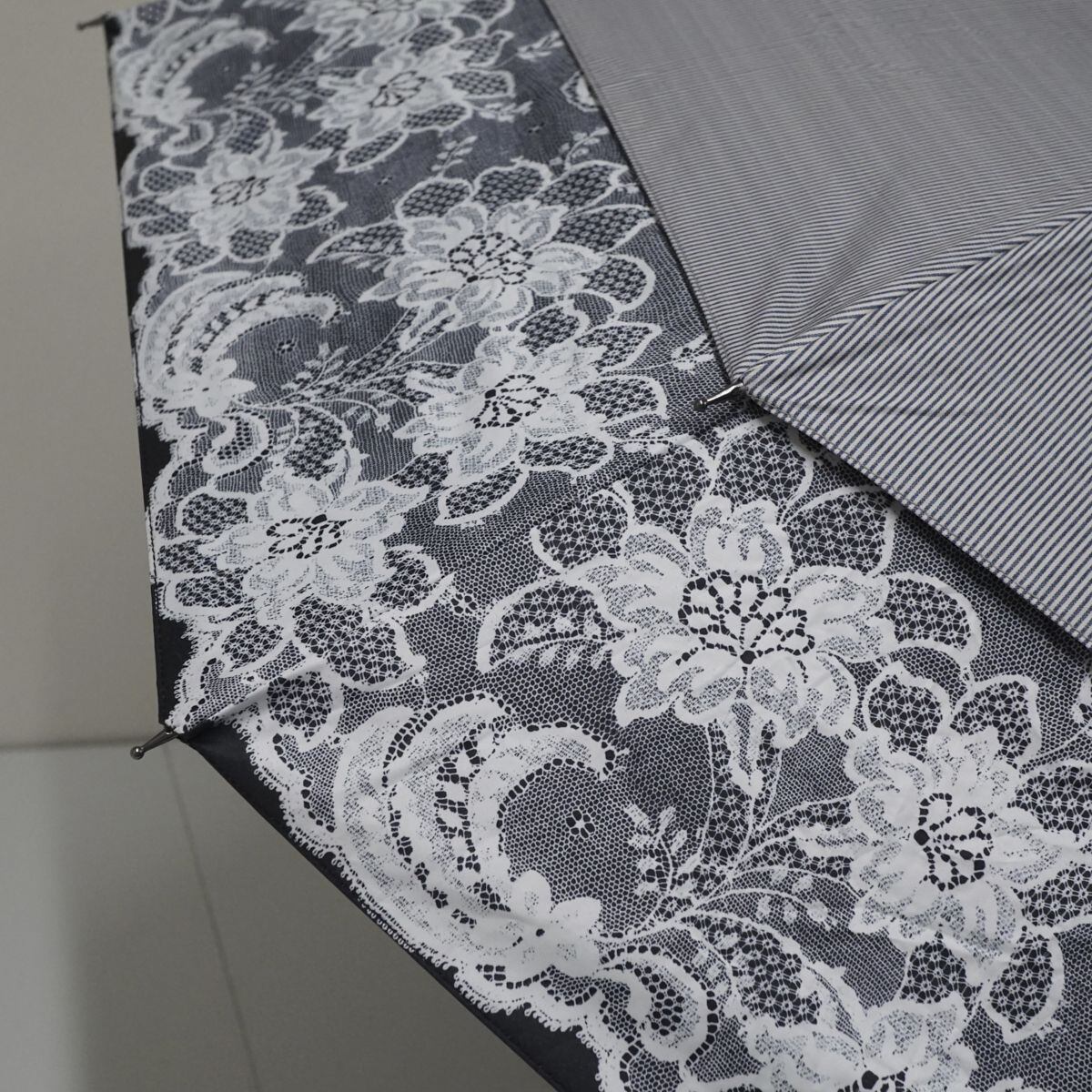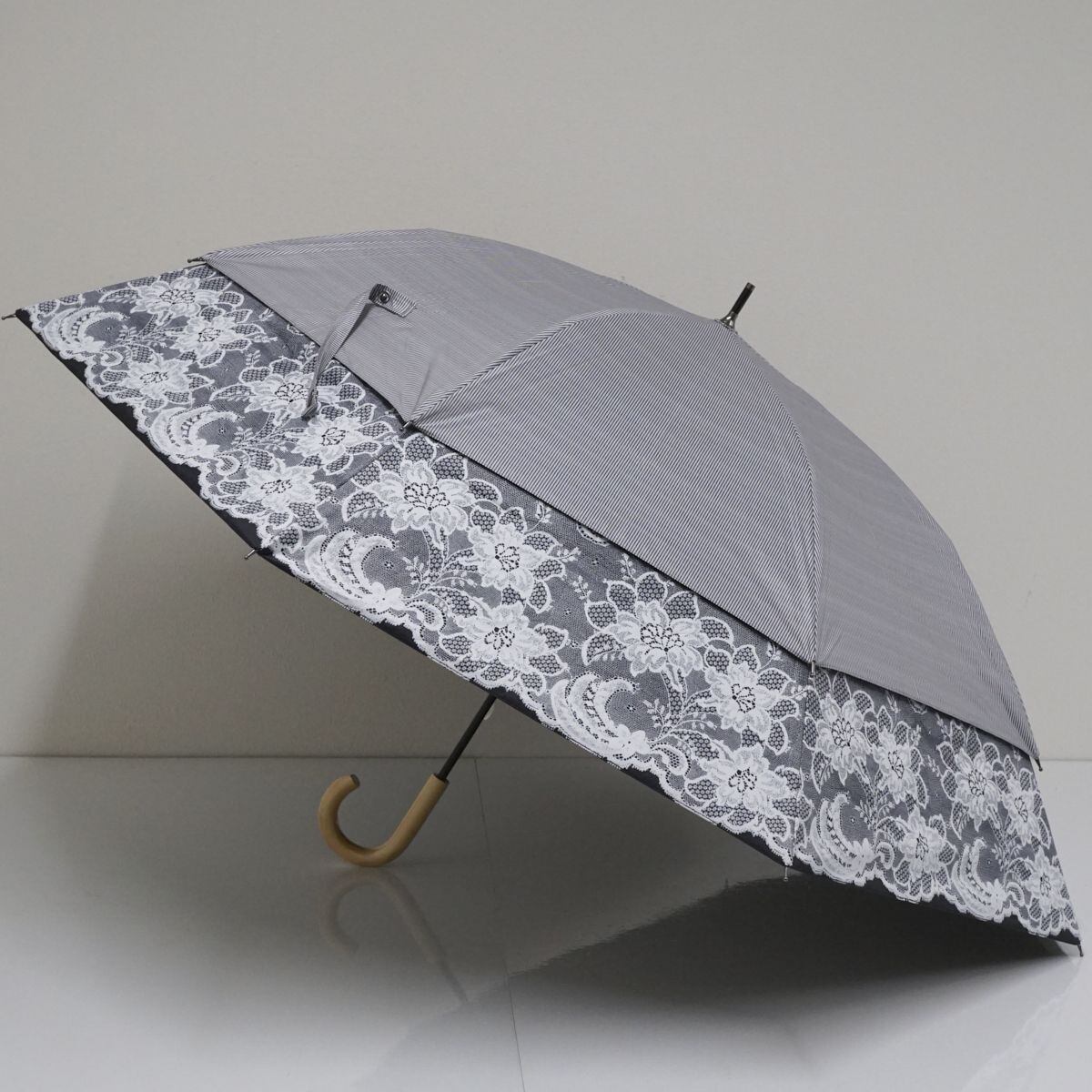 ストライプの生地を伸ばすとレースプリントが出てくるとても可愛らしい傘です。