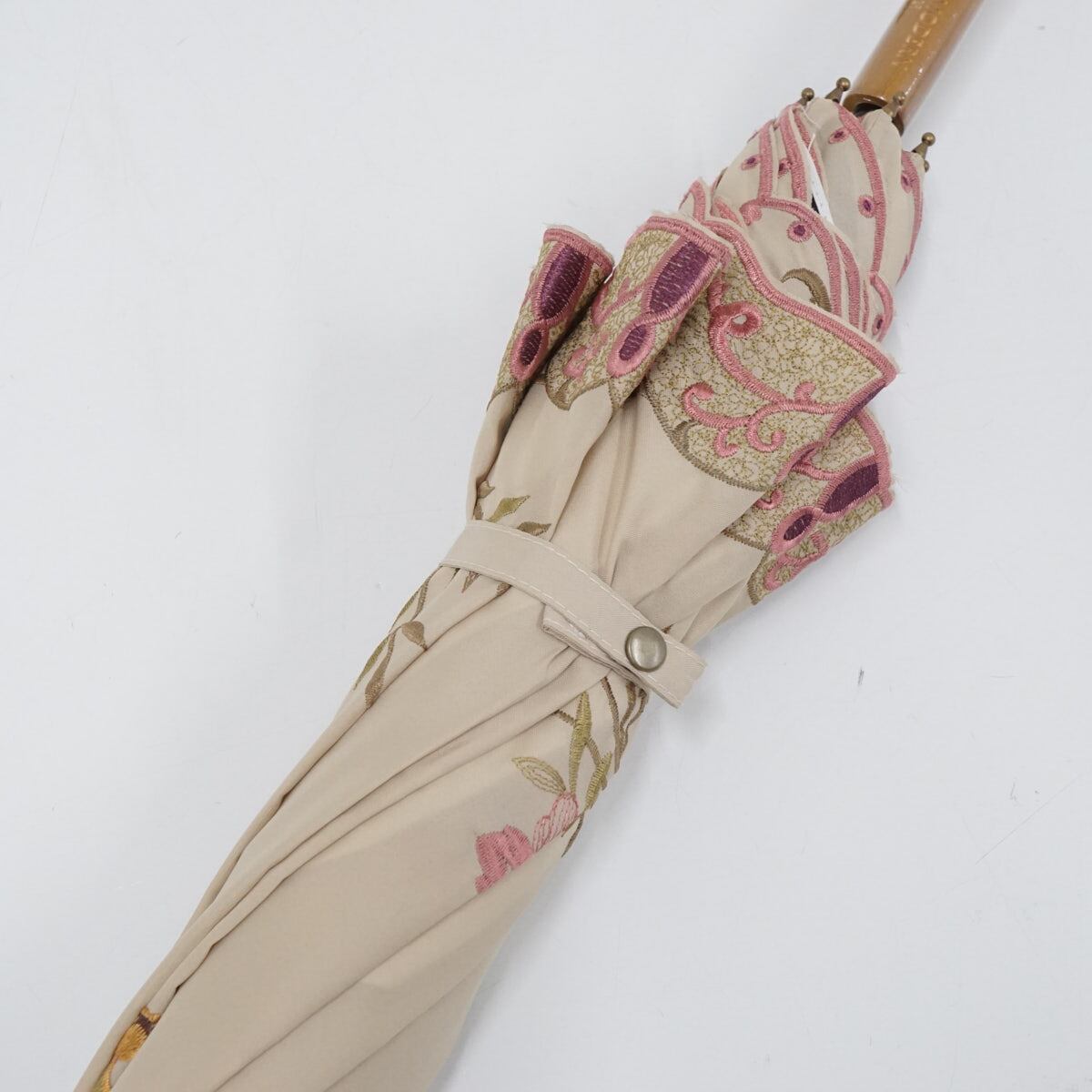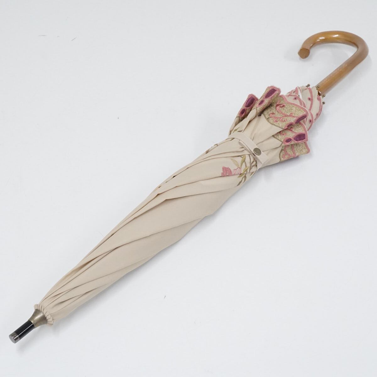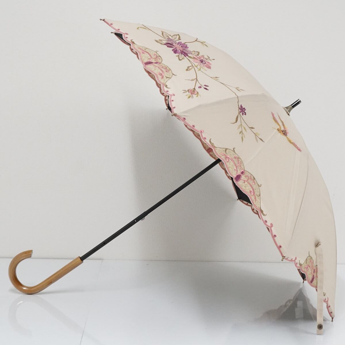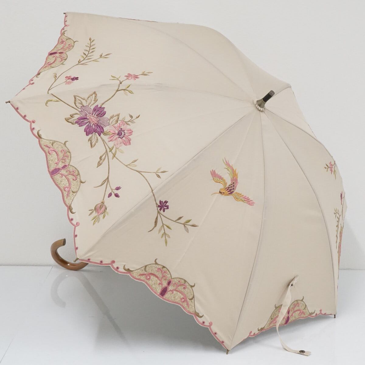 晴雨兼用日傘 chinoiserie modern シノワズリーモダン USED超美品 ライトベージュ 花鳥 ハチドリ 刺繍 かわず張 女優日傘 遮光 47cm S2464
