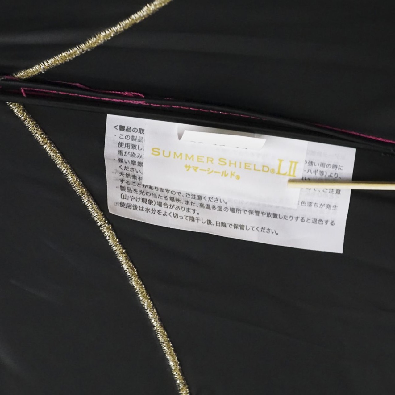 ピンクとベージュのバイカラーの生地にゴールドの刺繍ラインが洗練された雰囲気を醸し出しています。