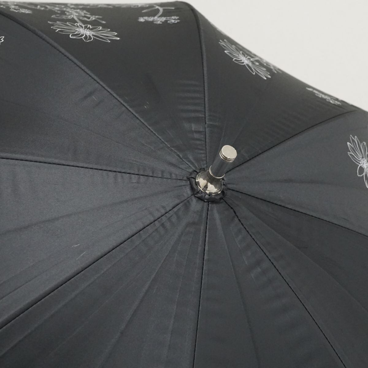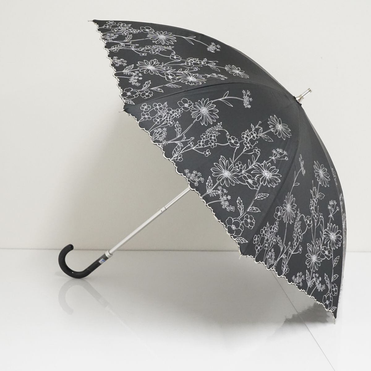 ブラックの生地に花柄プリントが華やかなデザインのパラソルです。