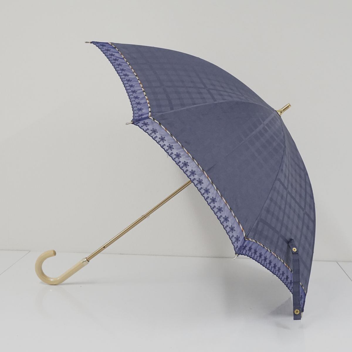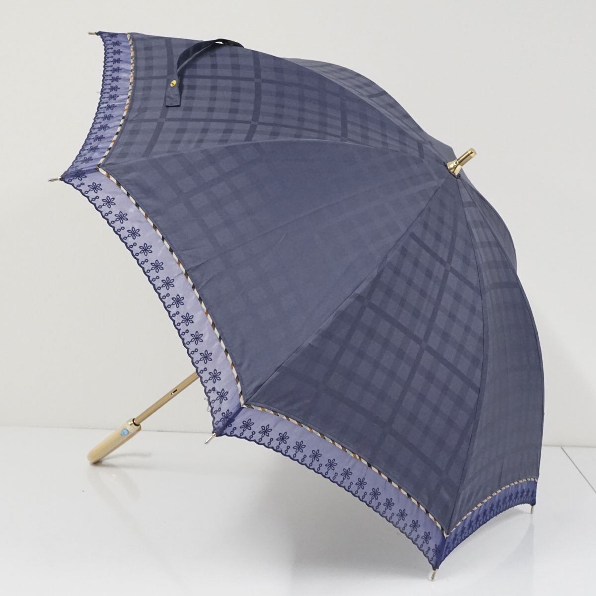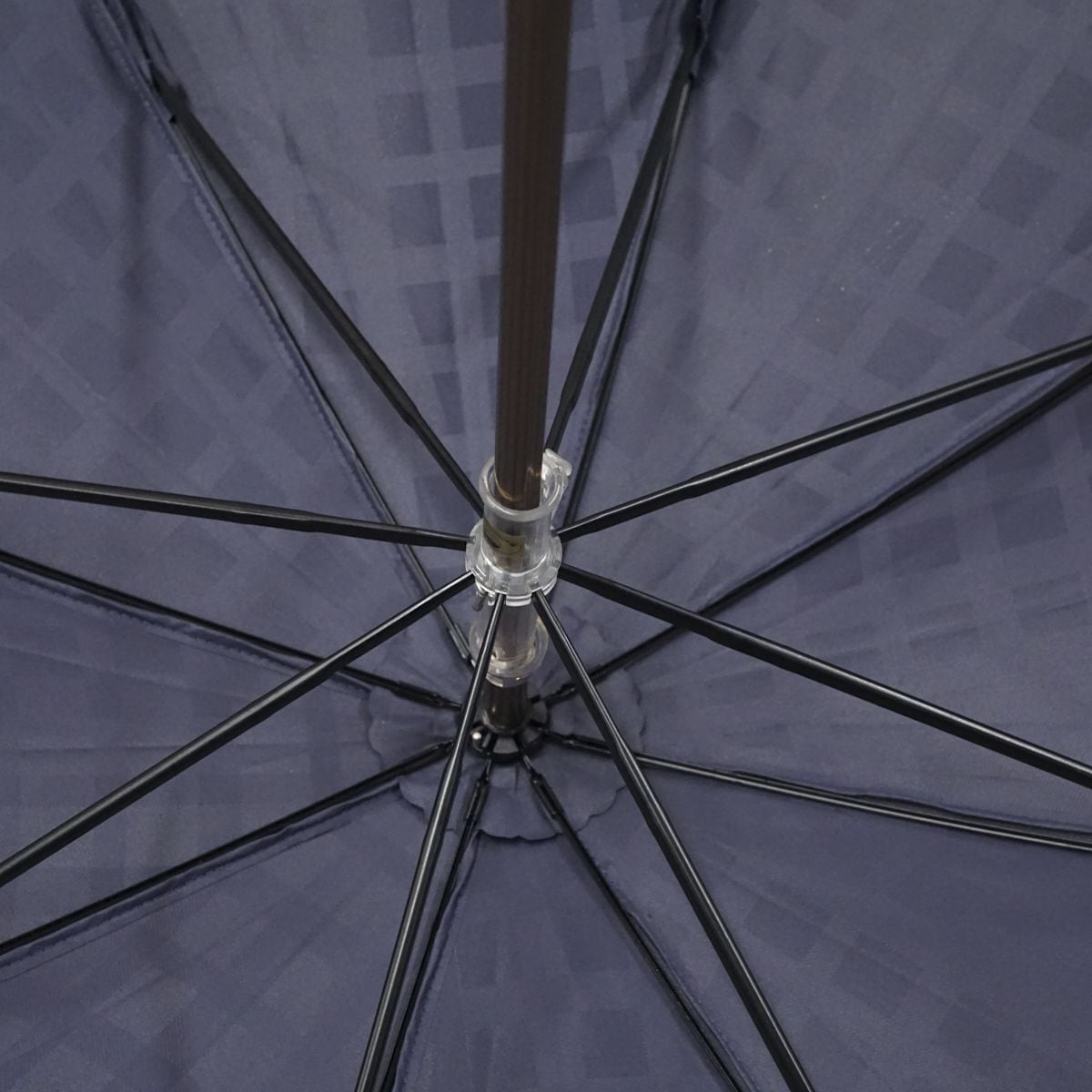 紫がかったネイビーの生地に織り込んだチェックパターンが淡い光沢を放つ晴雨兼用日傘です。