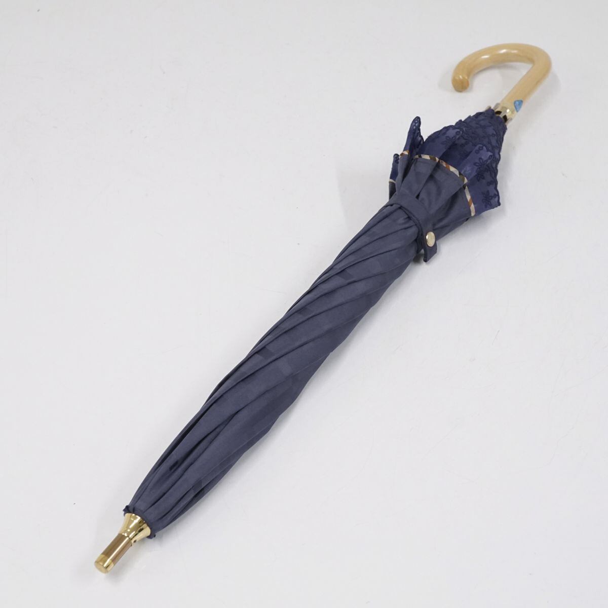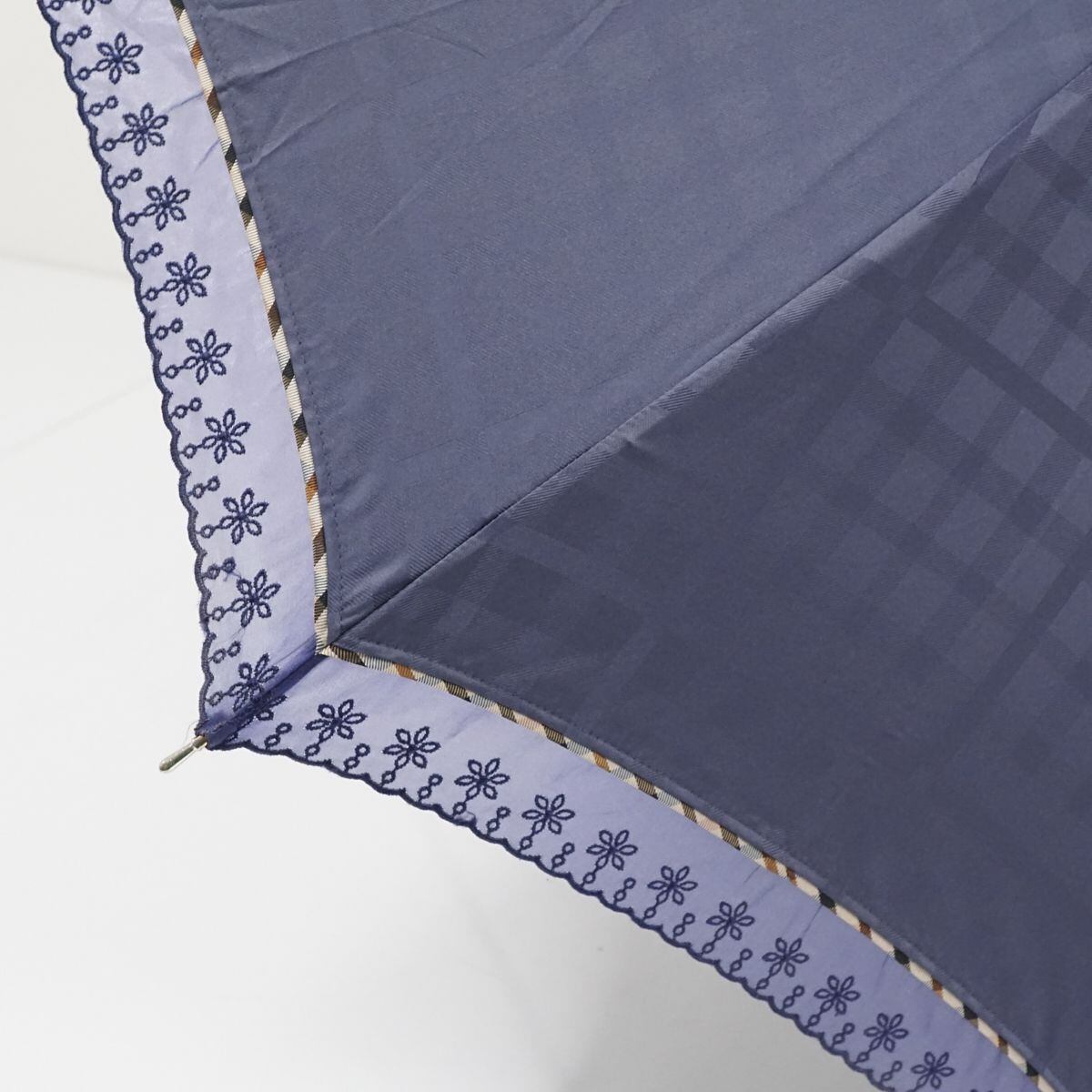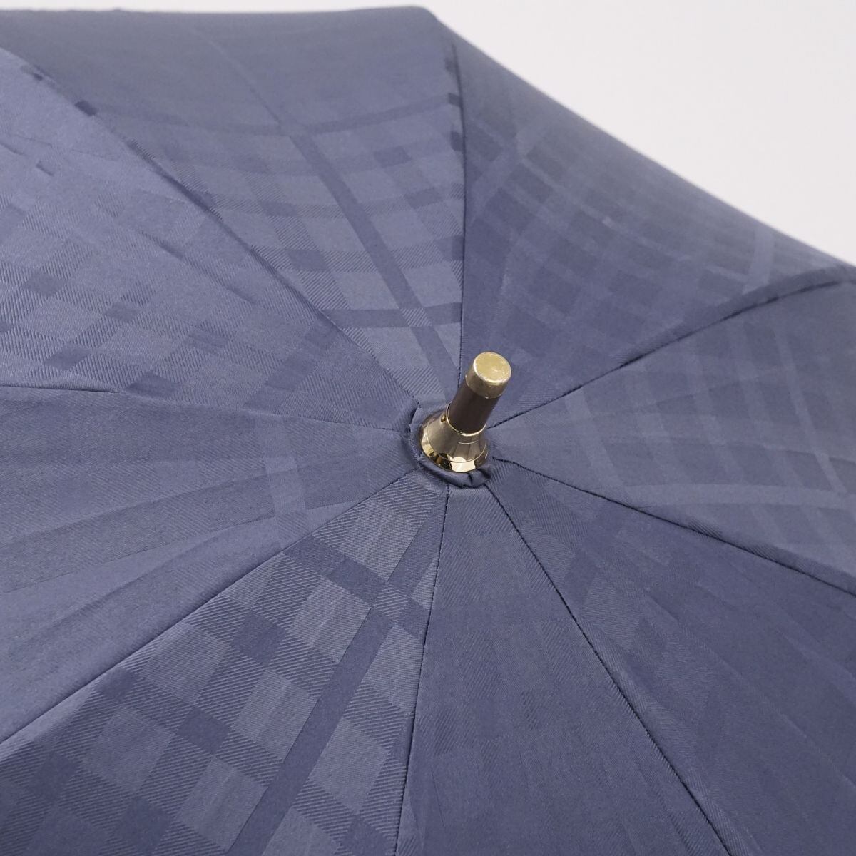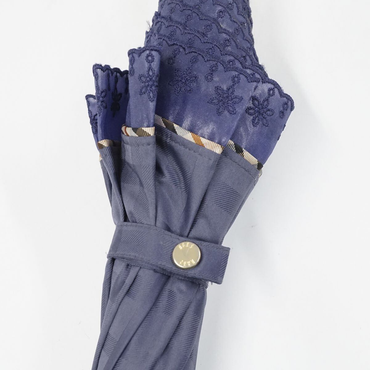紫がかったネイビーの生地に織り込んだチェックパターンが淡い光沢を放つ晴雨兼用日傘です。