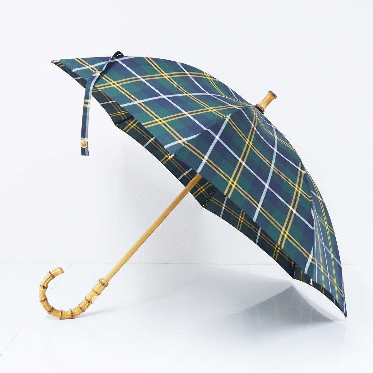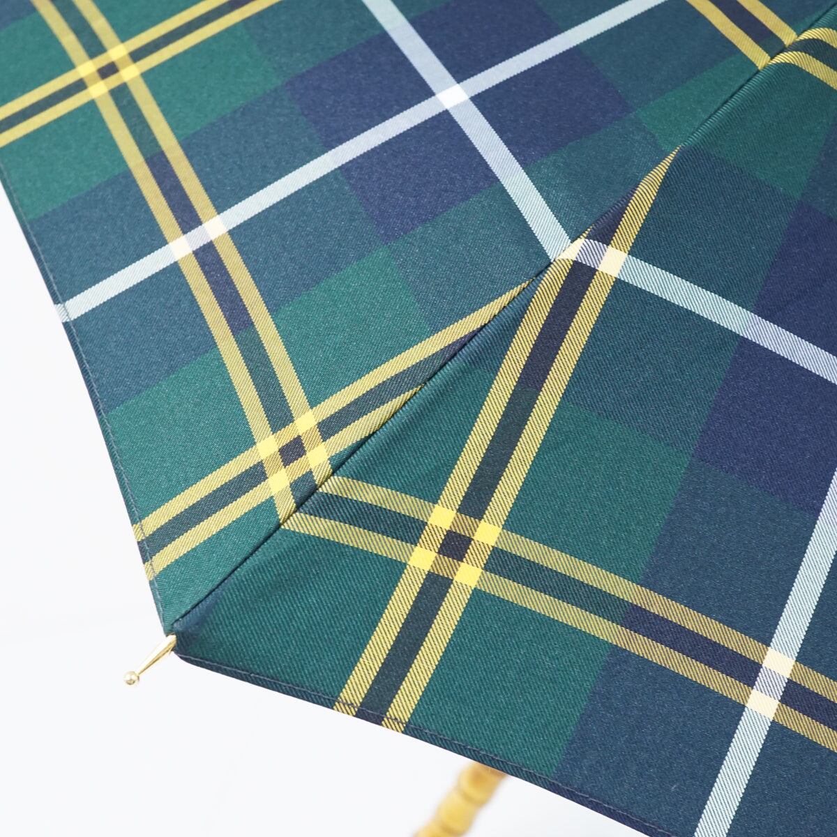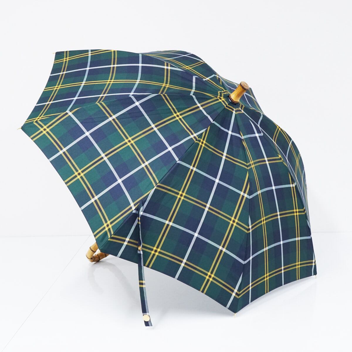グリーンをベースにはUVカット加工が施されておりますのとしたチェックパターンの生地に大ぶりの寒竹手元を合わせた、ナチュラルな雰囲気がオシャレな逸品です。
