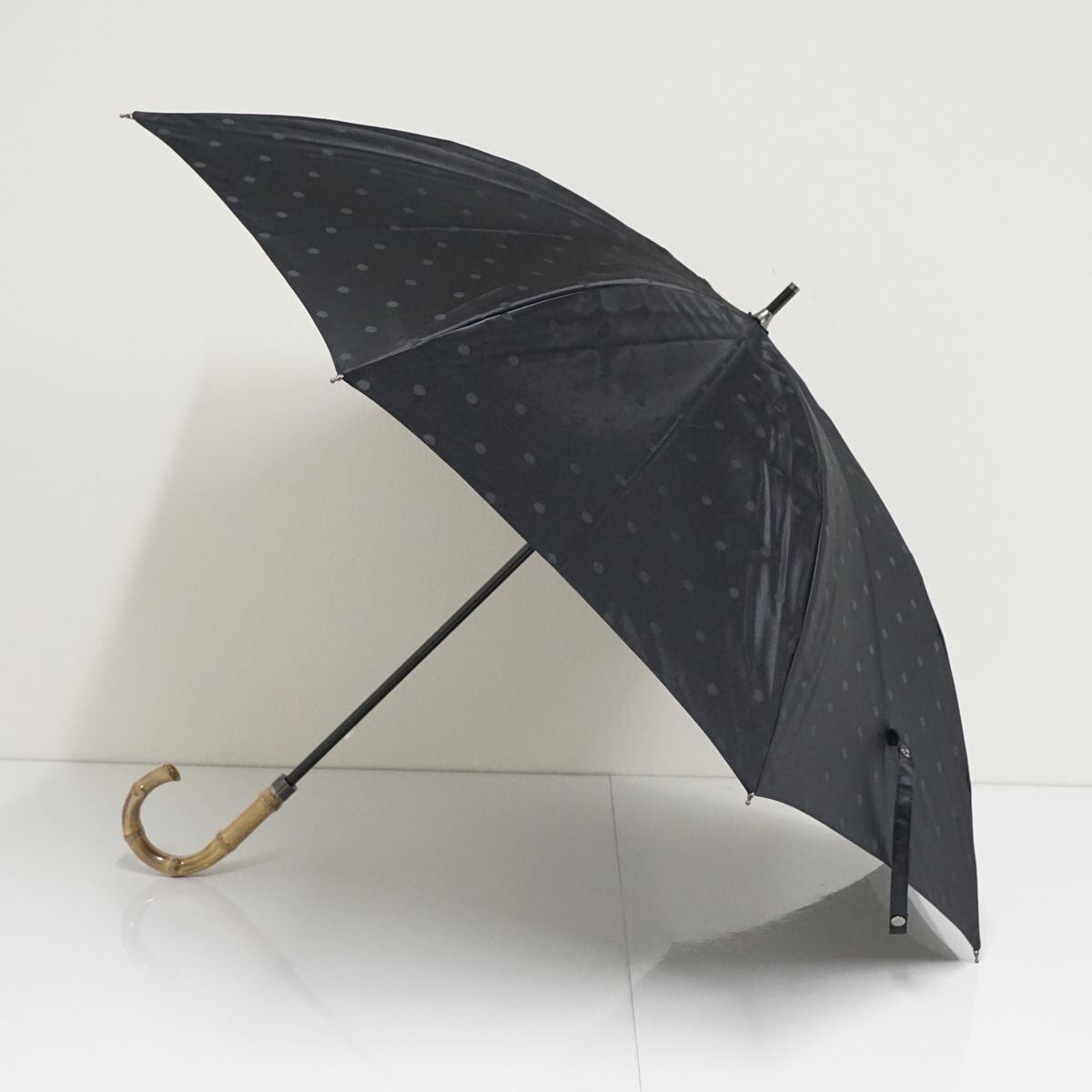 光沢のあるブラックのドット生地がシンプルで使いやすい一品です。