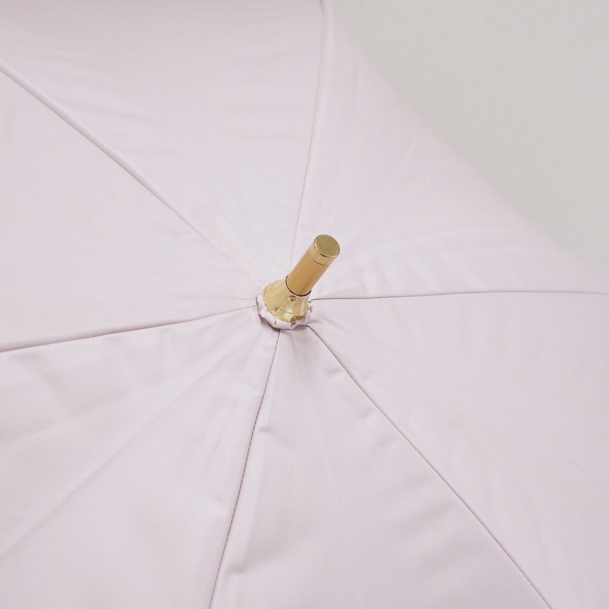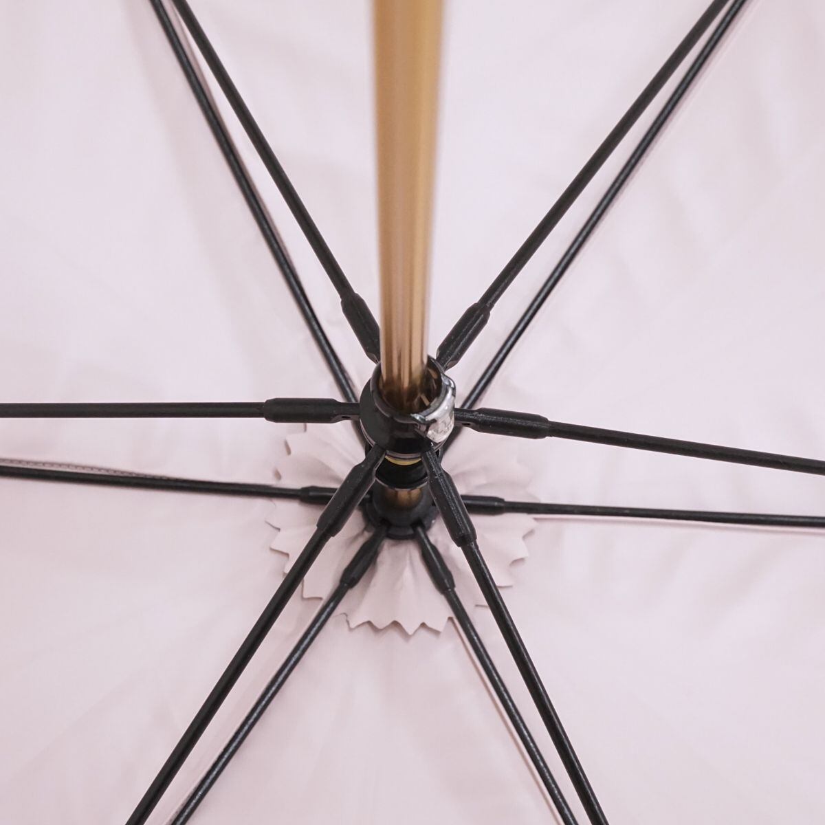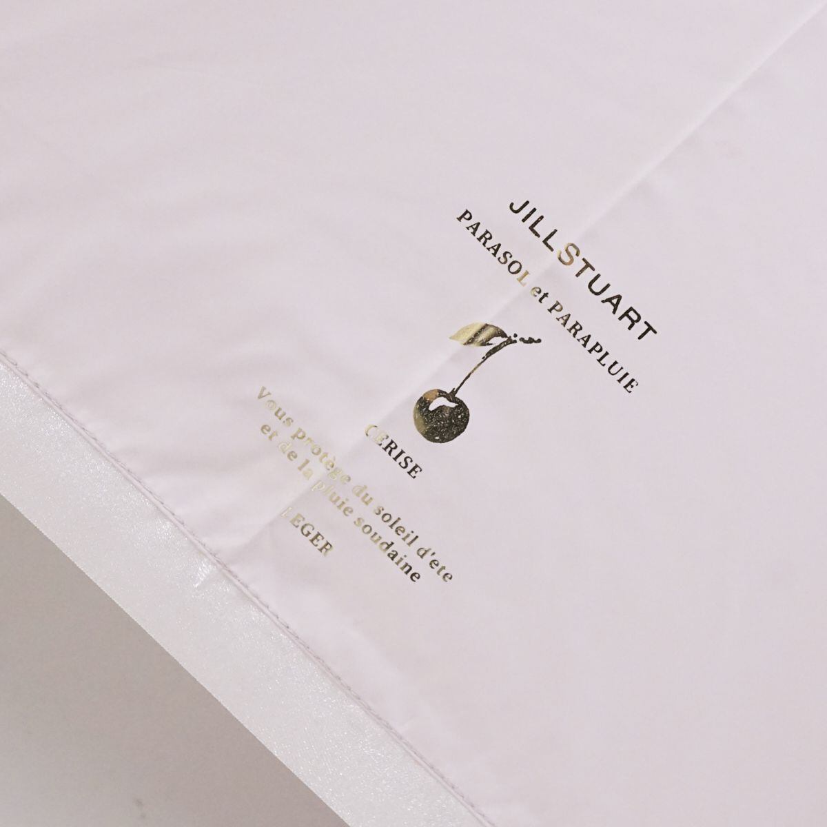 軽くてスマートなグラスファイバーの6本骨で、淡いピンクの生地に中央に入った1コマのチェリーモチーフ箔プリントがアイキャッチになったデザインになっています。
