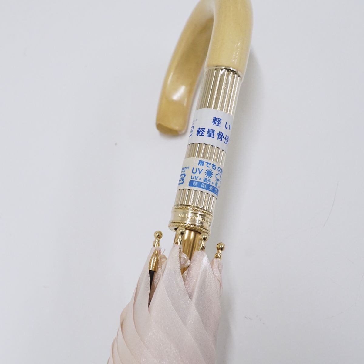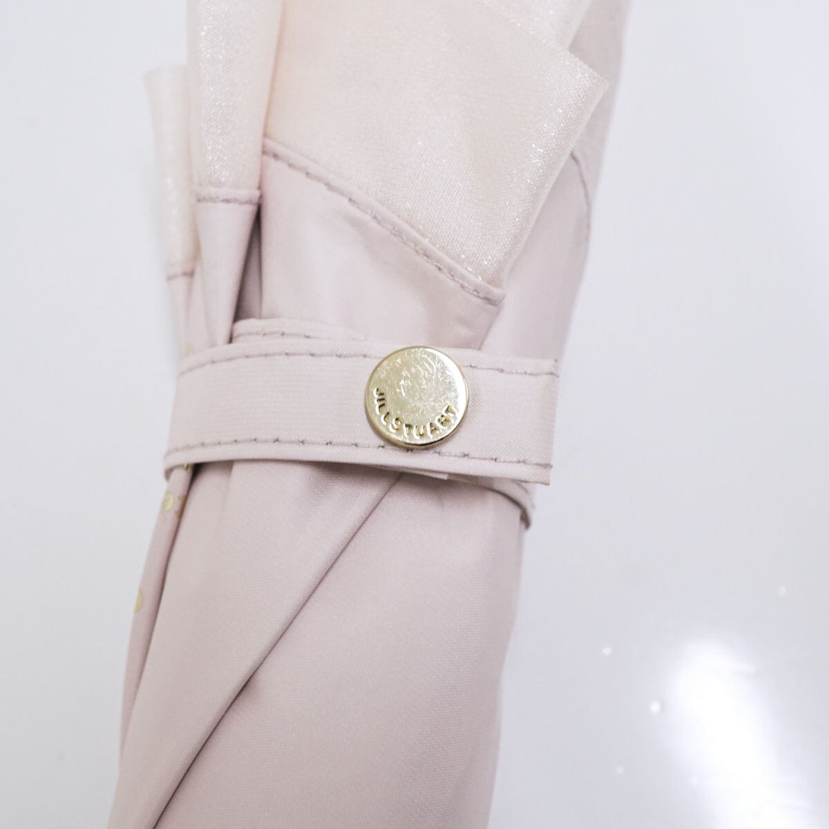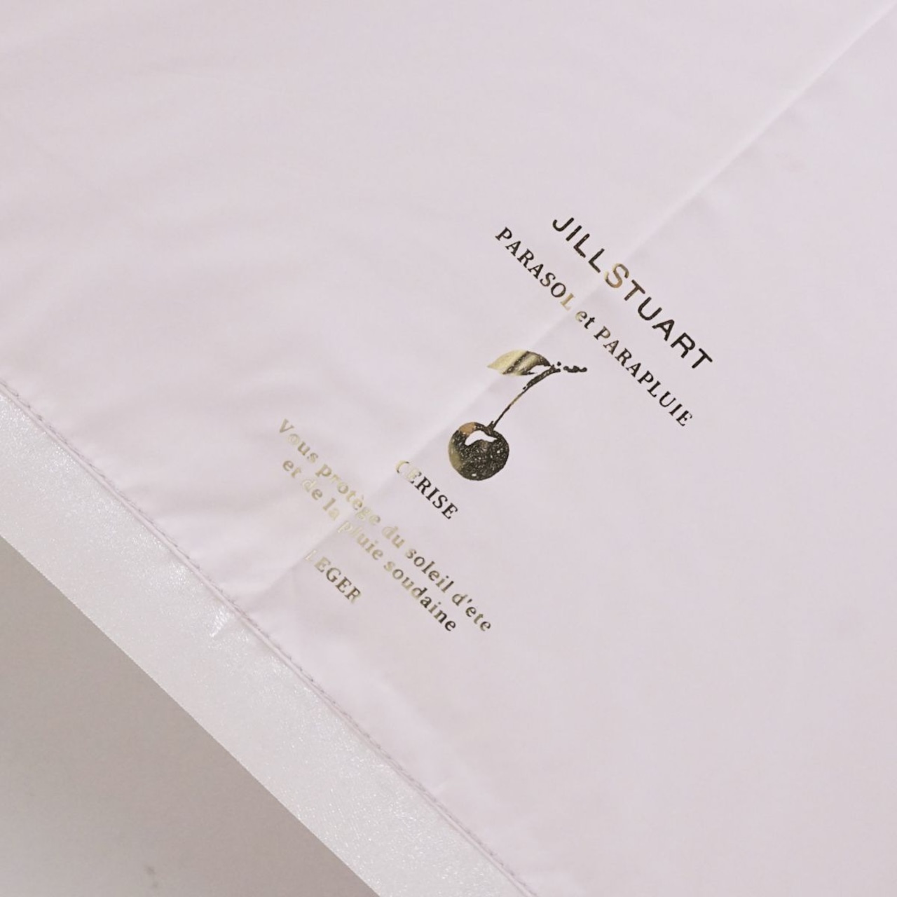 軽くてスマートなグラスファイバーの6本骨で、淡いピンクの生地に中央に入った1コマのチェリーモチーフ箔プリントがアイキャッチになったデザインになっています。