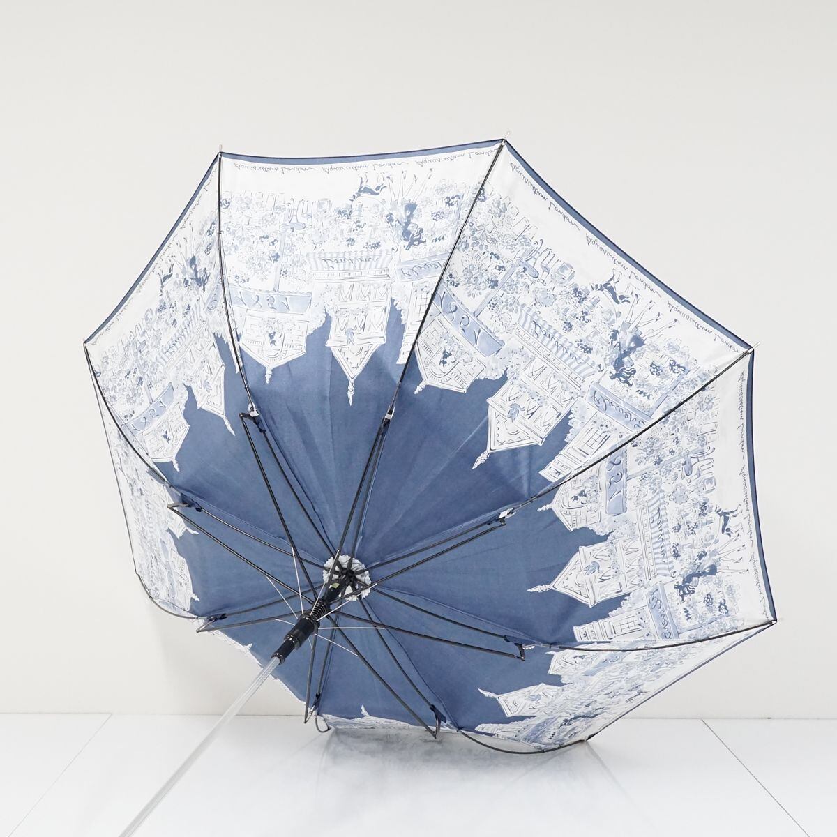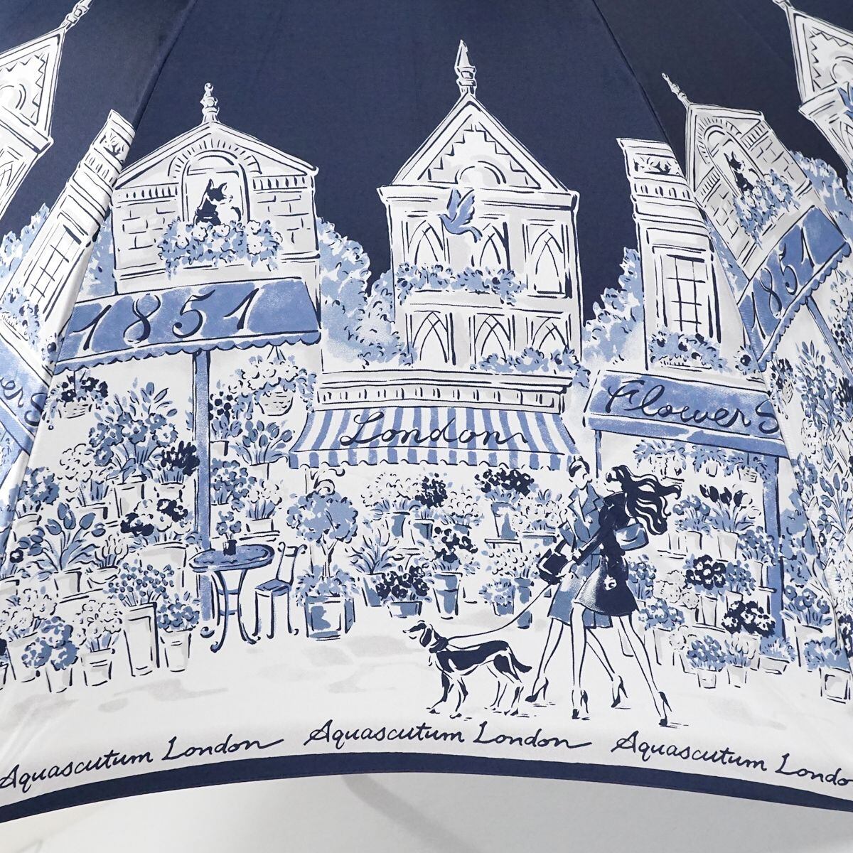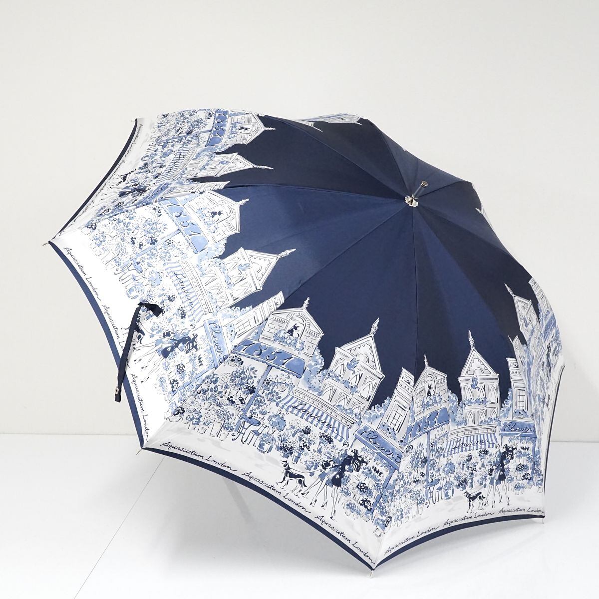 耐風傘 Aquascutum アクアスキュータム USED美品 ネイビー 街並み 女性 犬 イラスト ジャンプ グラス骨 風に強い 60cm A0959