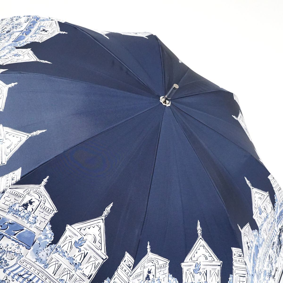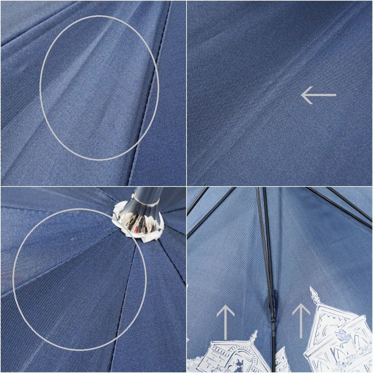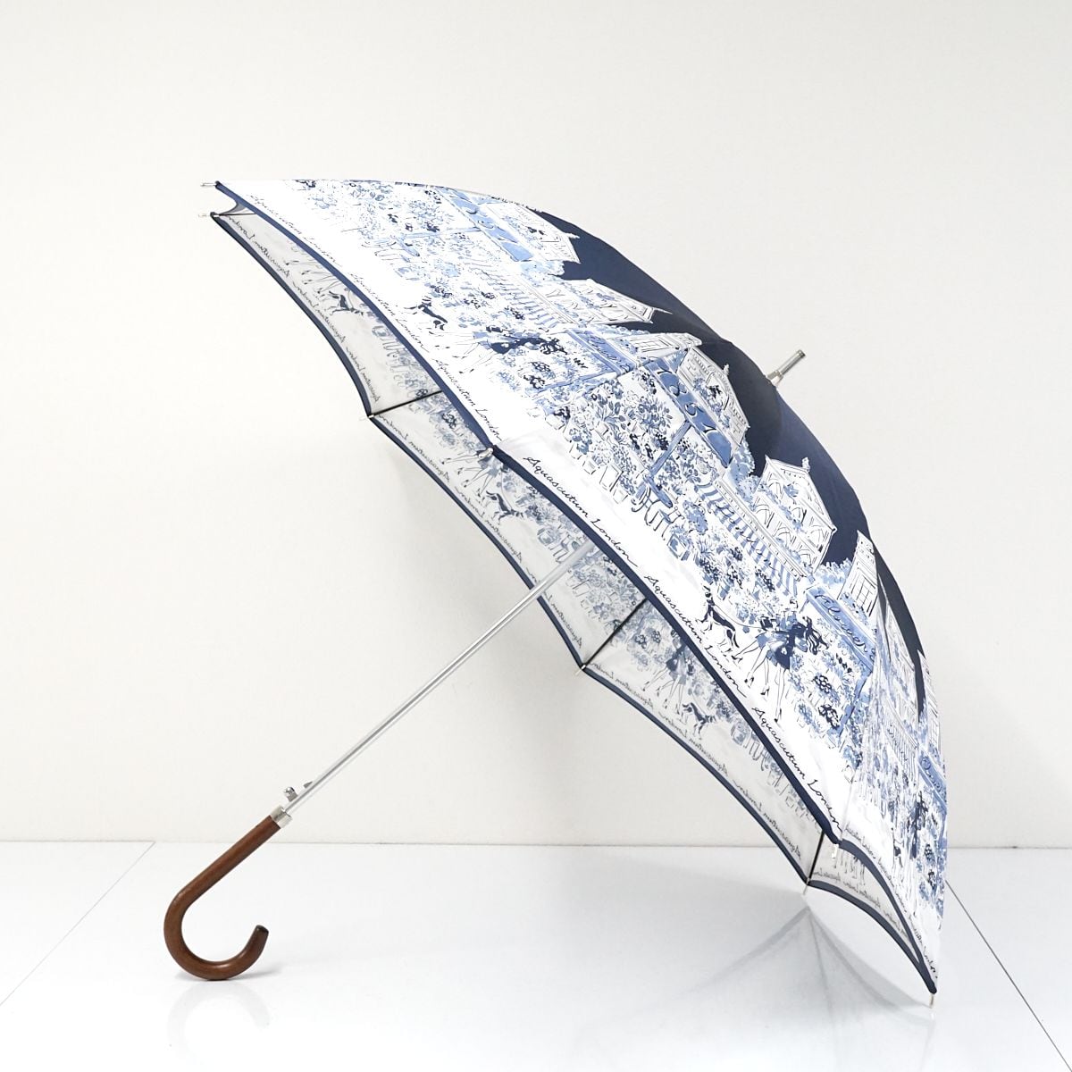 耐風傘 Aquascutum アクアスキュータム USED美品 ネイビー 街並み 女性 犬 イラスト ジャンプ グラス骨 風に強い 60cm A0959