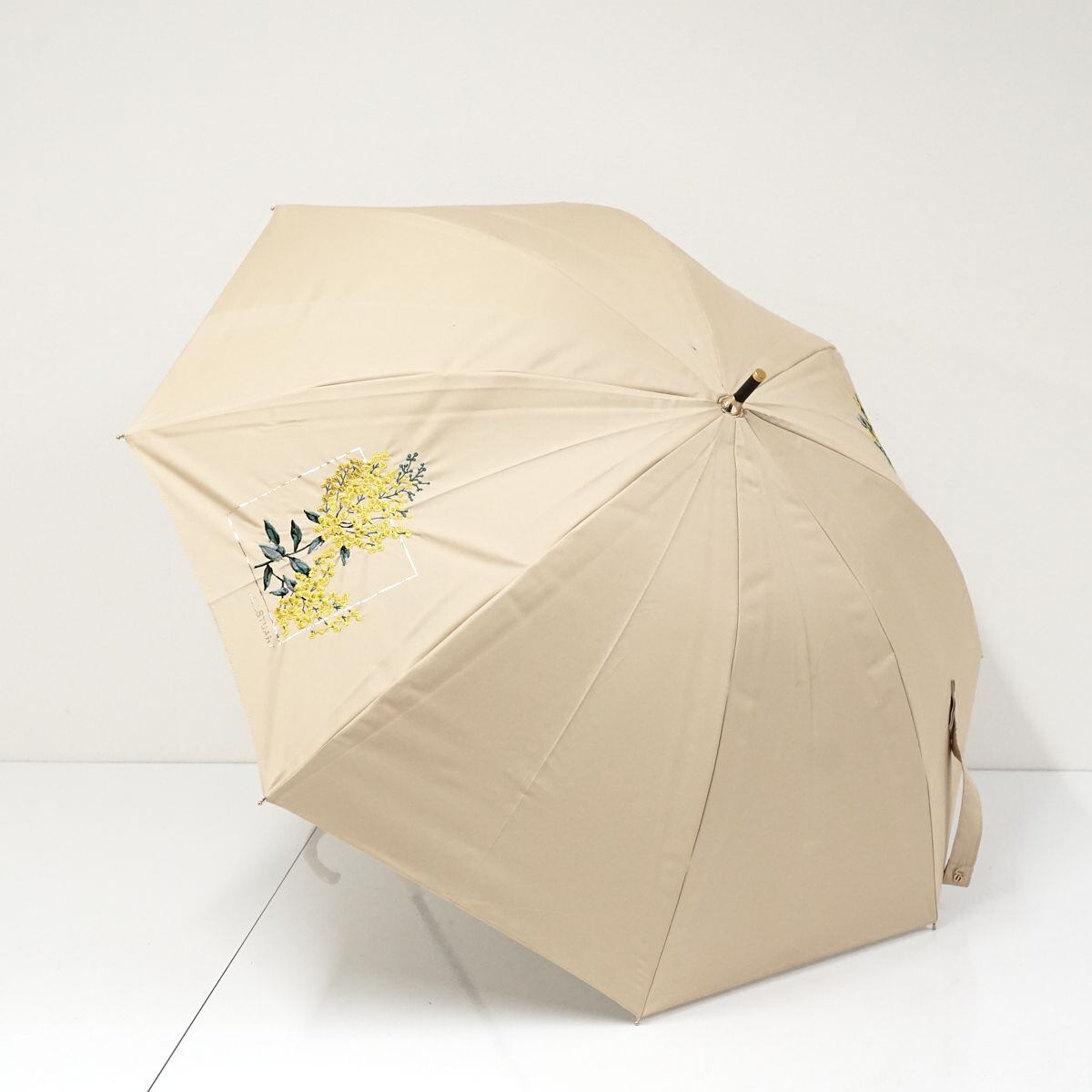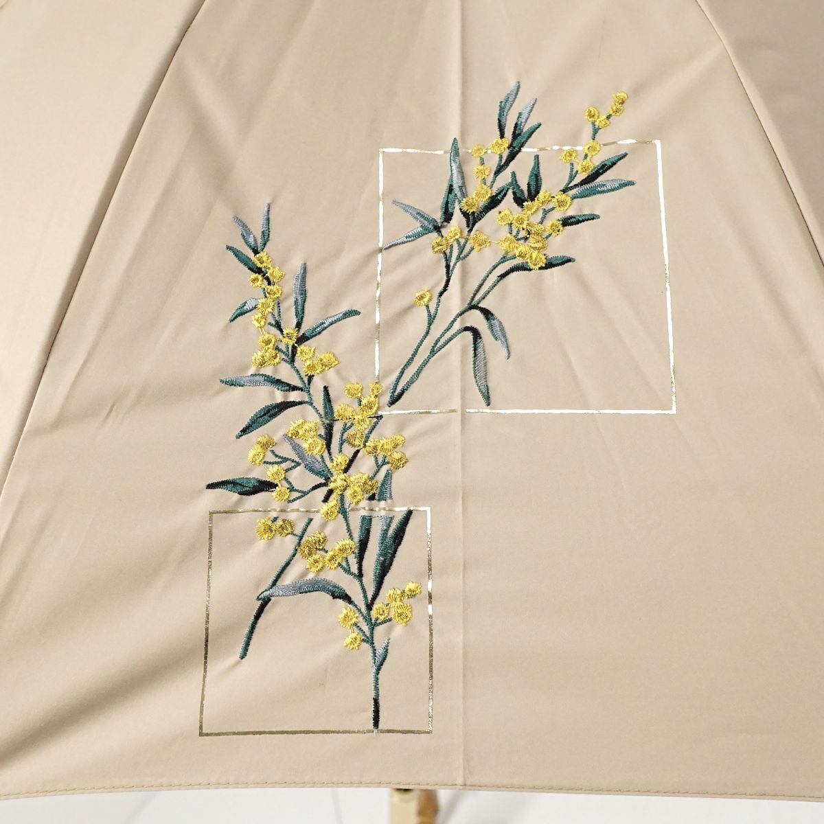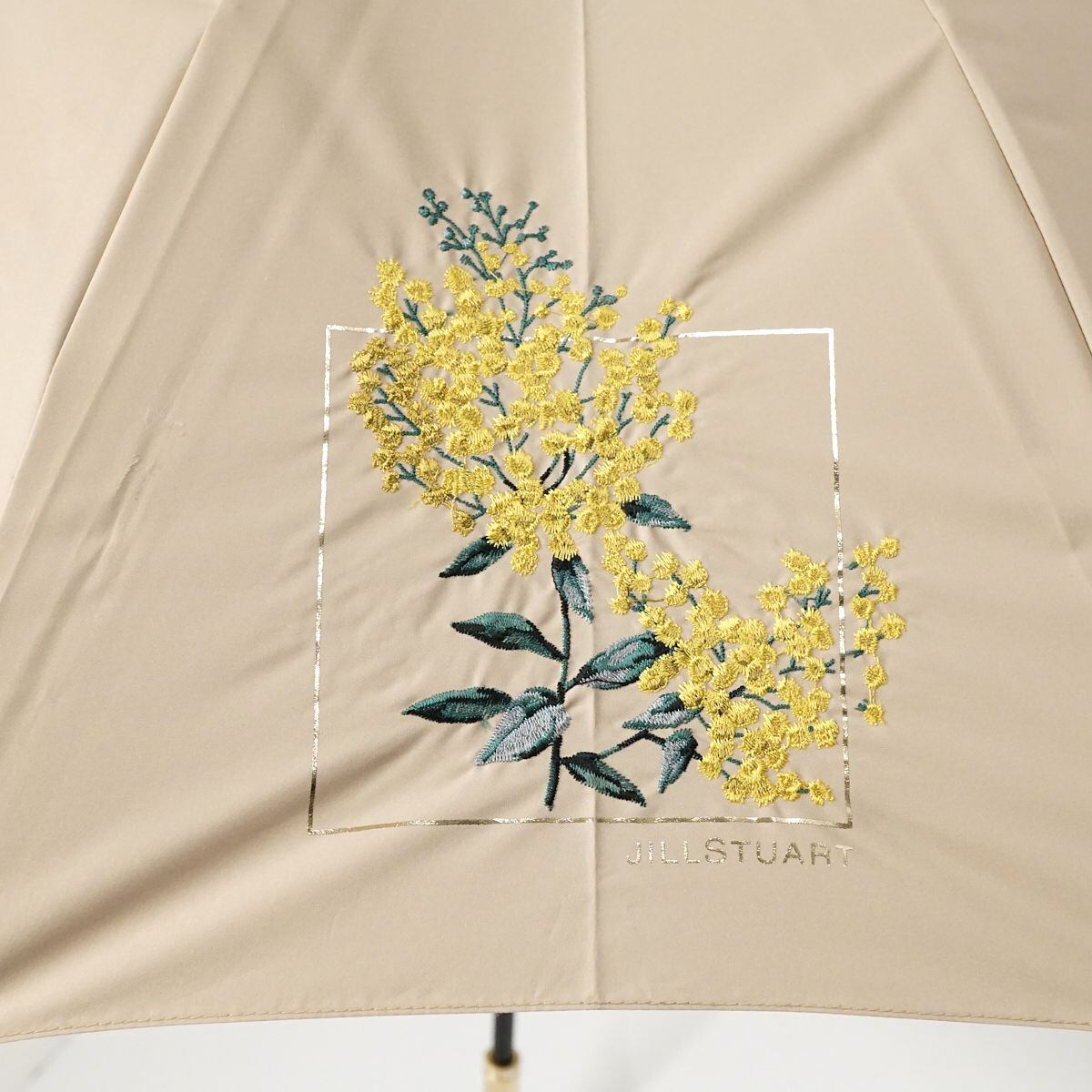 晴雨兼用日傘 JILL STUART ジルスチュアート USED品 ミモザ 花柄刺繍 箔プリント ベージュ UV グラス骨 50cm A1023