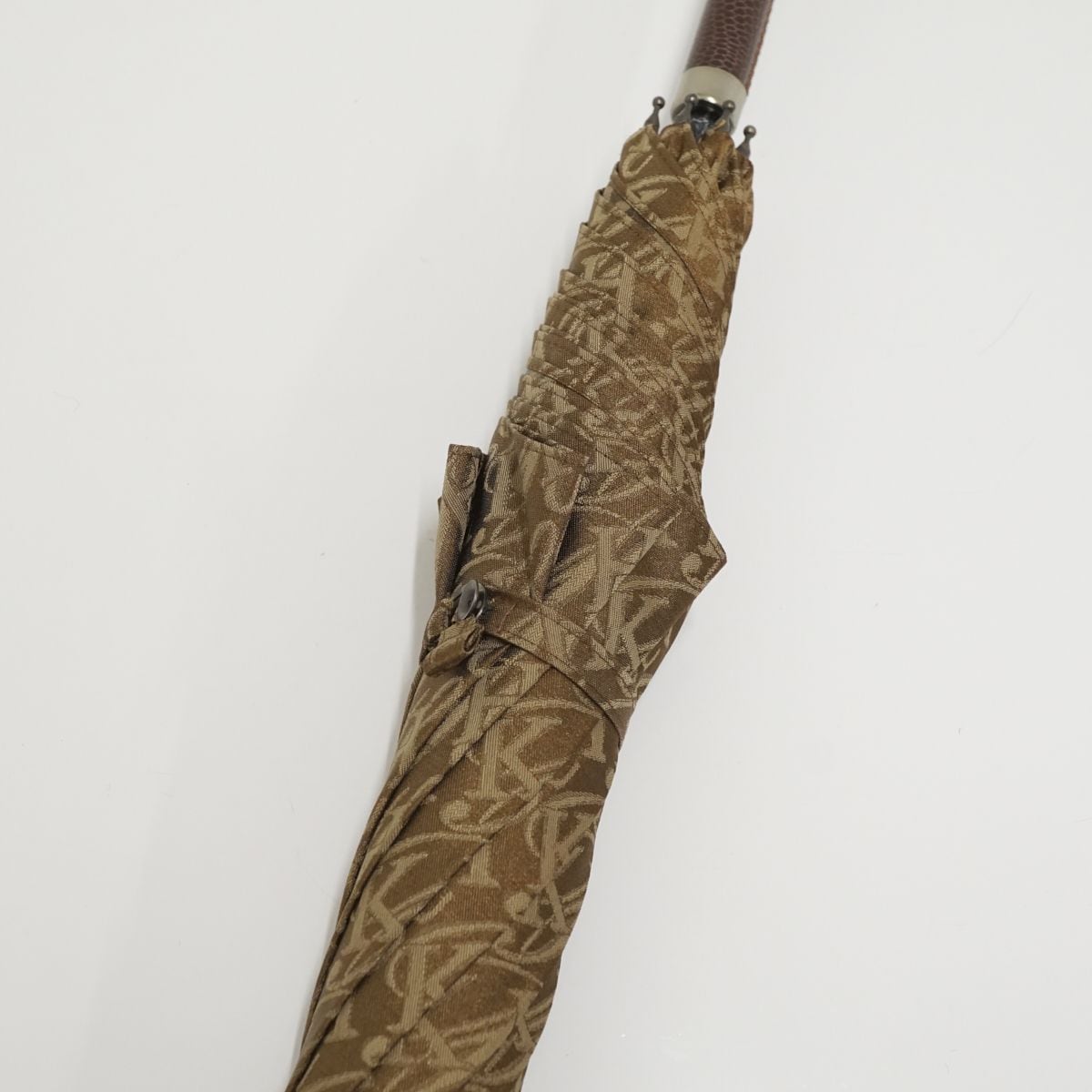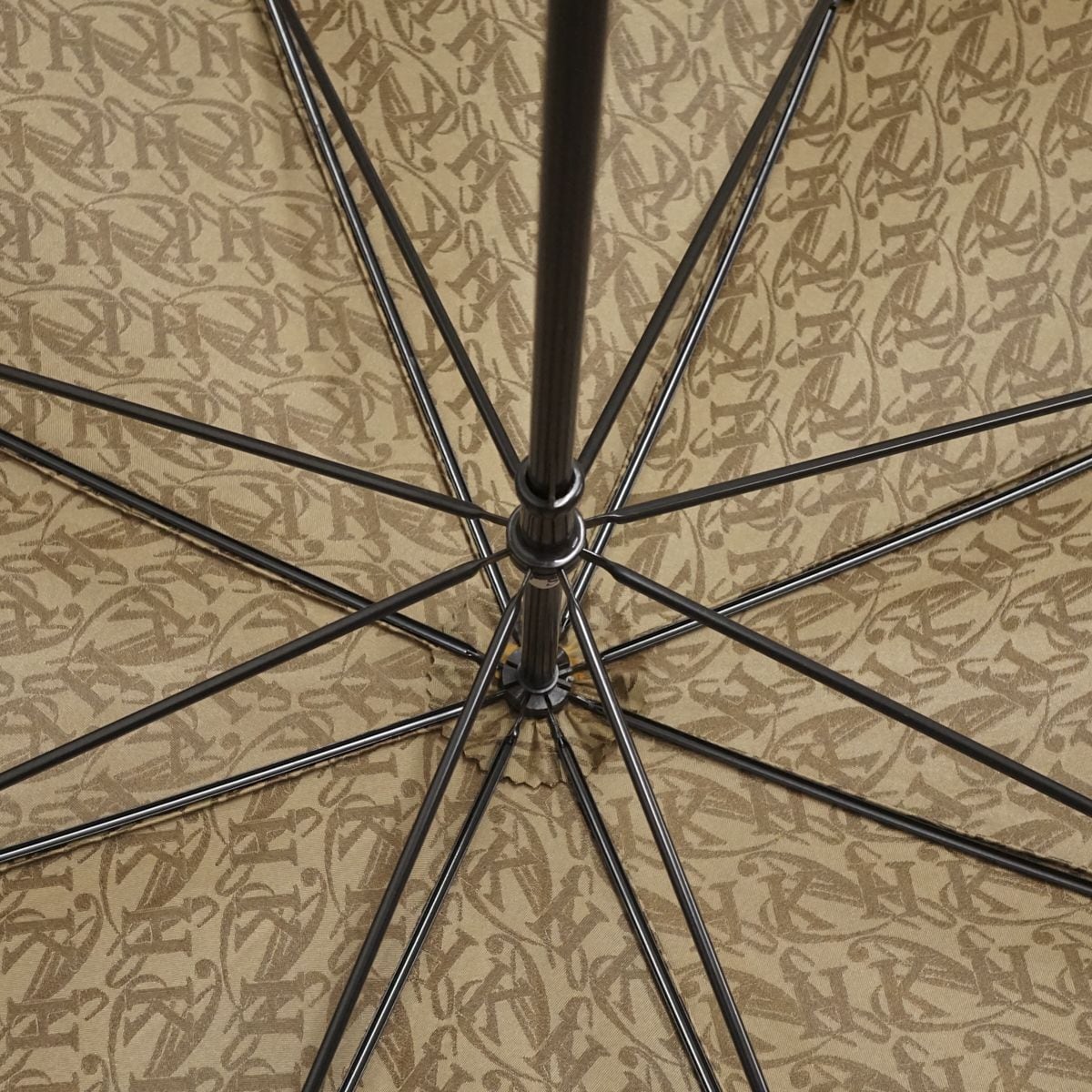 光沢のあるブラウンの生地に「K H」のモノグラムの総柄で、存在感があります。