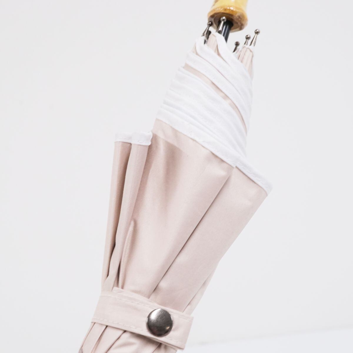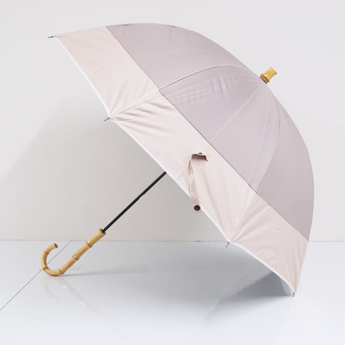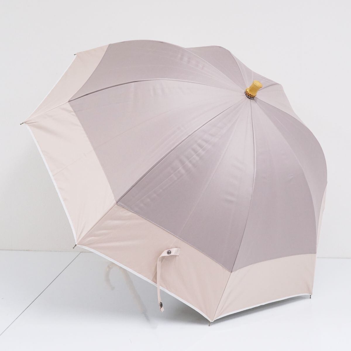 ベージュ系のバイカラーがオシャレなデザインの晴雨兼用日傘です。