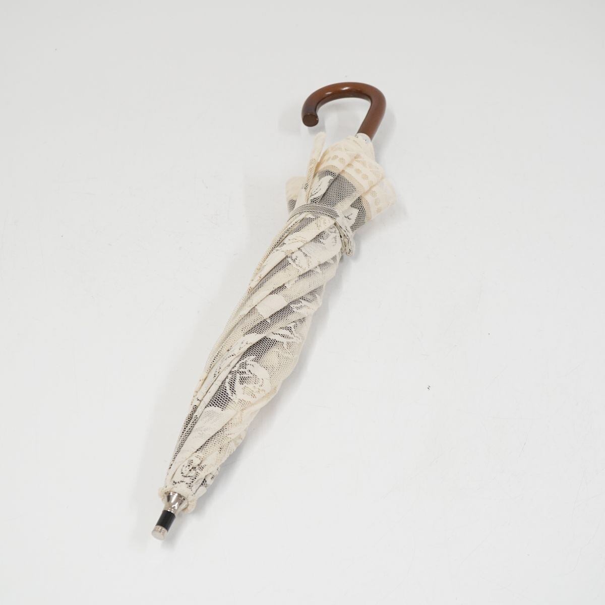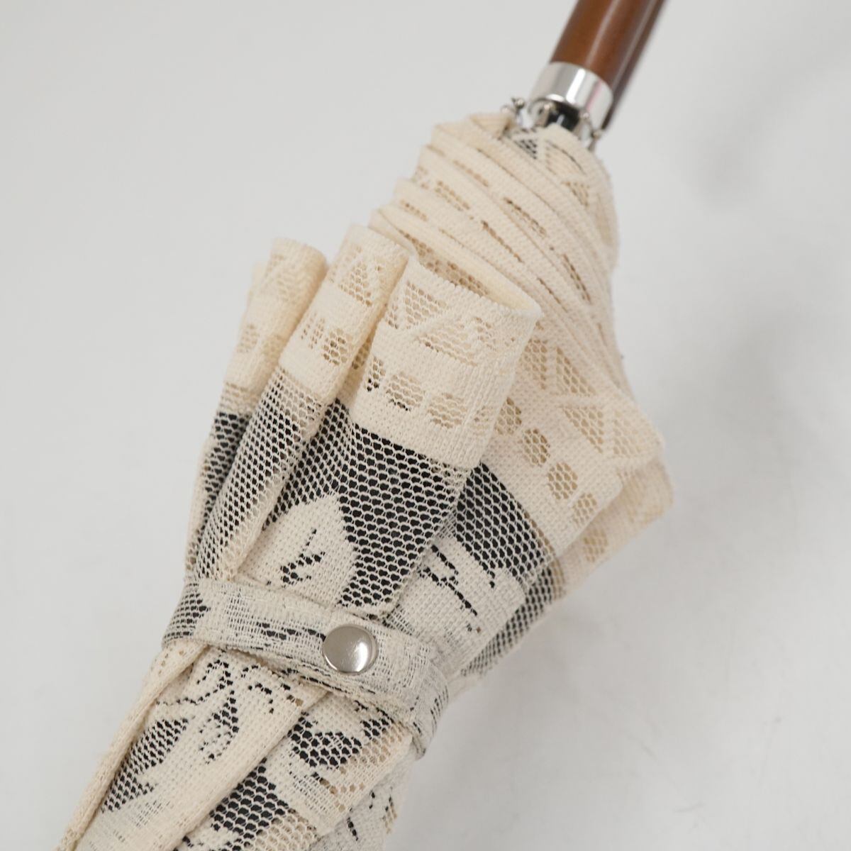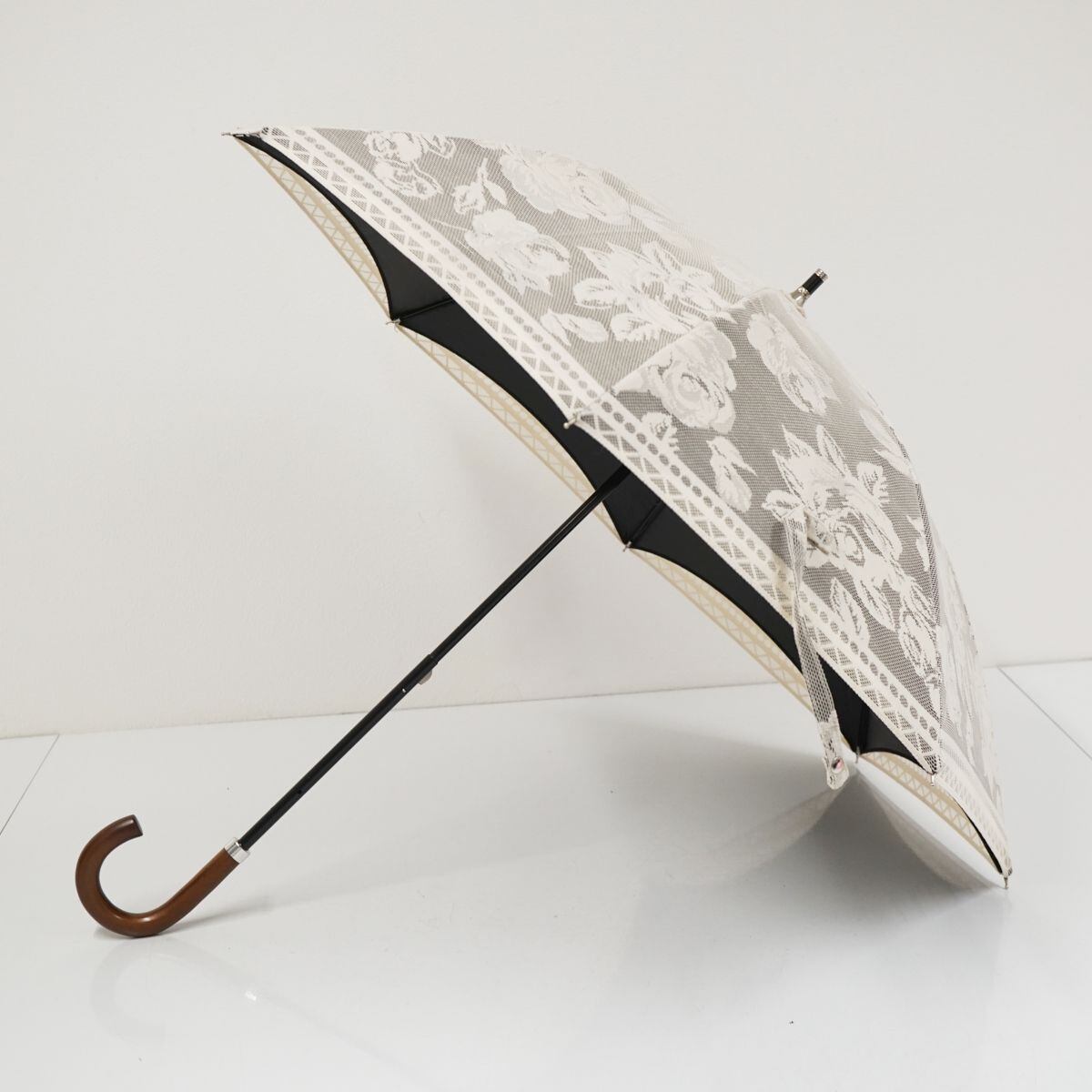 ブロンズ 晴雨兼用日傘 USED美品 レース フラワー ブラック×アイボリー UV 木製手元 二重張り 45cm A1068