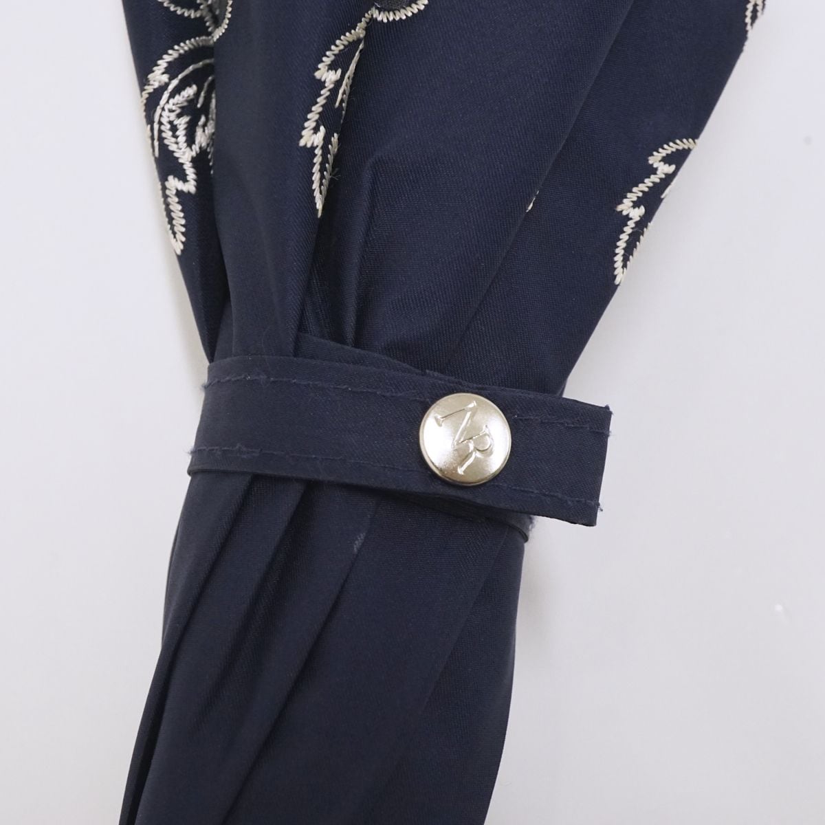 カラーはネイビーで、外周を縁取るシックなフラワー刺繍がおしゃれなデザインです。