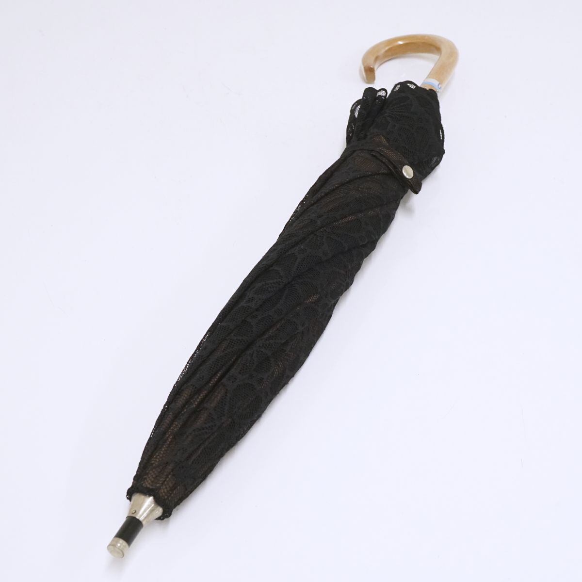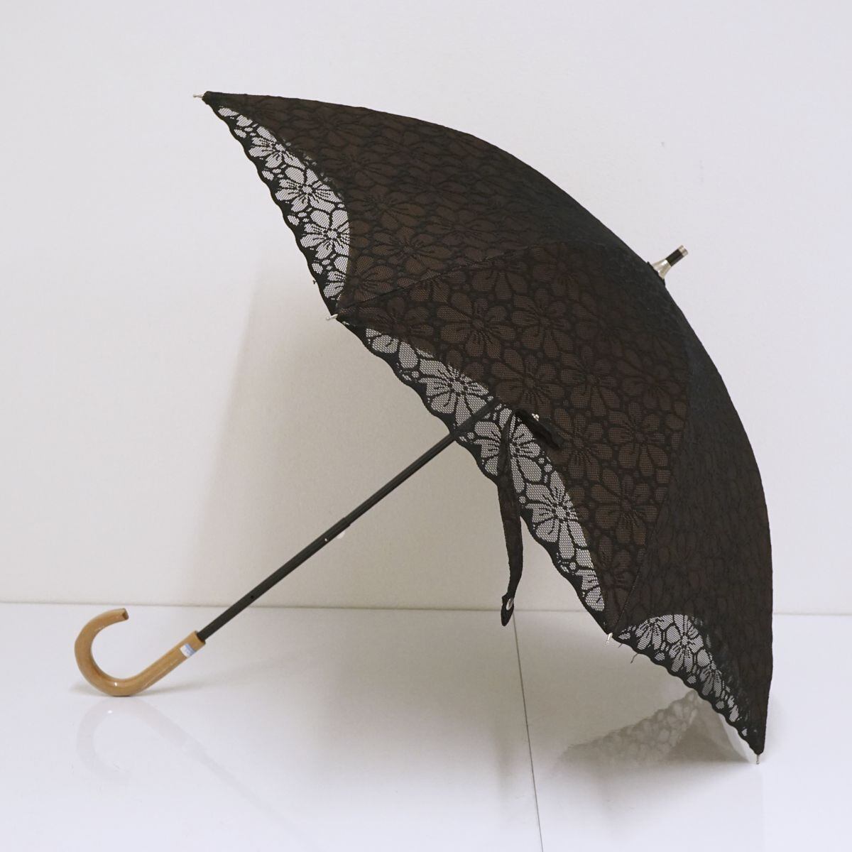 ブロンズ 晴雨兼用日傘 USED美品 レース フラワー ブラウンXブラック UV 木製手元 二重張り 45cm A1073