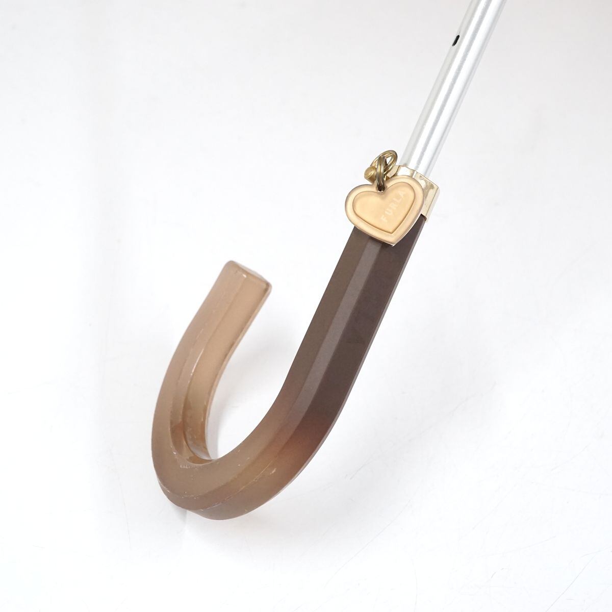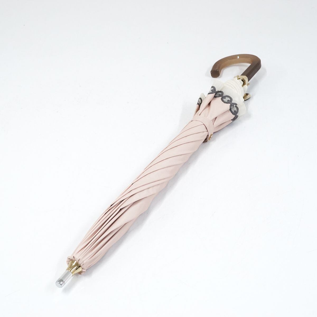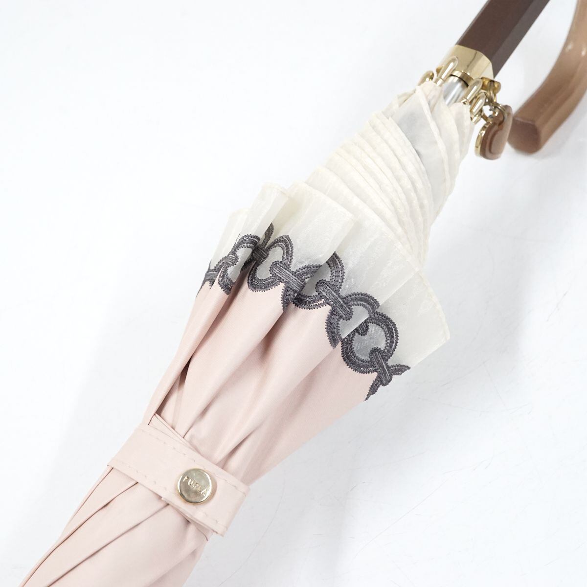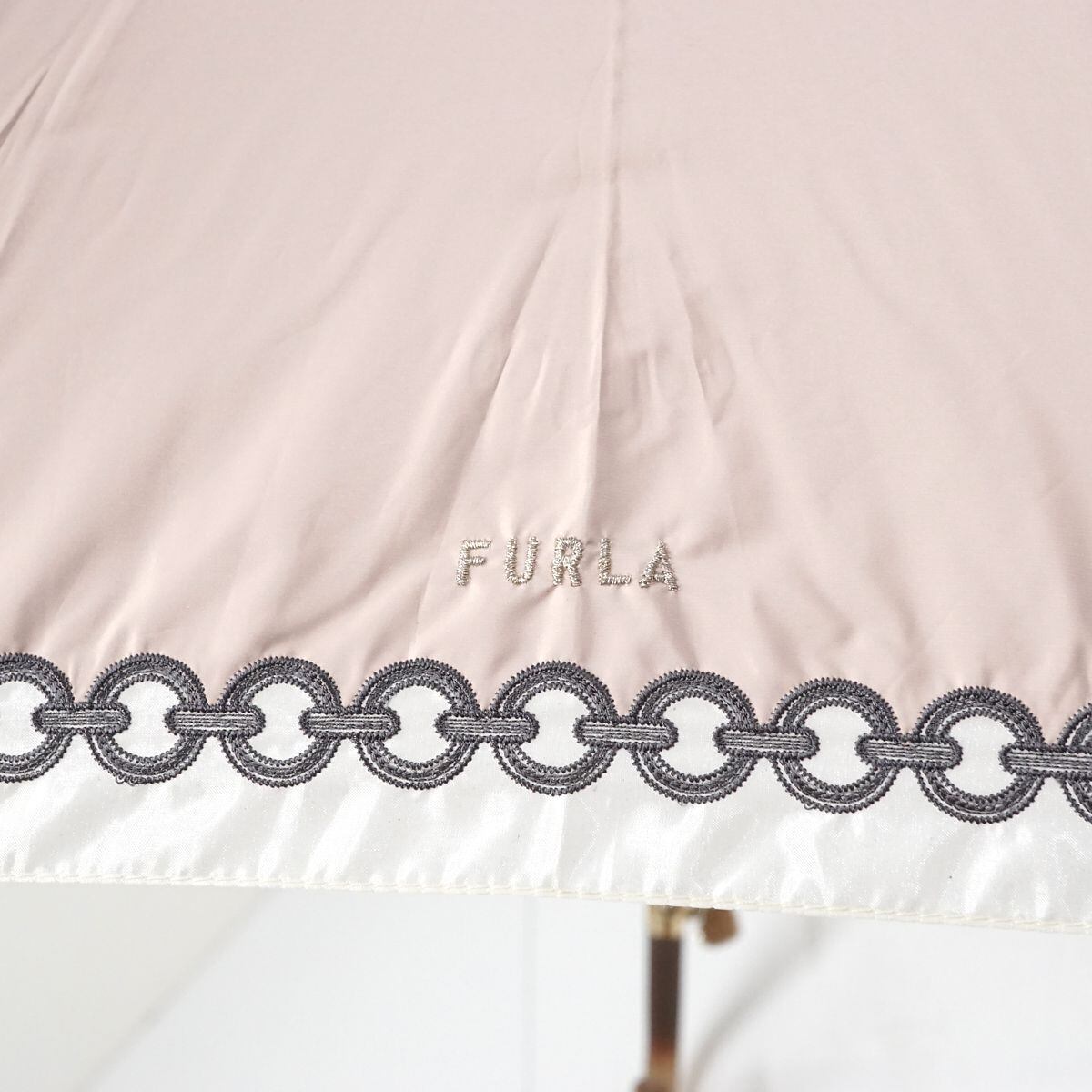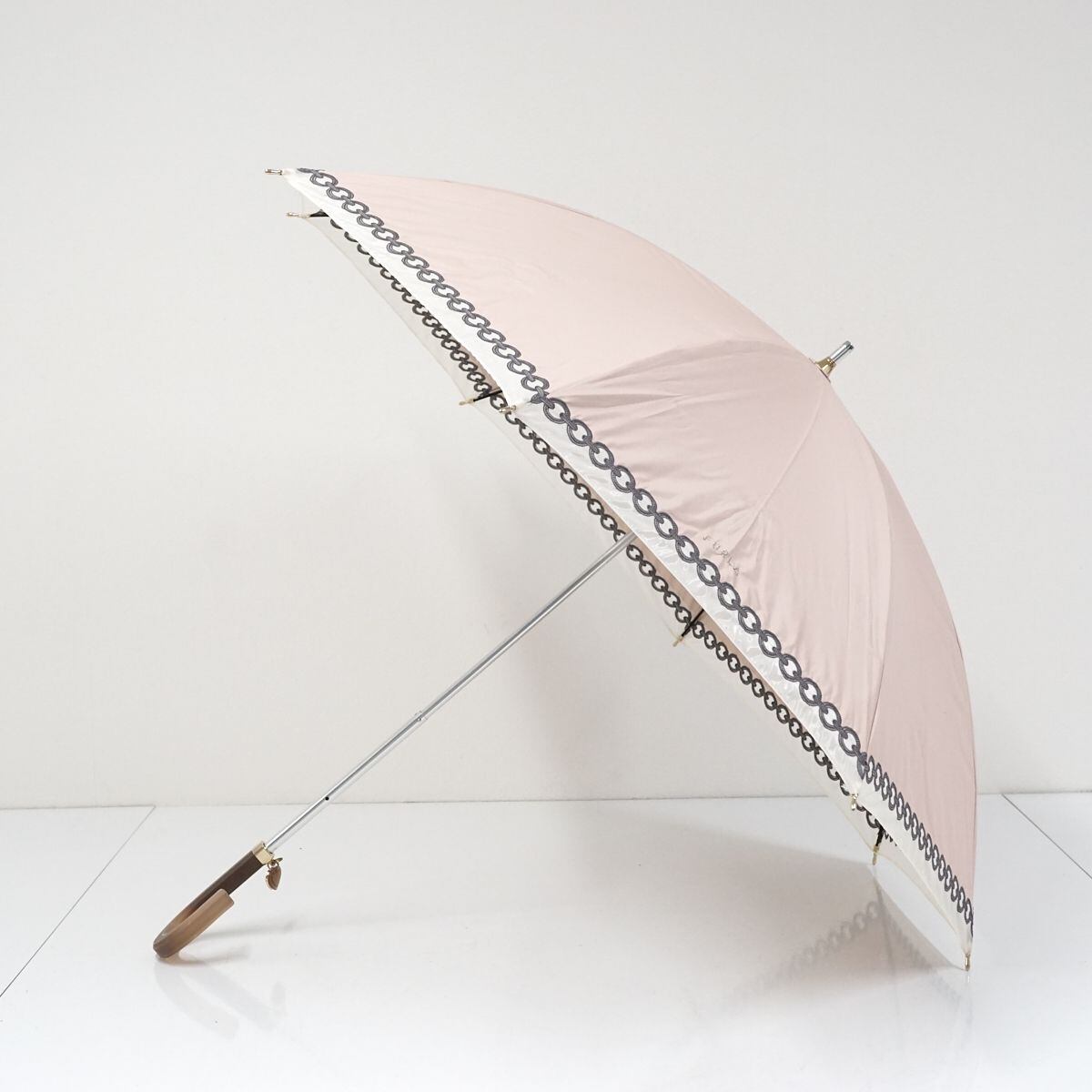 晴雨兼用日傘 FURLA フルラ USED品 オーガンジー ロゴ&チェーン刺繍 ペールピンク ハートチャーム 50cm A1051
