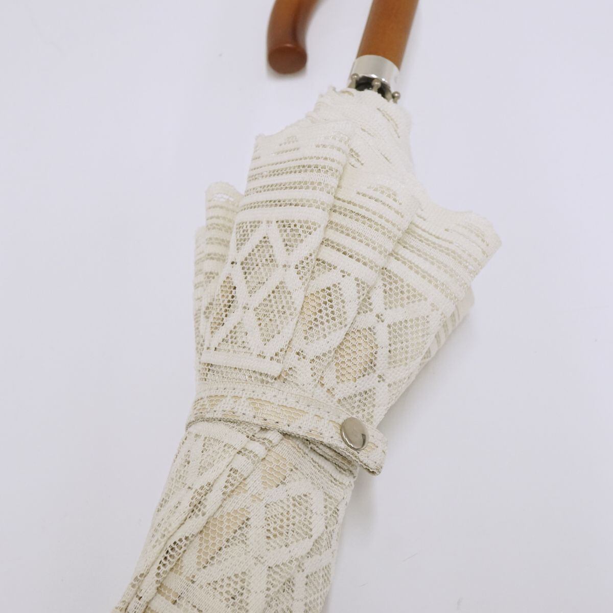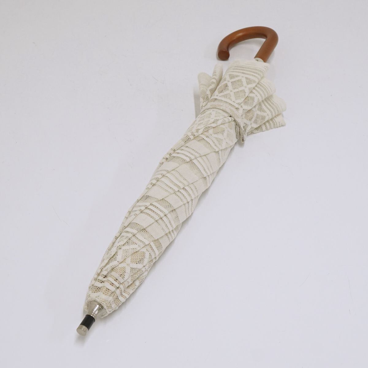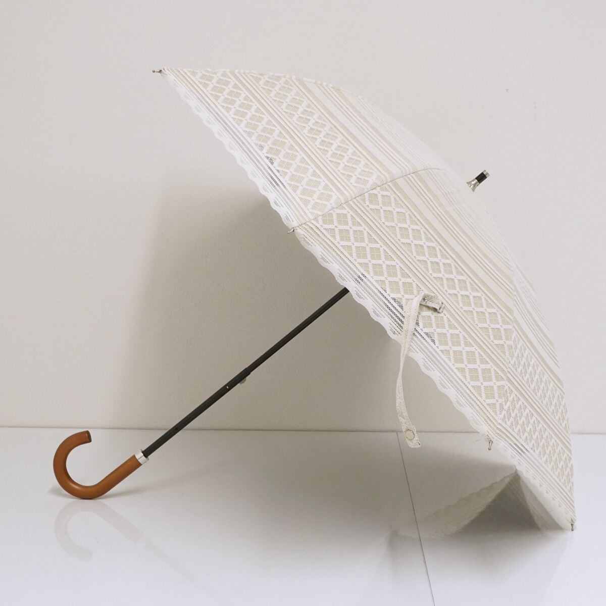 日傘 ブロンズ USED 美品レース 二重張り ボーダー ベージュXホワイト 遮光 晴雨兼用 UV 45cm A1082