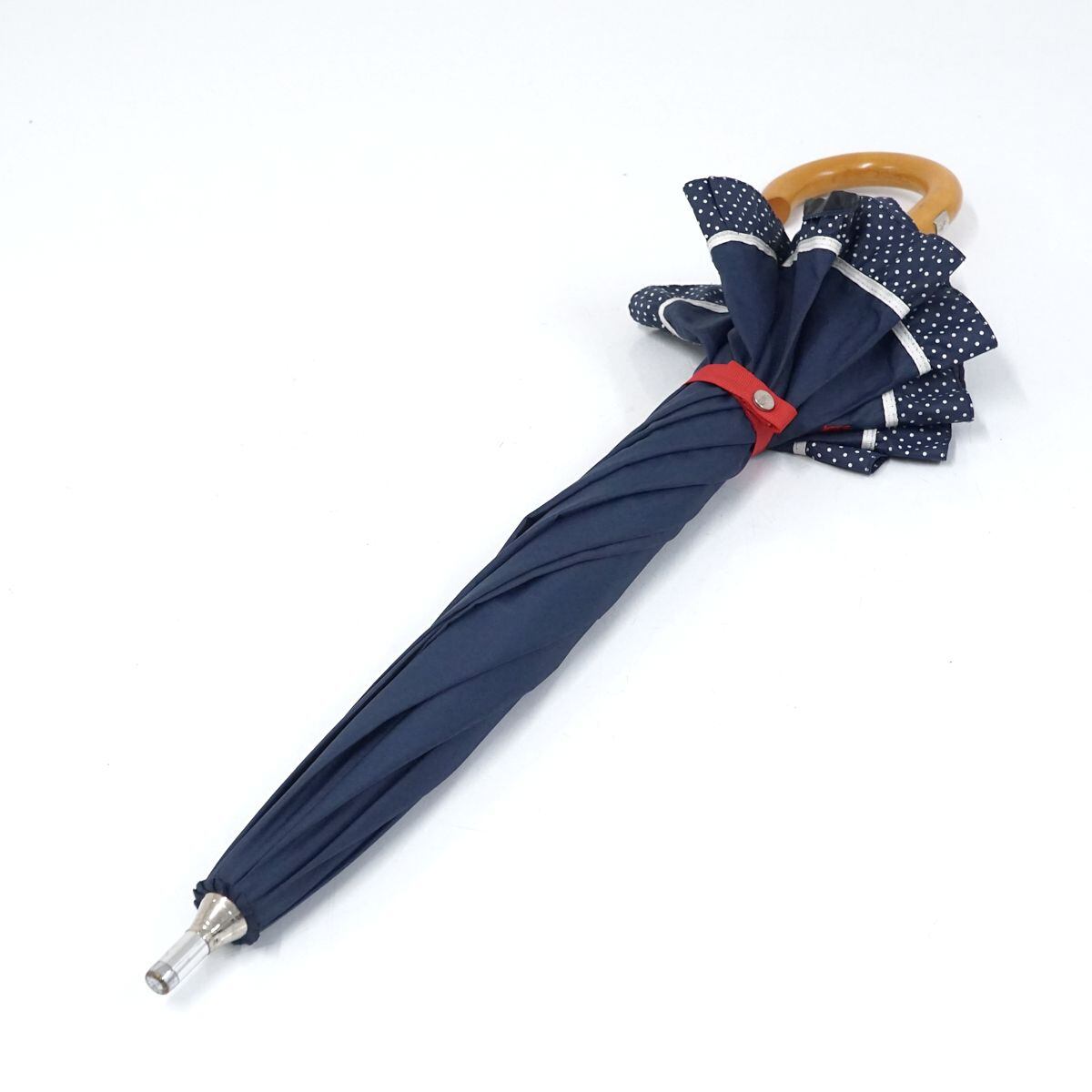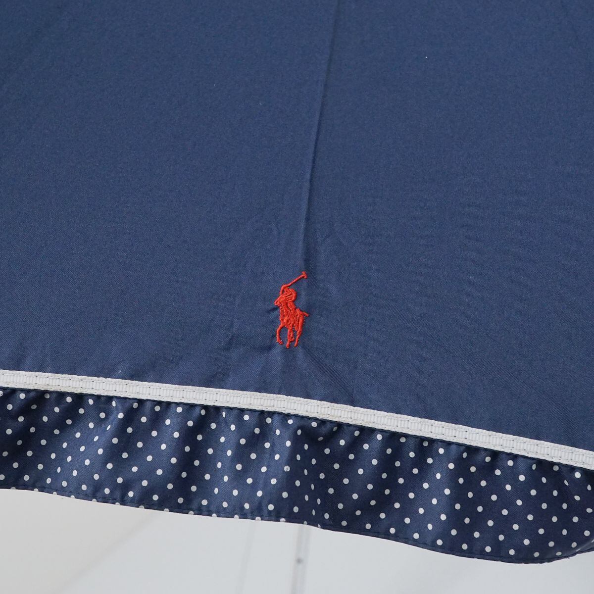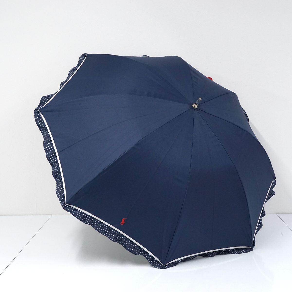 晴雨兼用日傘 POLO RALPH LAUREN ポロラルフローレン USED品 フリル ドット ポニー刺繍 ネイビー グラス骨 UV 木製手元 50cm S1078