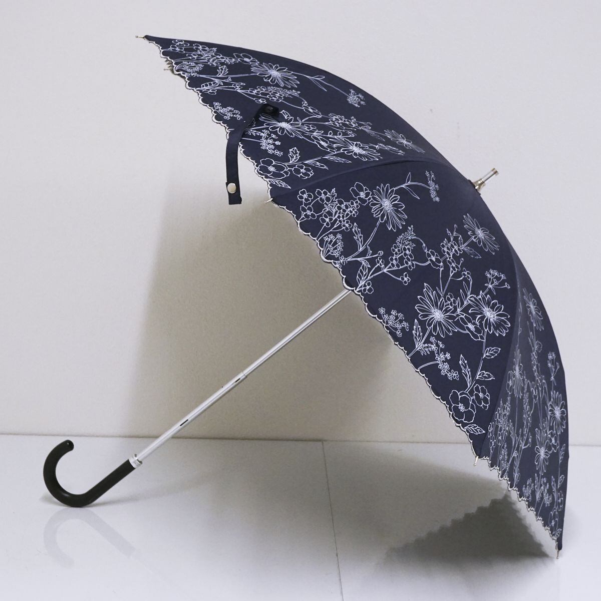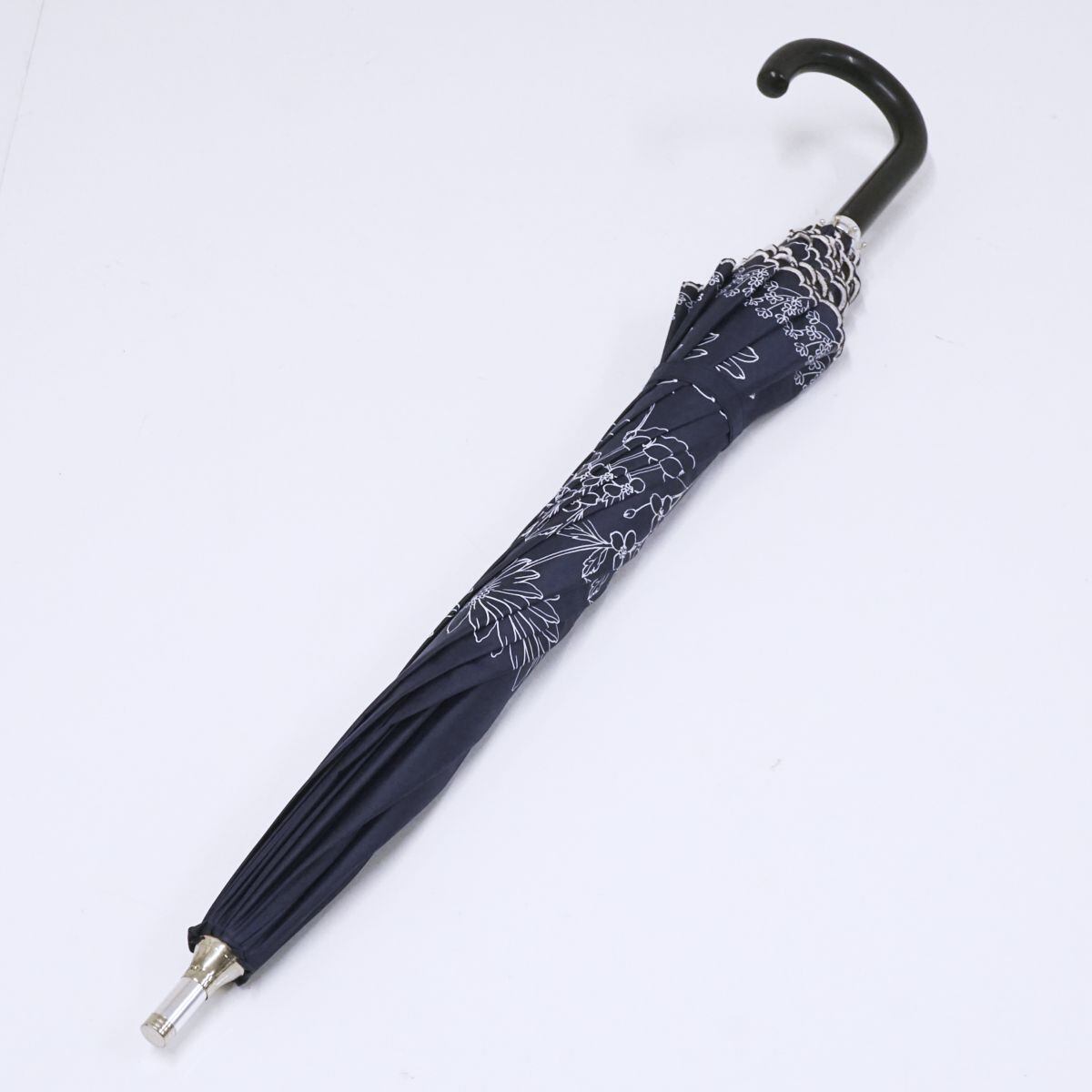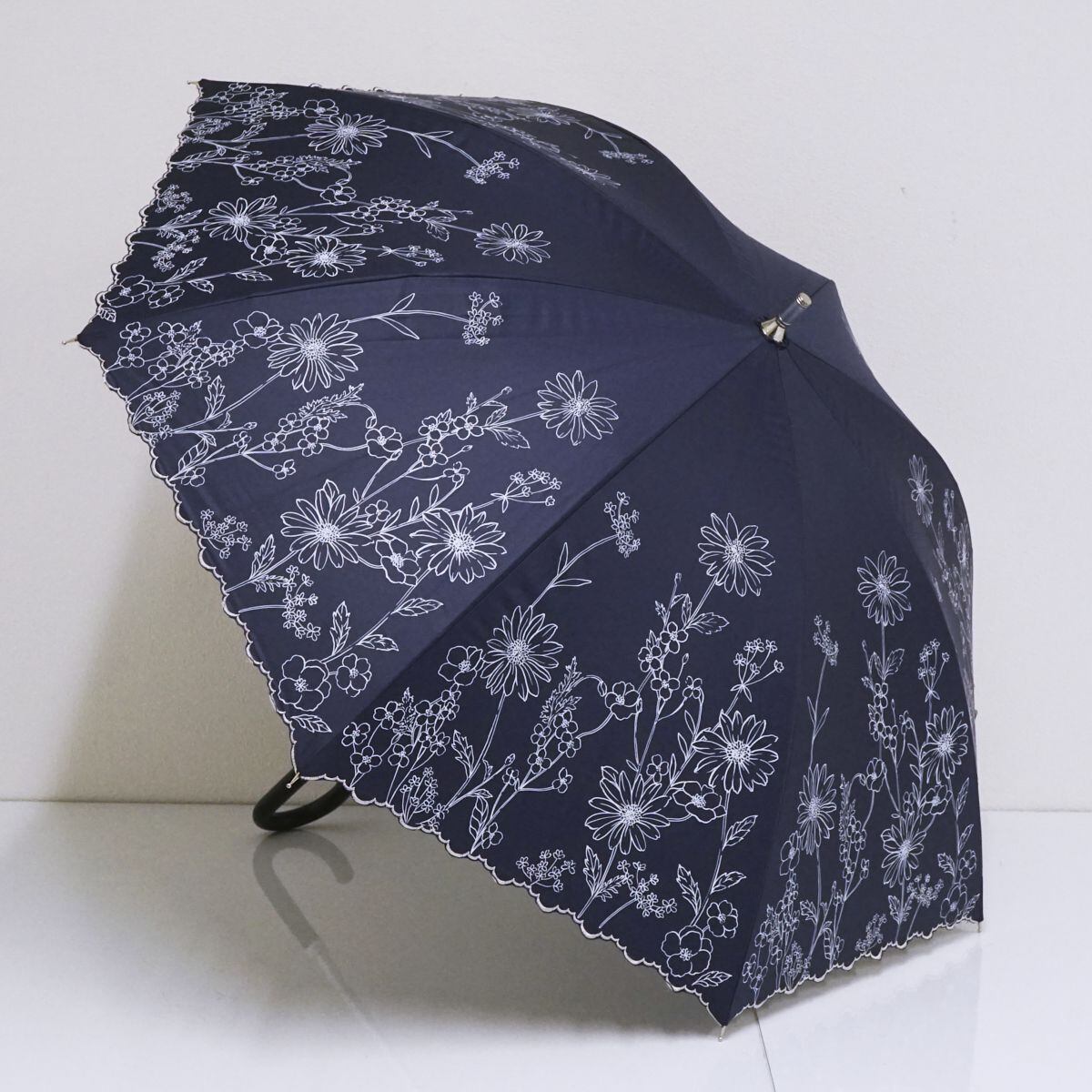 ネイビーの生地に花柄プリントが華やかなデザインのパラソルです。