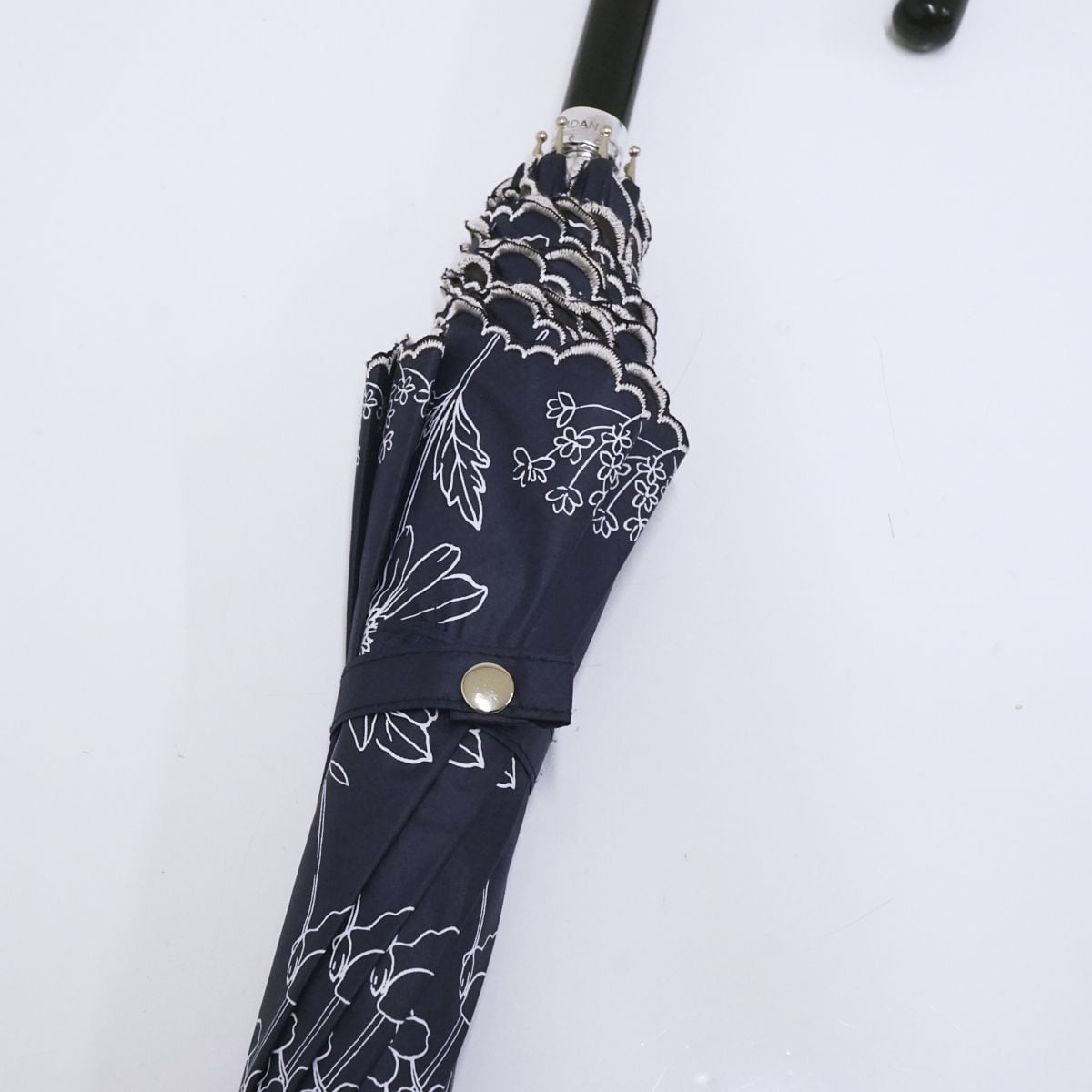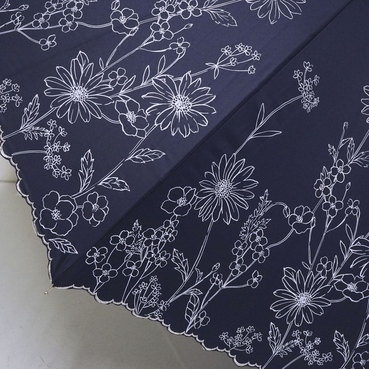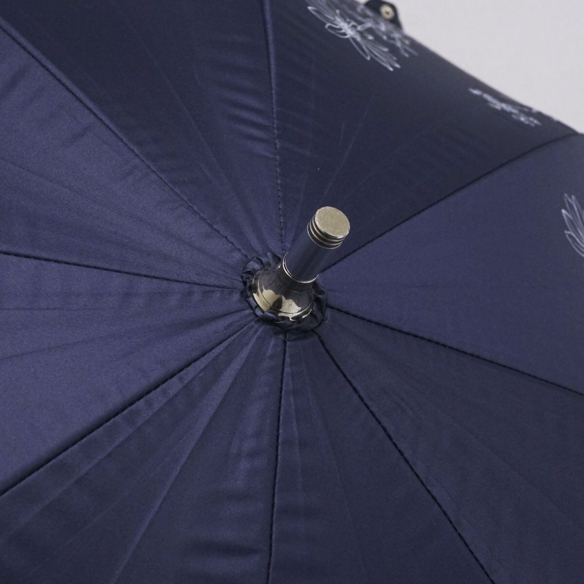 ネイビーの生地に花柄プリントが華やかなデザインのパラソルです。