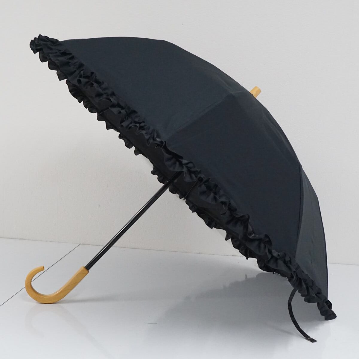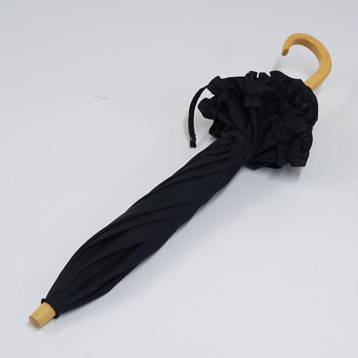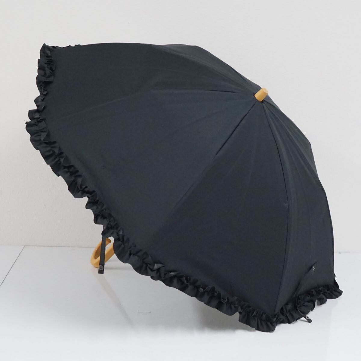 完全遮光折日傘 サンバリア100 USED美品 2段折 フリル ブラック 黒 木製手元 UVカット 遮光 遮熱 折りたたみ日傘 50cm FS9238