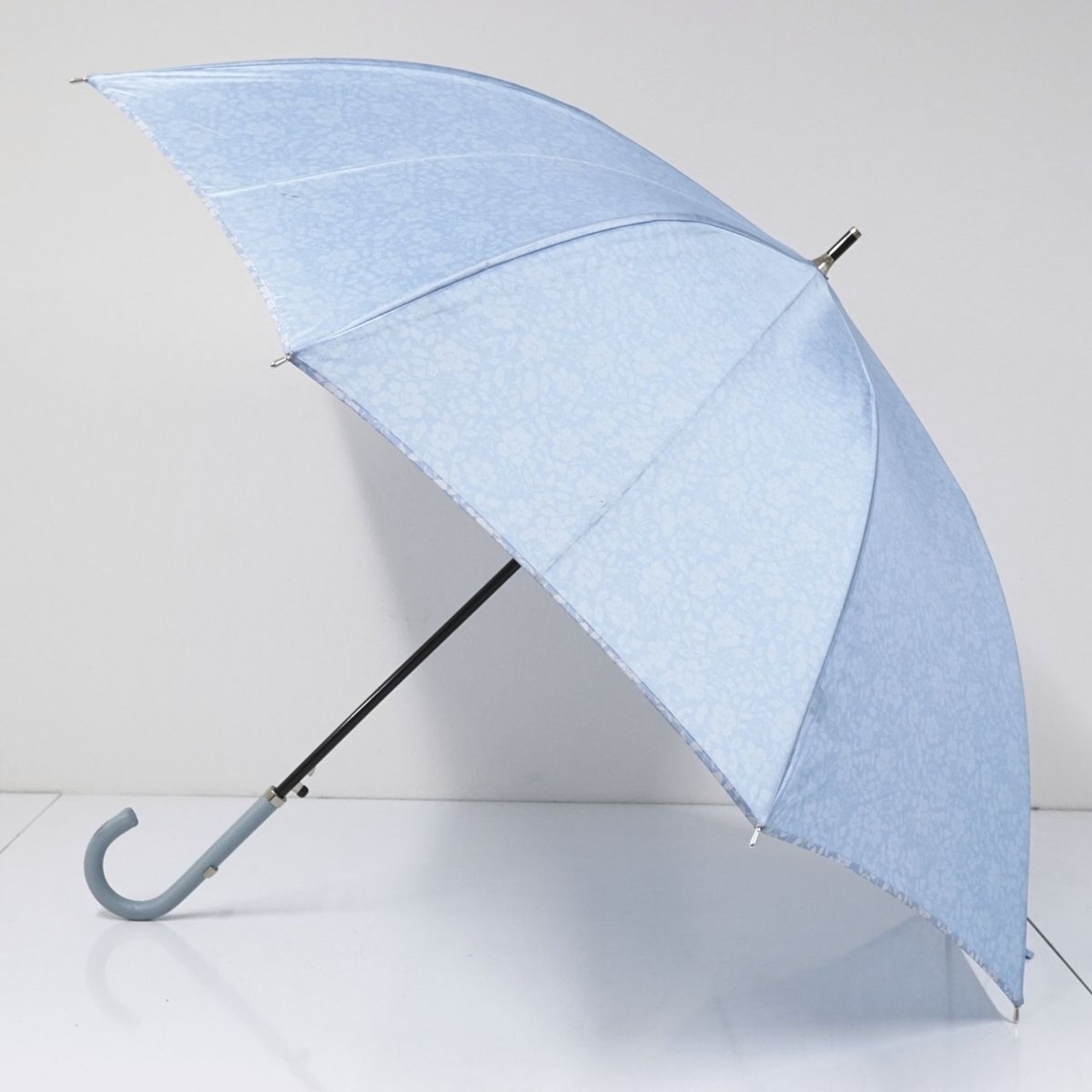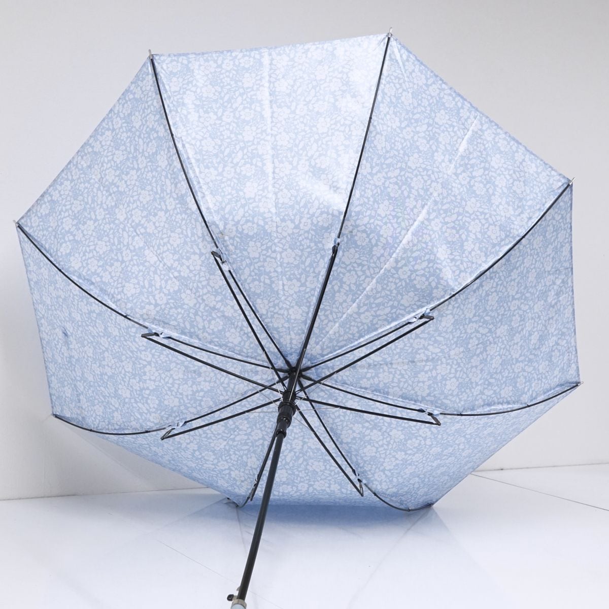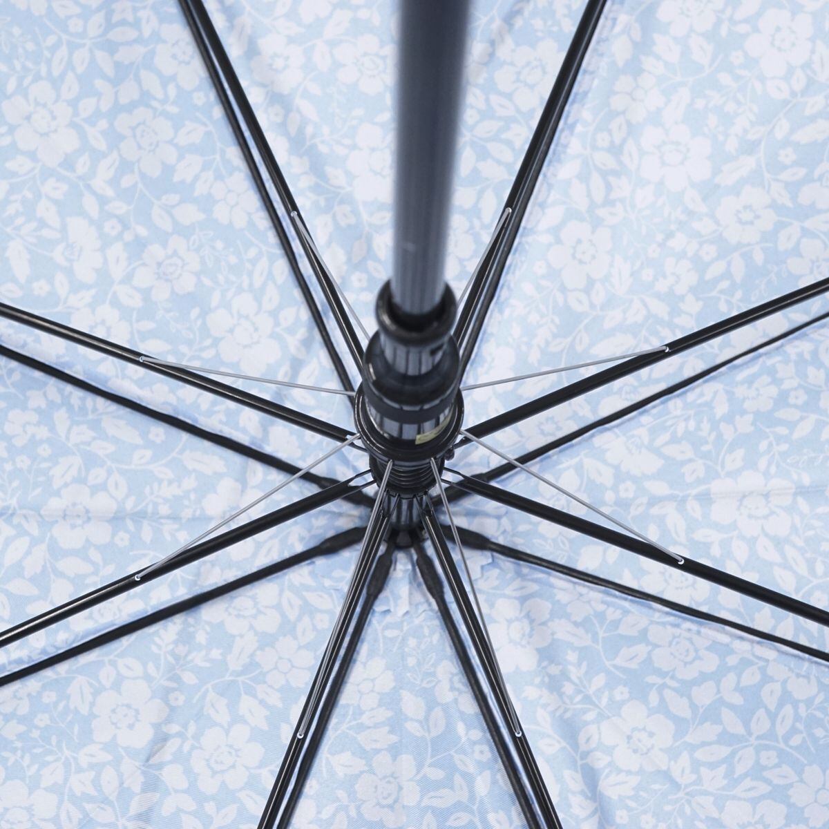 ライトブルー系の生地に内側は満開の小花柄のプリントを施したデザインです。