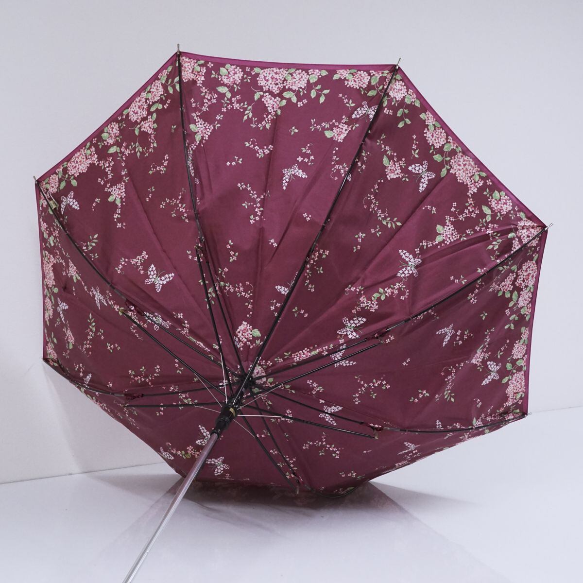 耐風傘 NINA RICCI ニナリッチ USED美品 パープル ぶどう色 花柄 ジャンプ グラス骨 60cm A1166