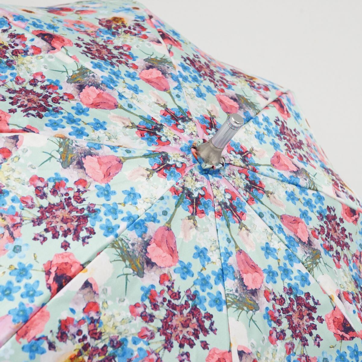 ミントグリーンの生地に総柄のフラワーデザインがアーティスティックなデザインです。