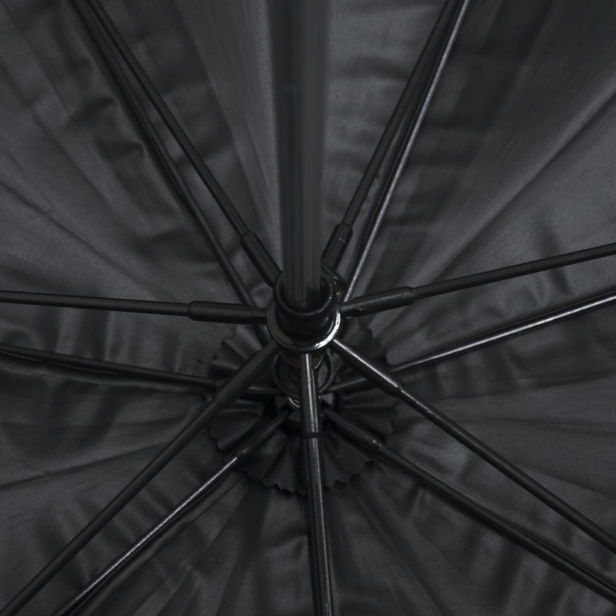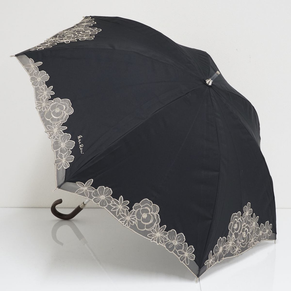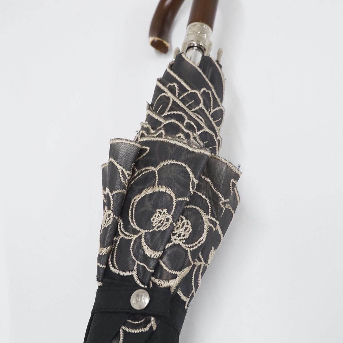 ブラックの生地に外周をオーガンジーレースとフラワー刺繍で囲んだエレガントなデザインの傘です。