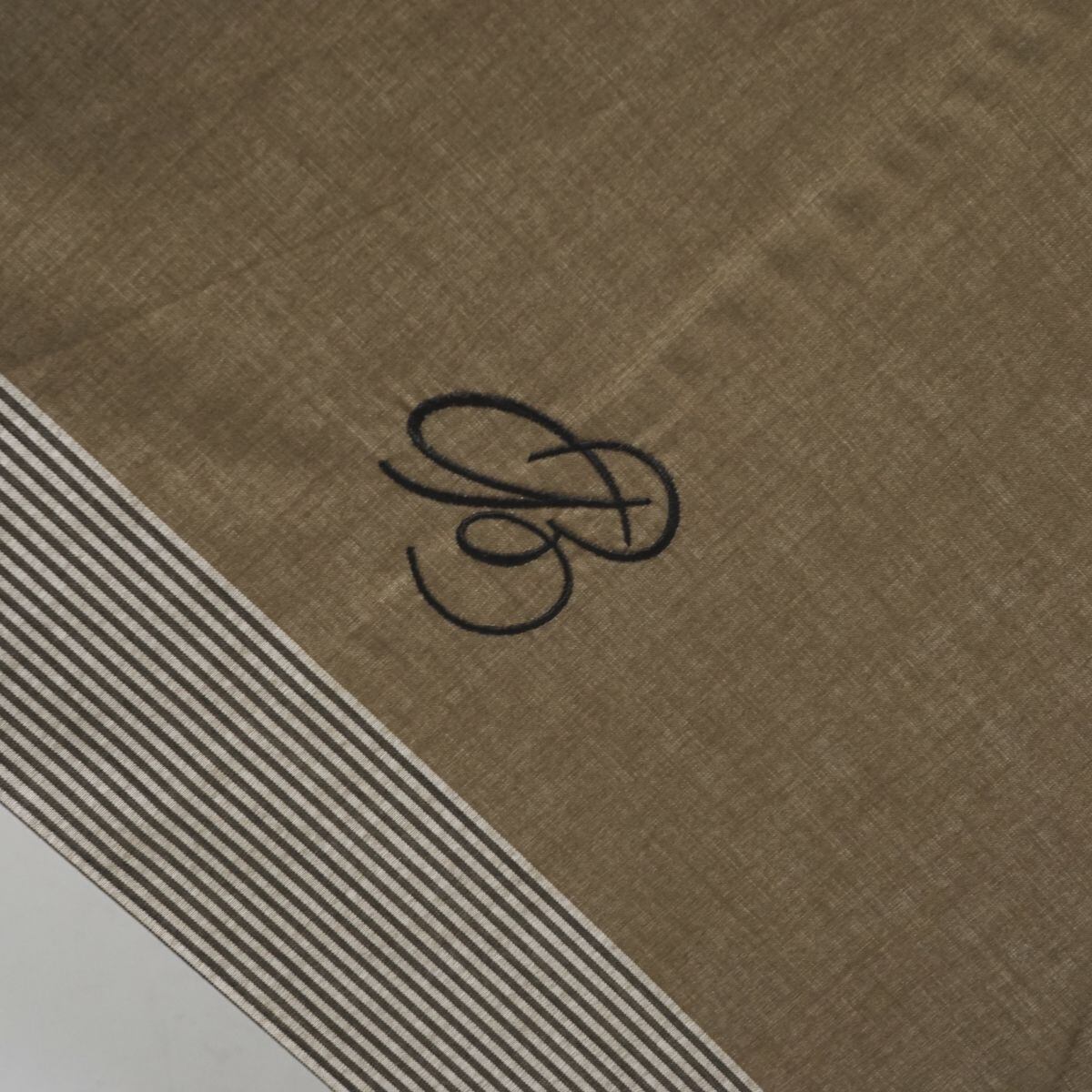 カーキ色の生地にボーダーの縁取りと一間に入ったロゴ刺繍がシンプルで、様々なコーディネートに合わせてお使いいただけます。