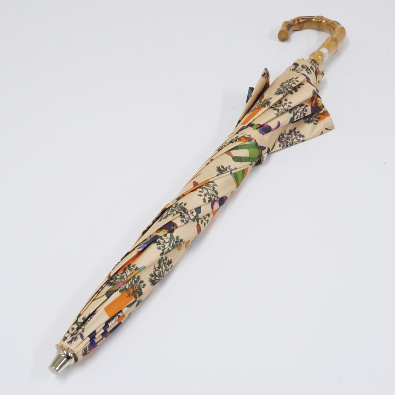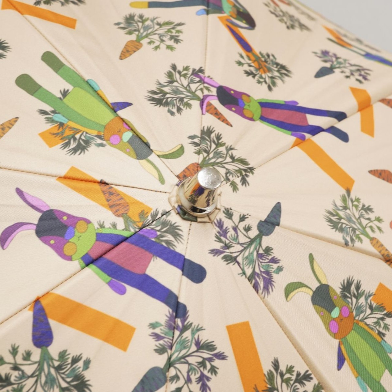 ライトオレンジの生地にうさぎなどの動物や人参のイラストをプリントした、個性的で可愛い傘です。