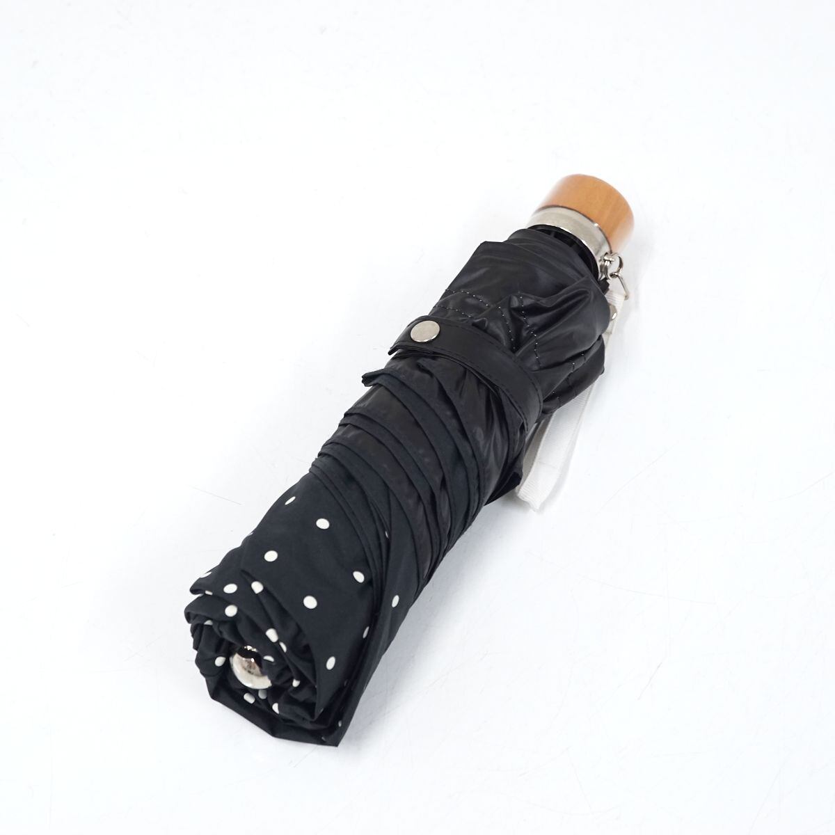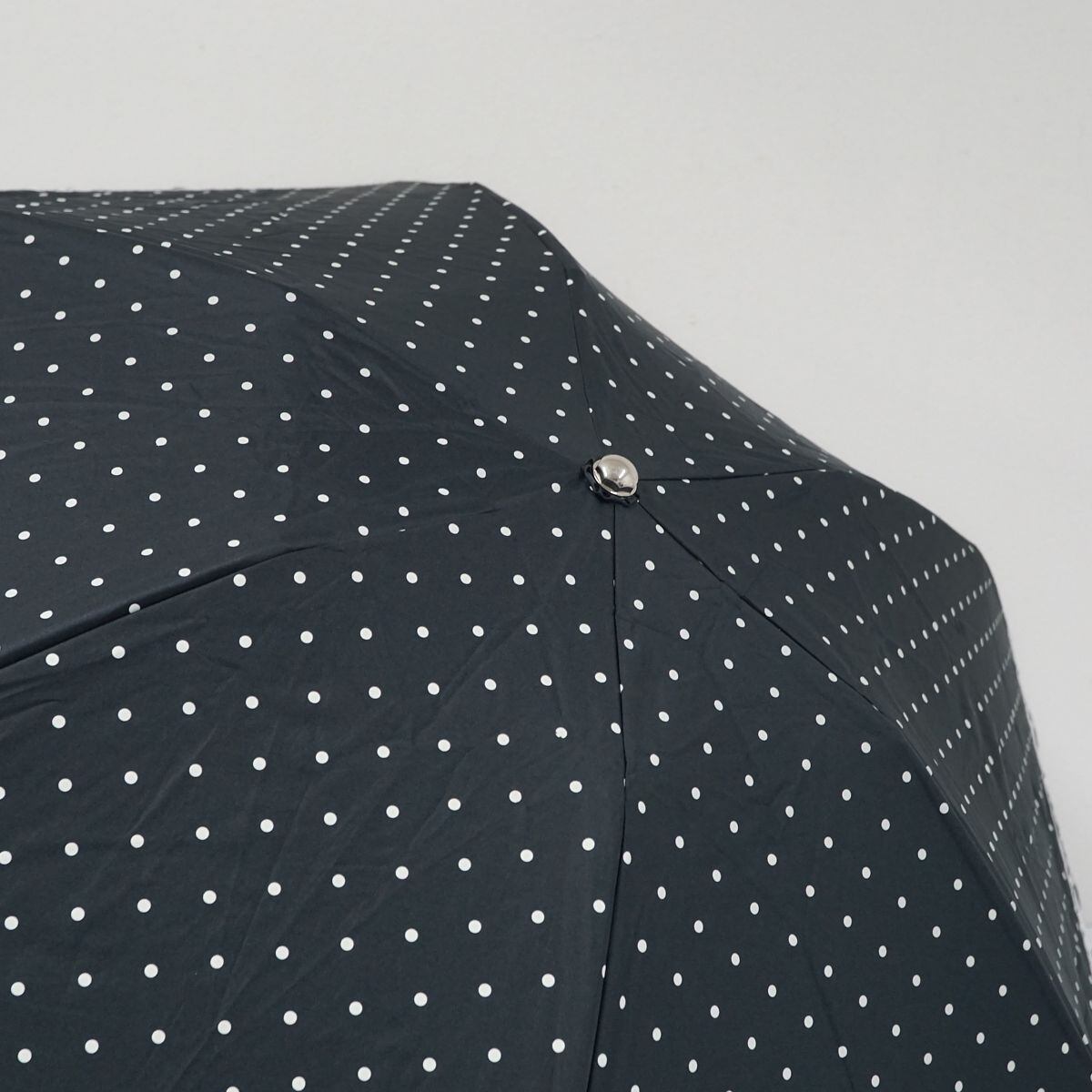 清楚なドット柄にボーターをトリミングした、クラシカルなデザインの折りたたみパラソルです。