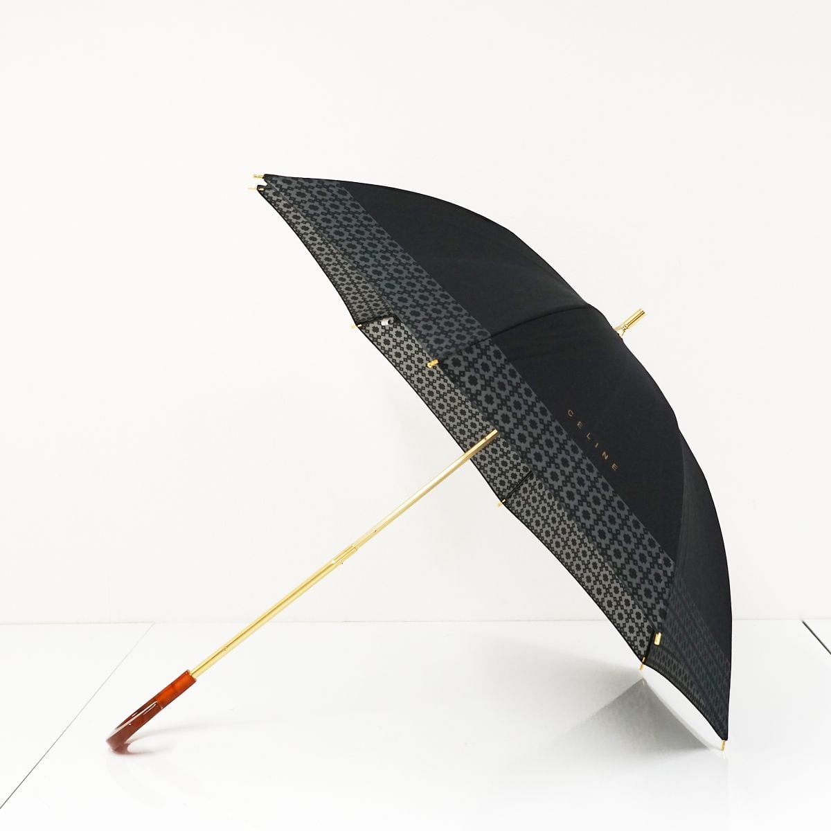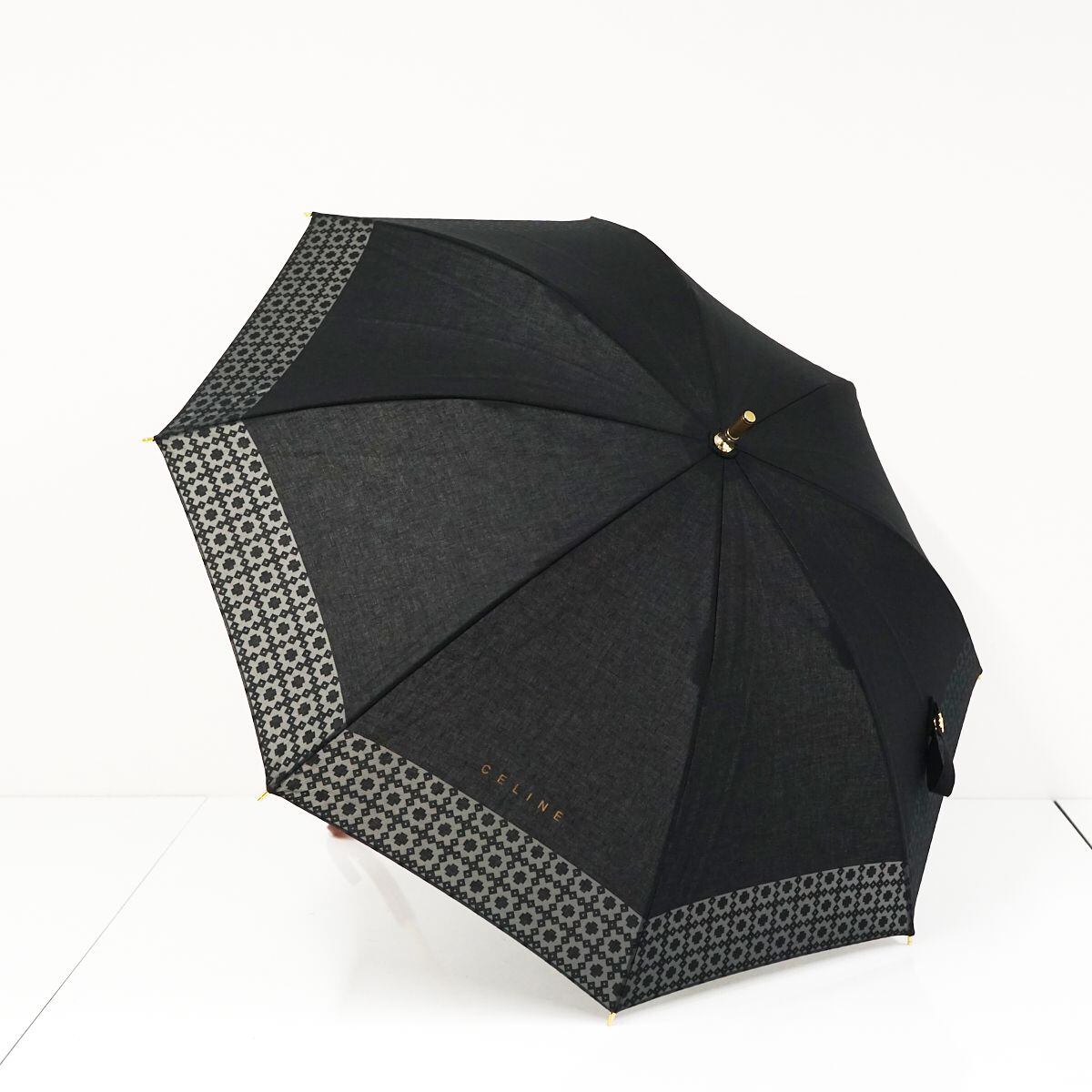 高級日傘 CELINE セリーヌ USED美品 ブラック ロゴプリント 裾デザイン エレガント シンプル グラス骨 47cm S1307