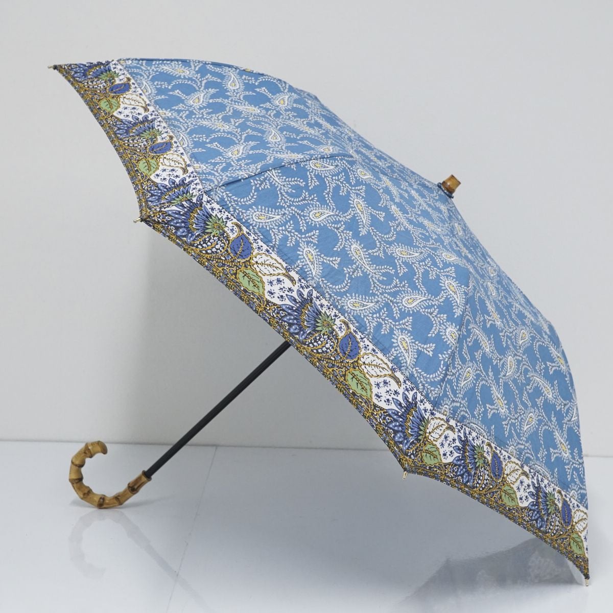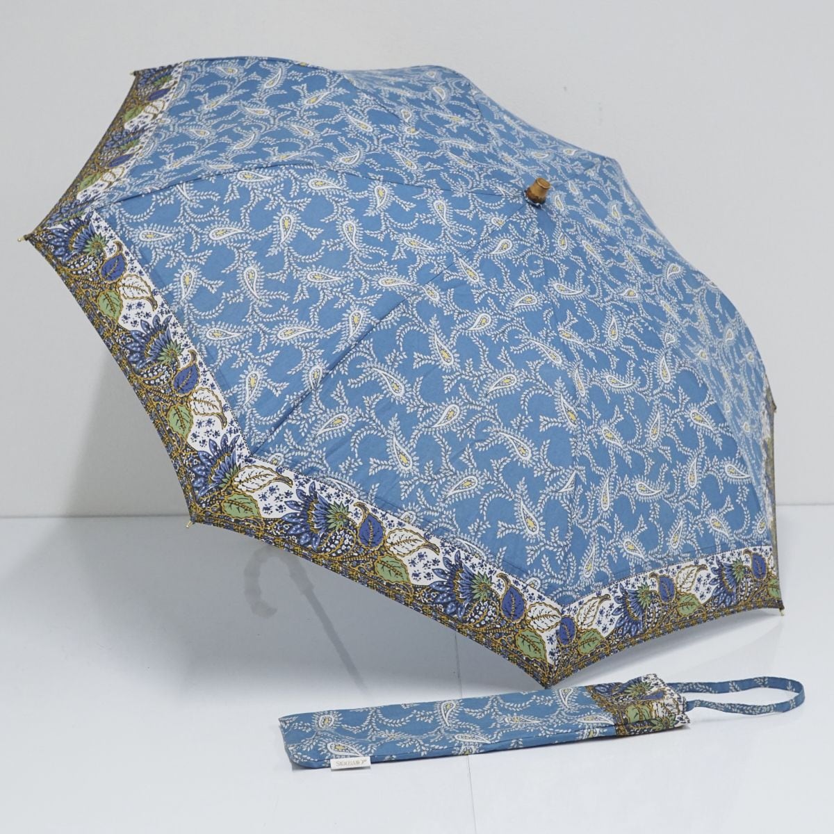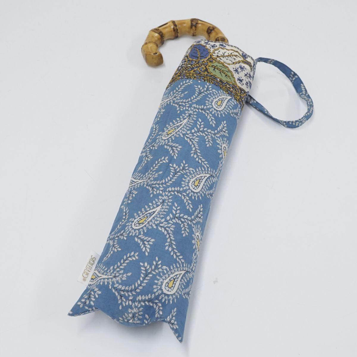 ヴィンテージ感のあるバンブーハンドルと、オリジナルプリントを使用した魅力たっぷりの折りたたみパラソルです。