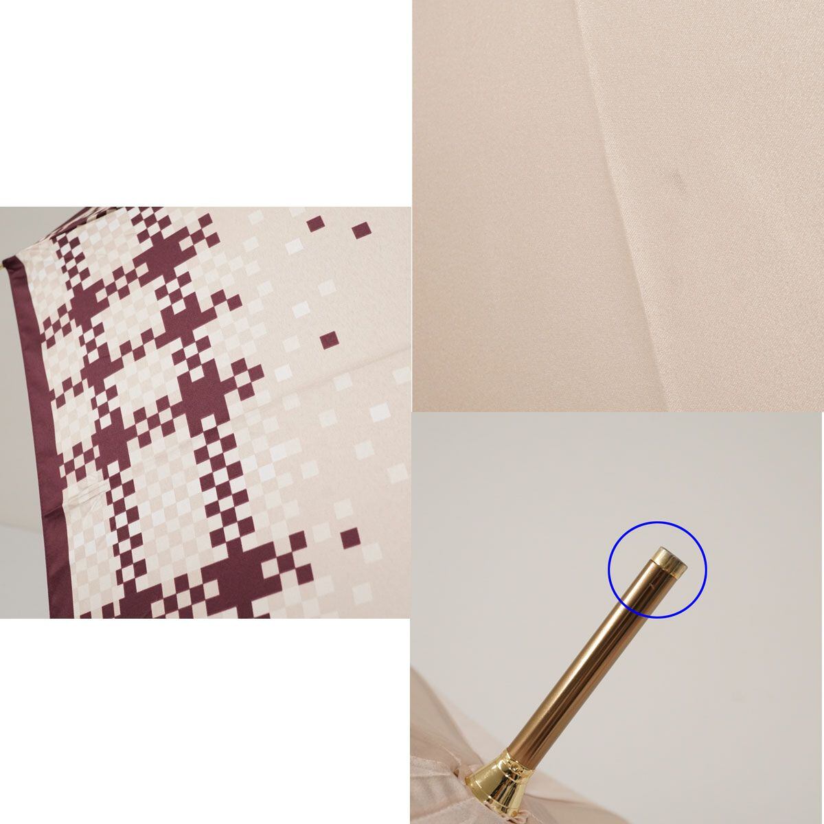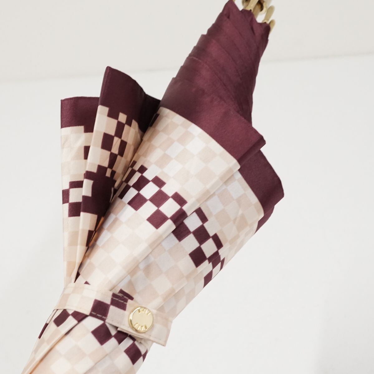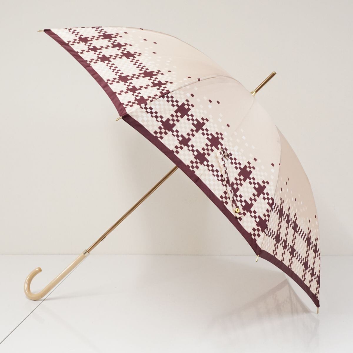 光沢のあるピンクの生地をベースに、同系色のチェックパターンをプリントしたデザインの傘です。