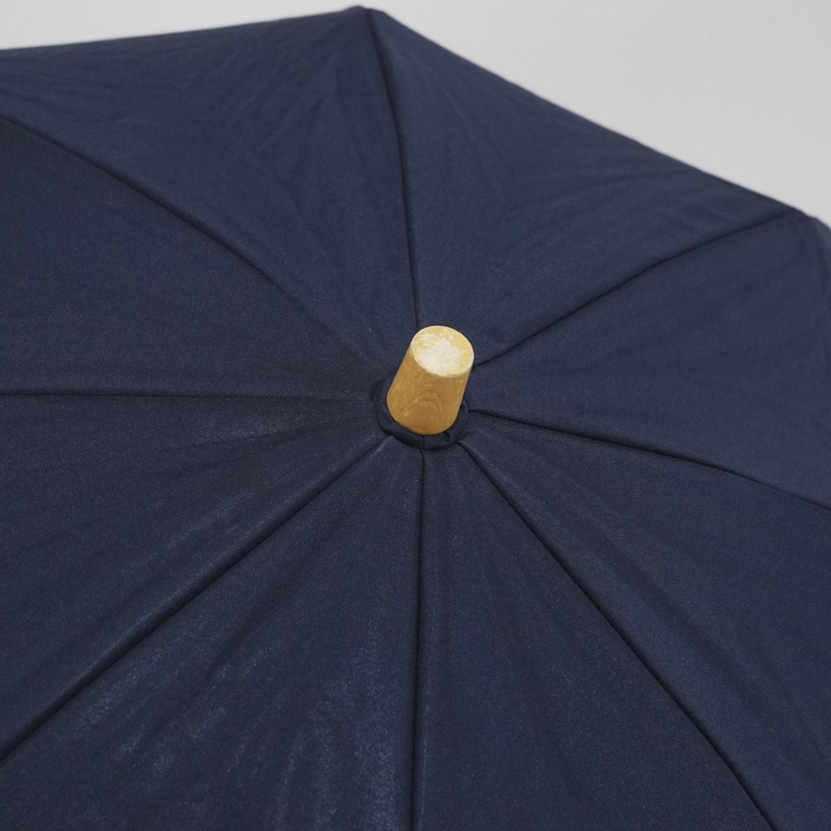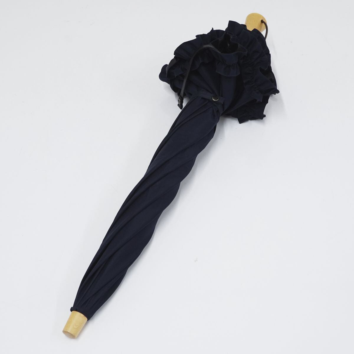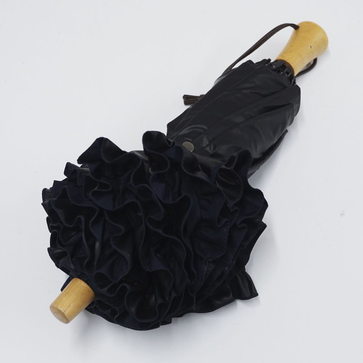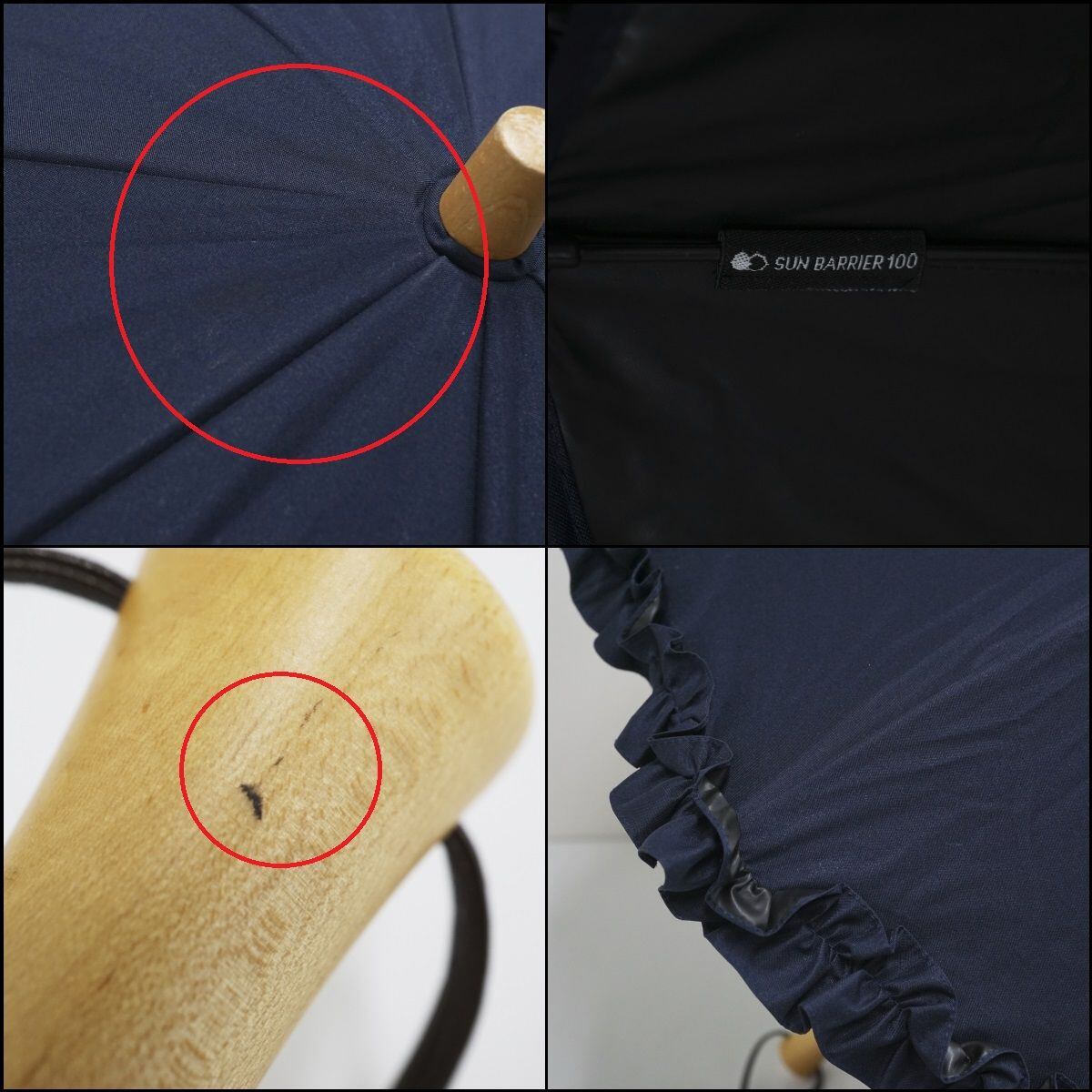 日傘 サンバリア100 完全遮光折日傘 USED美品 2段折 フリル ネイビー 紺 木製手元 UV 遮光 遮熱 折りたたみ傘 50cm FS8629